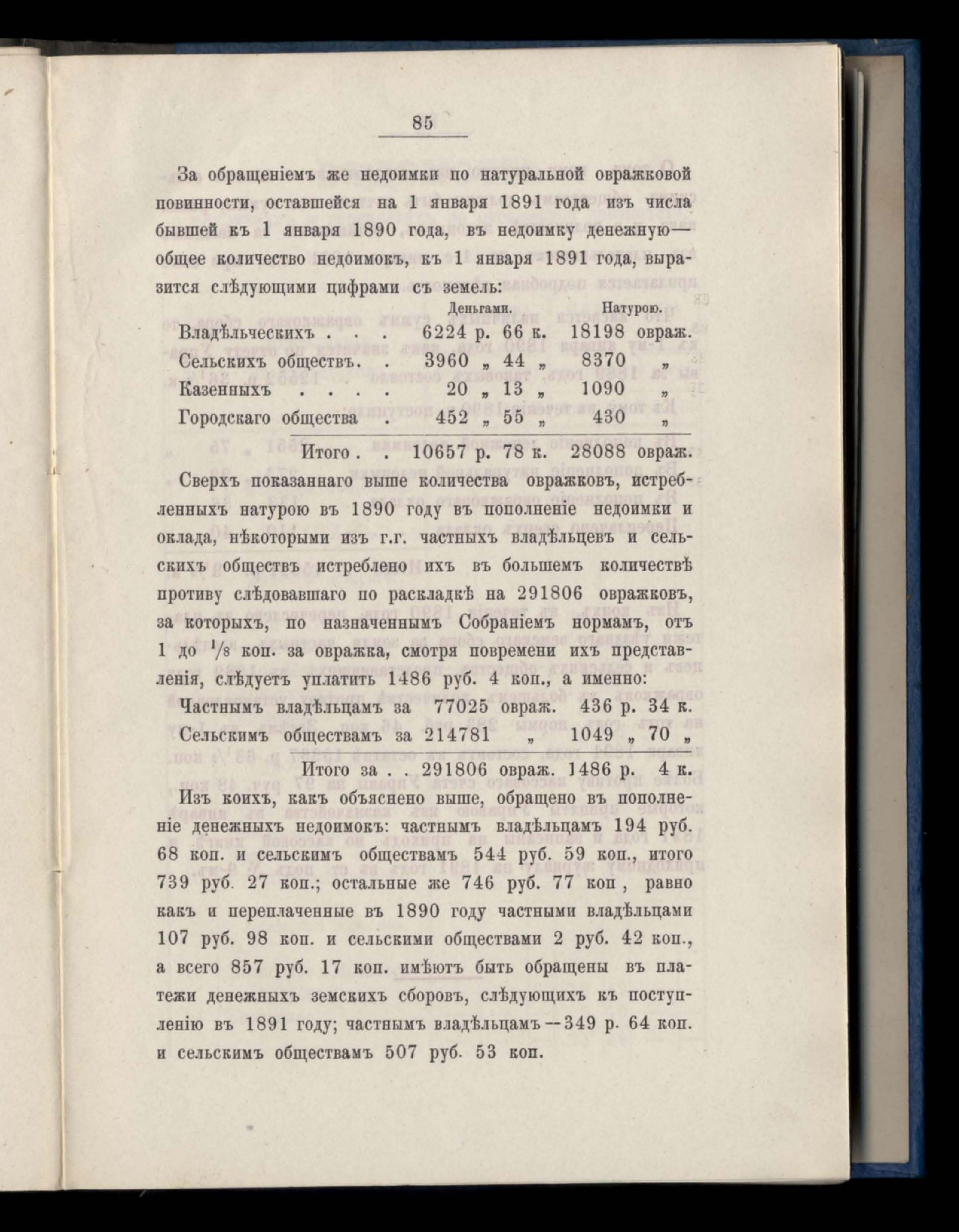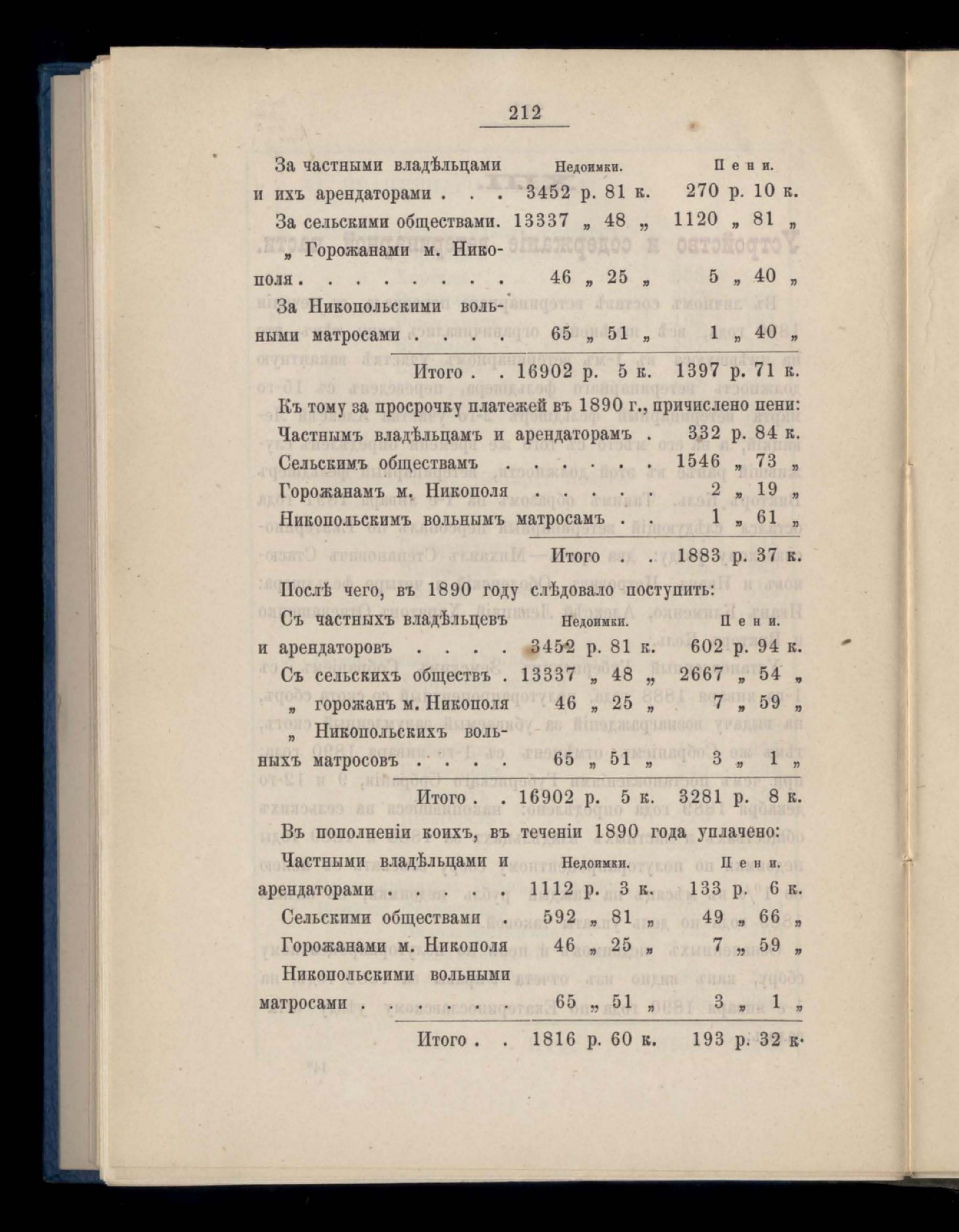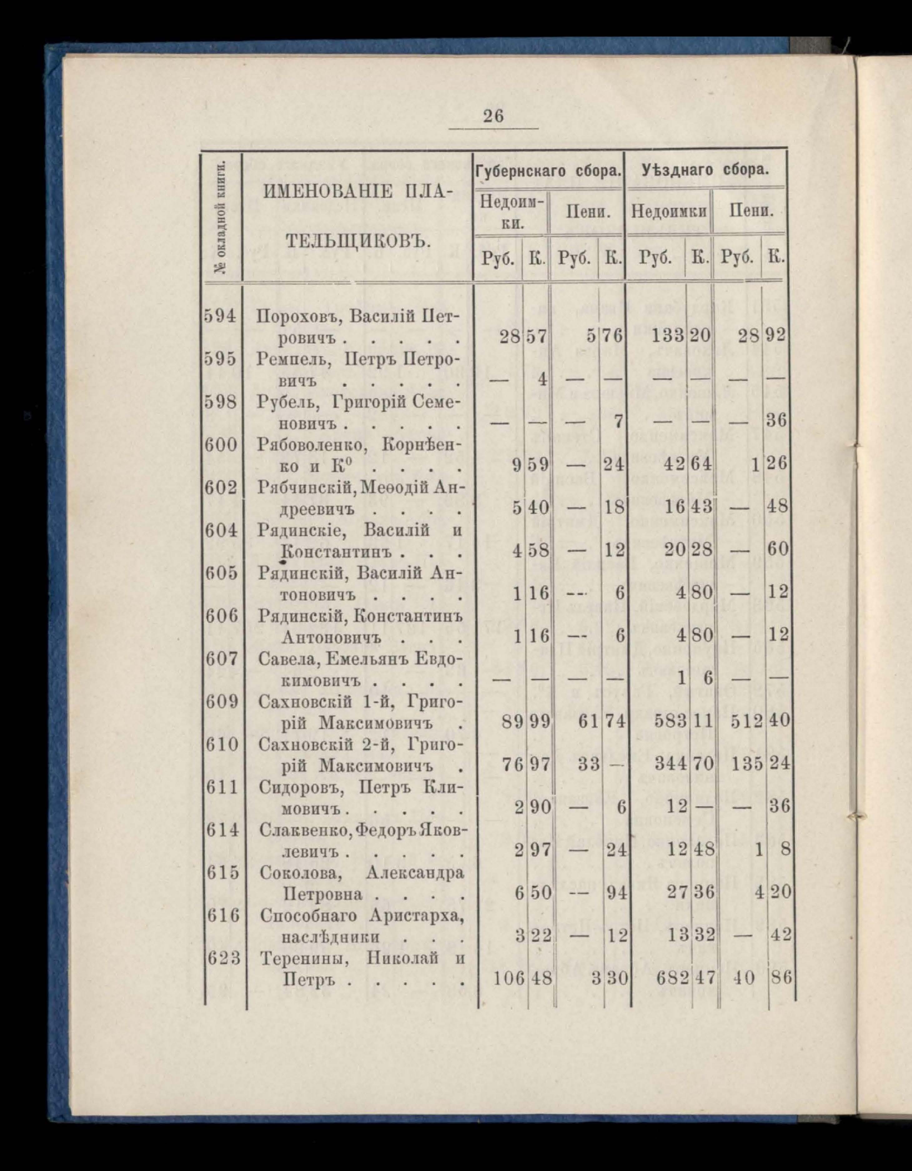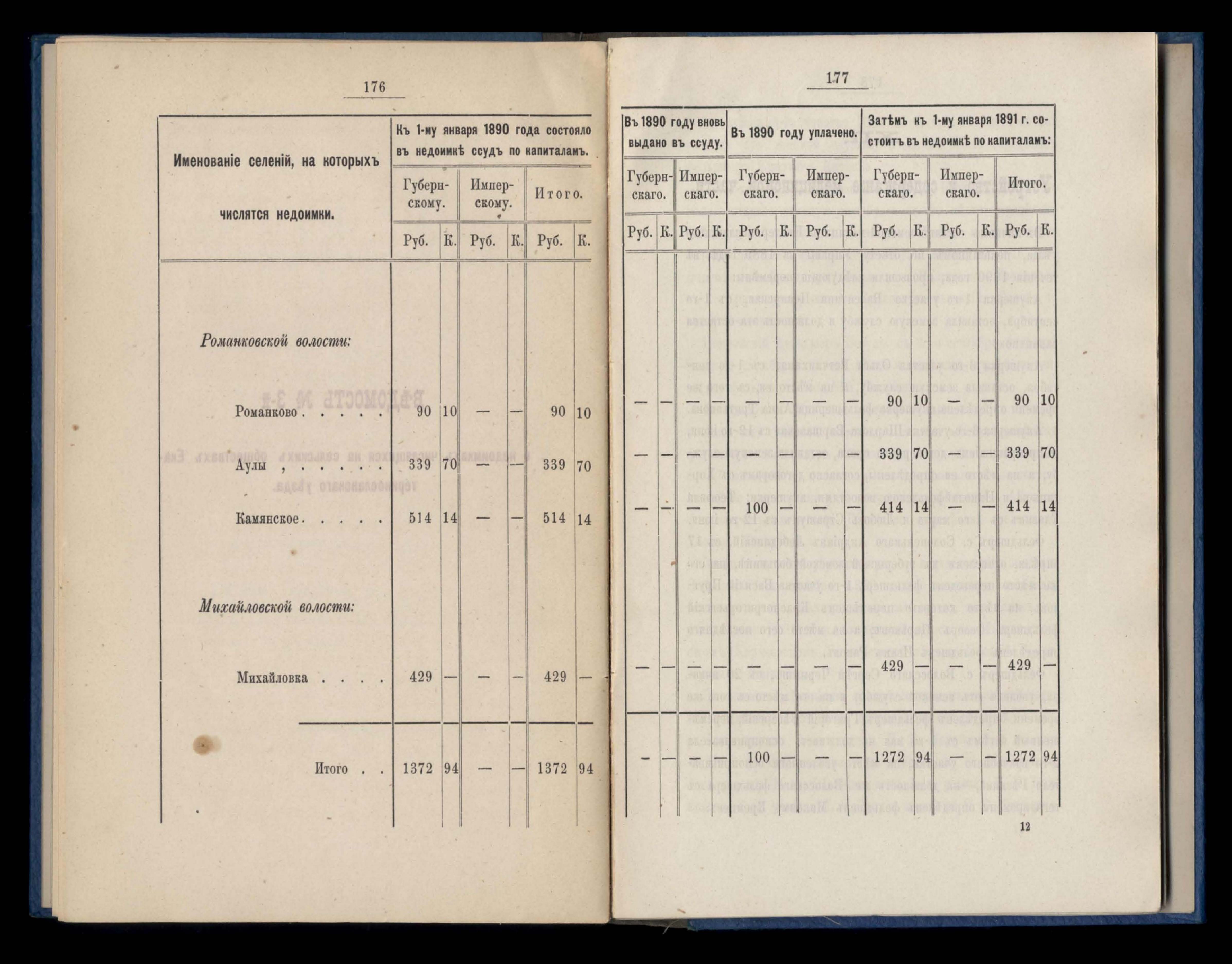 Въдомостъ о недоимкахъ и пеняхъ по губернскому и уъздному земскимъ сборамъ, уплаченныхъ въ первой половинъ 1891 года