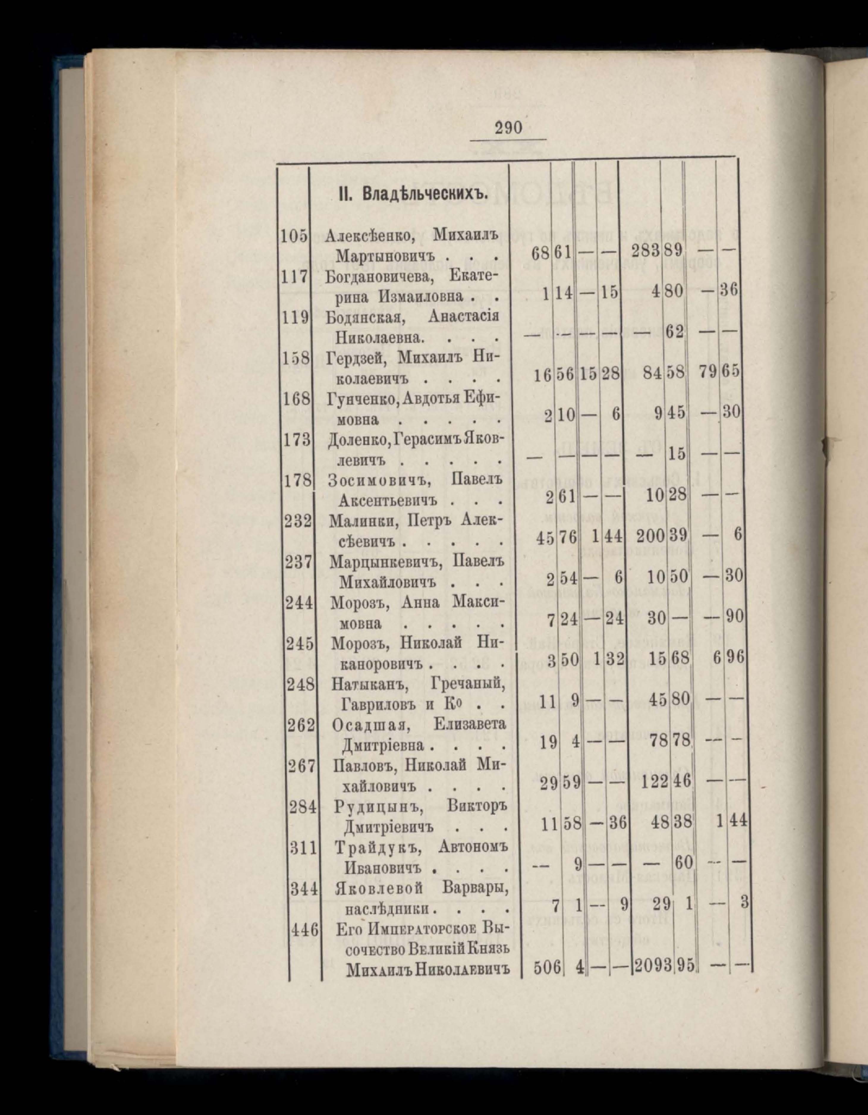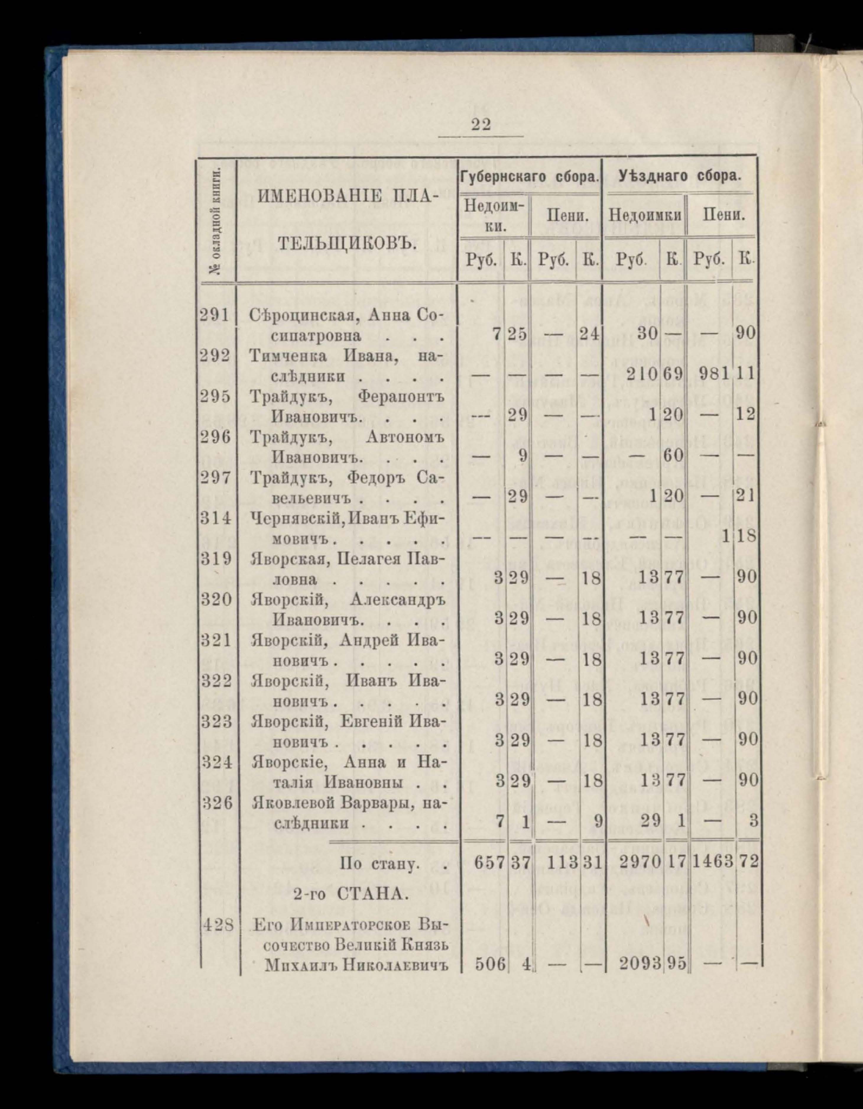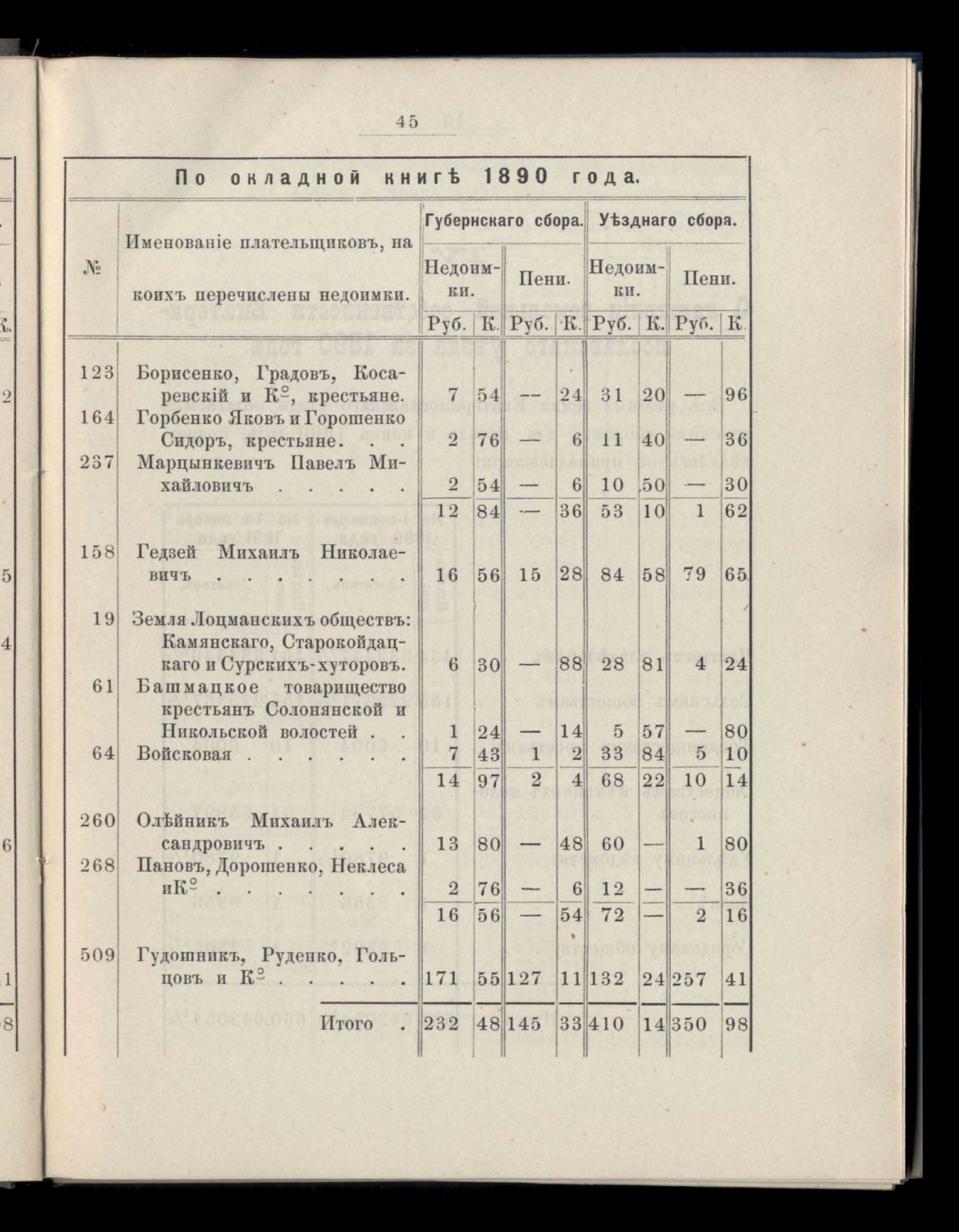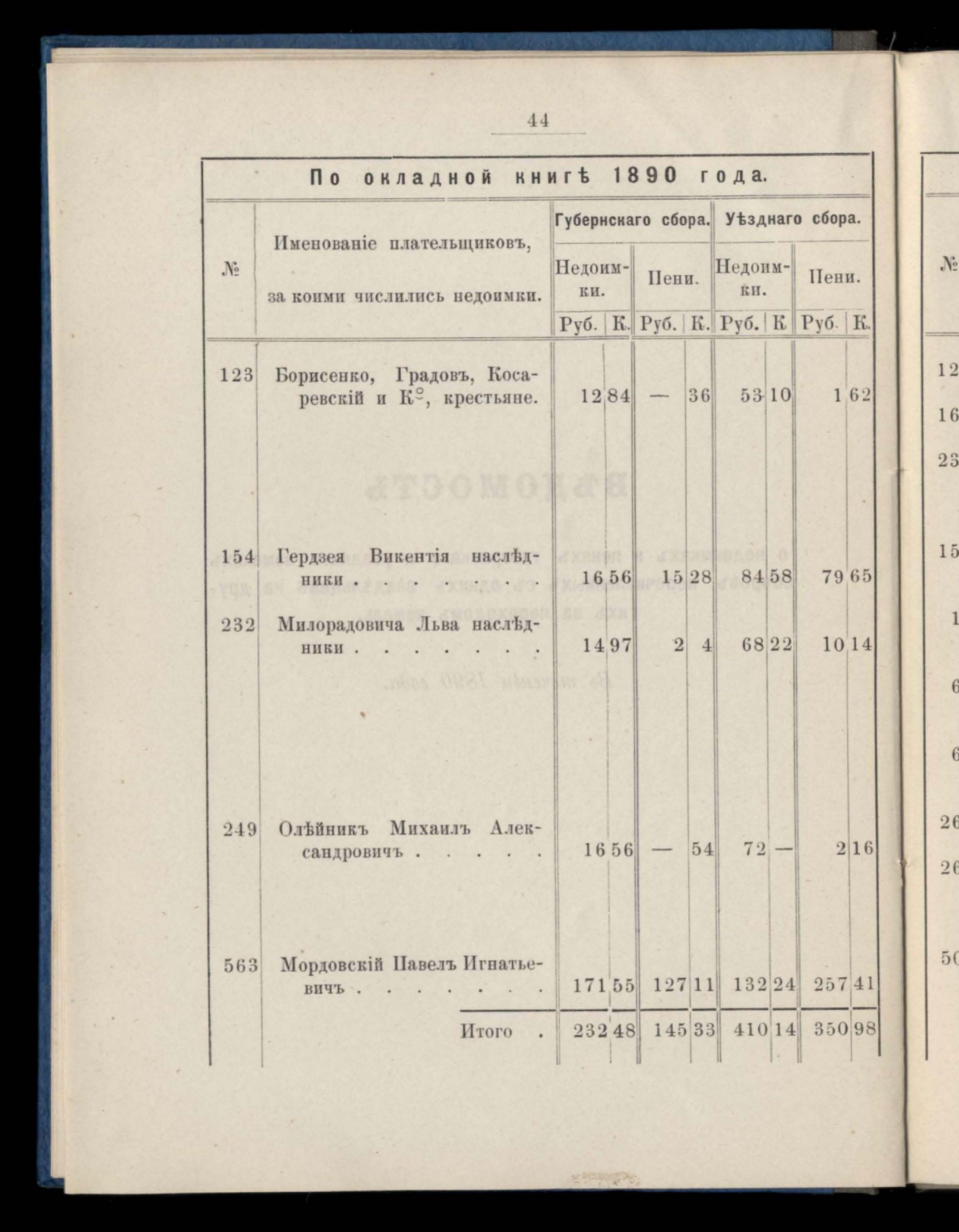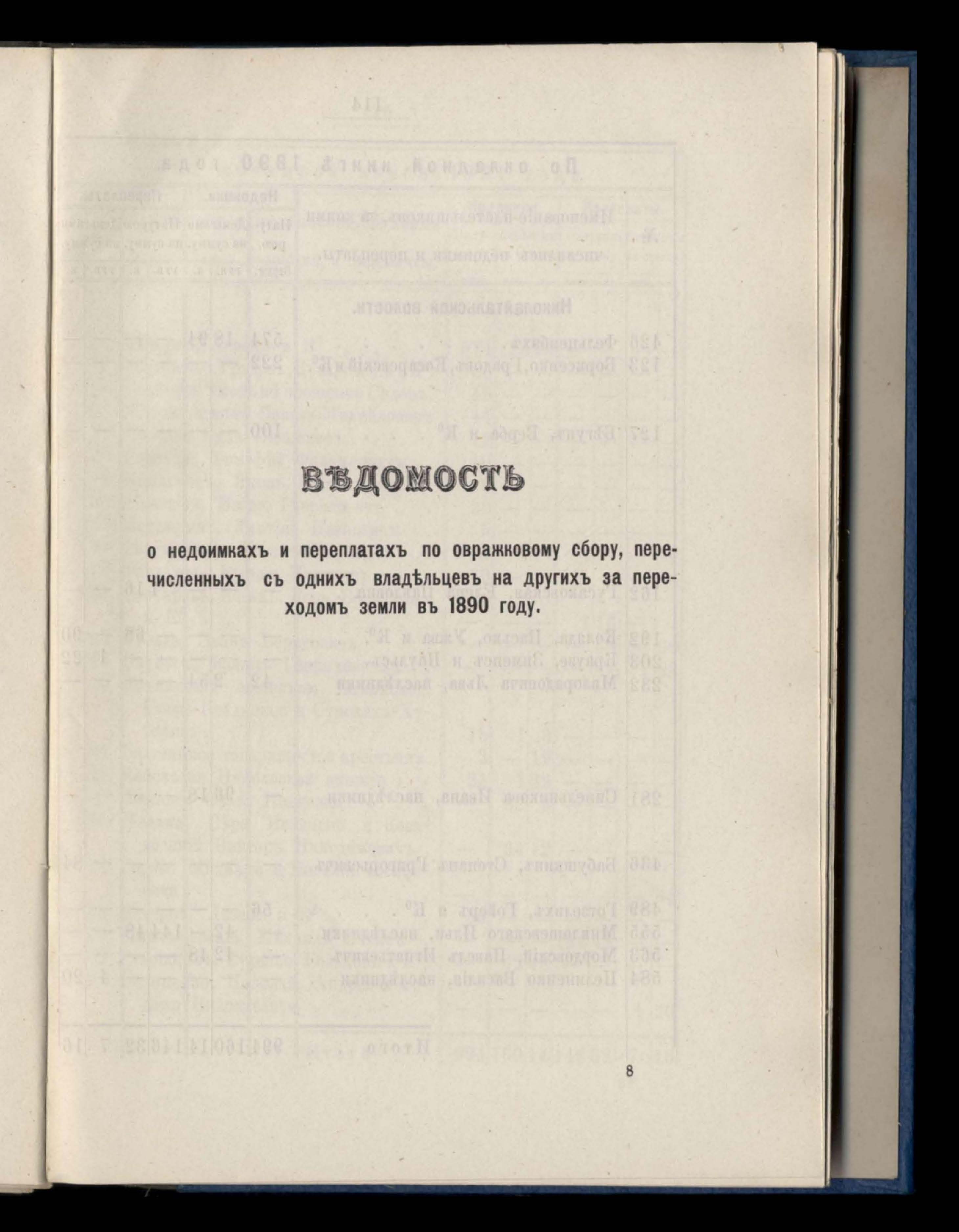 Въдомостъ о недоимкахъ и пеняхъ губернскаго и уъзднаго земскихъ сборовъ, перечисленныхъ съ однихъ владъльцевъ на другихъ за переходомъ земель. Въ теченіи 1890 года