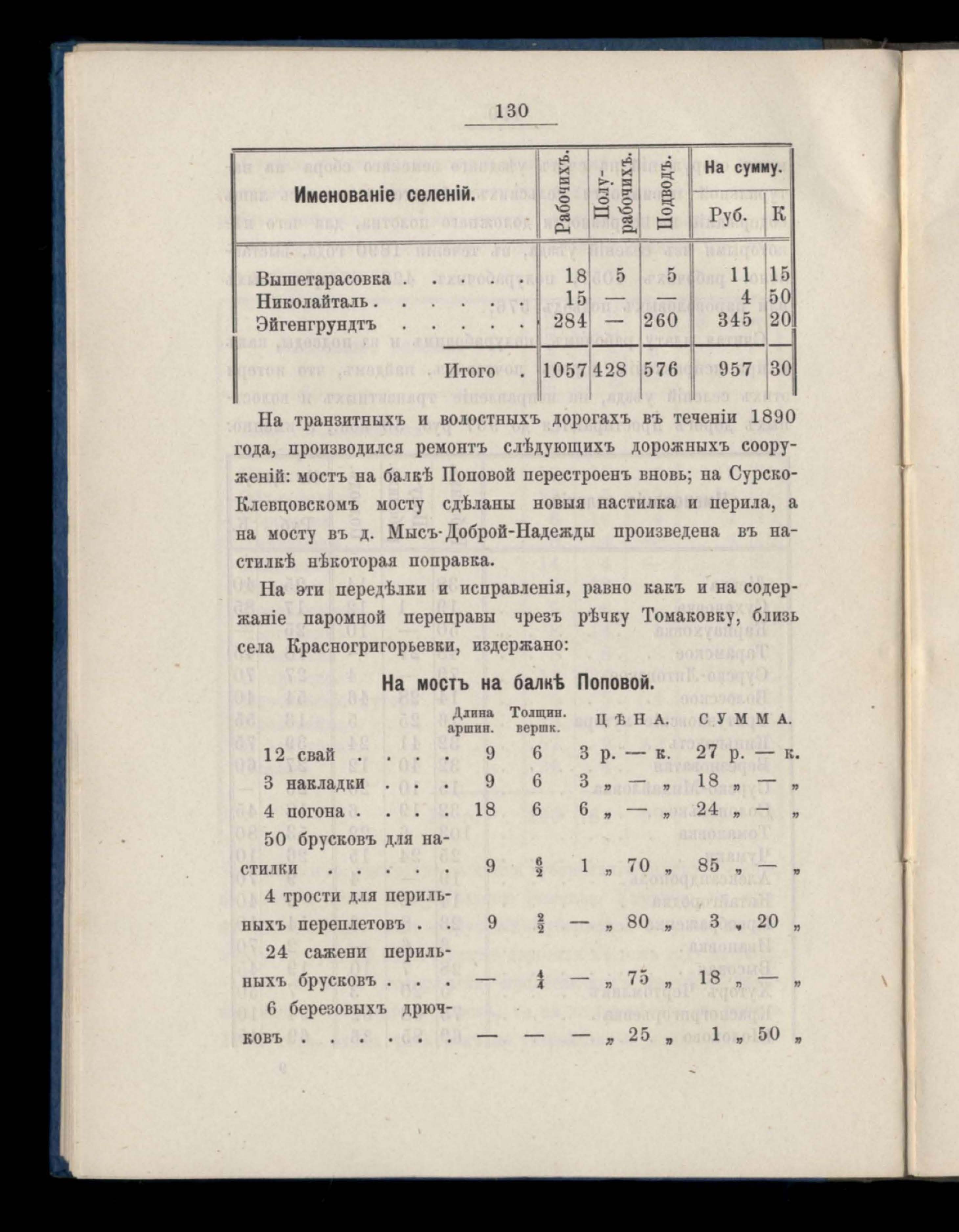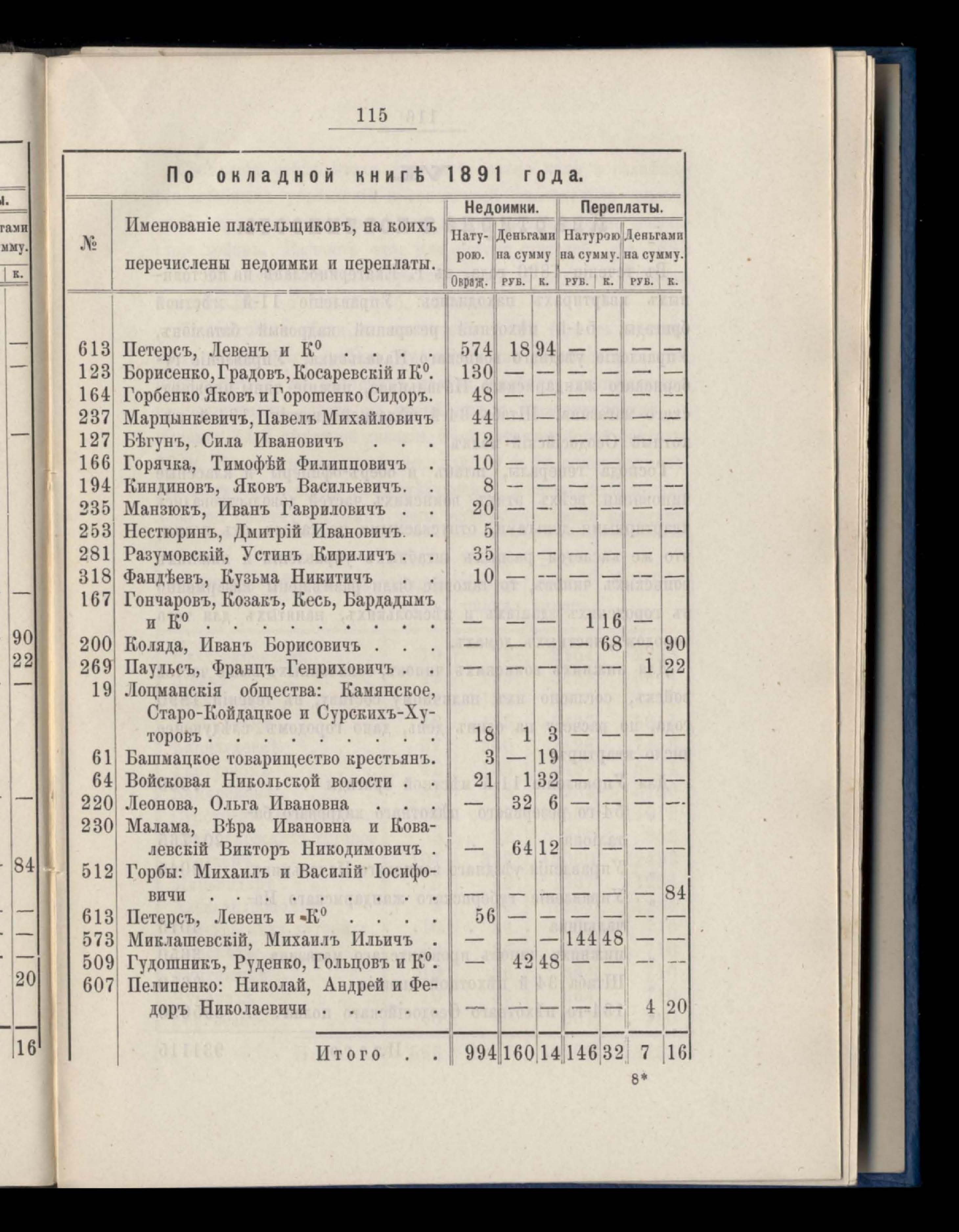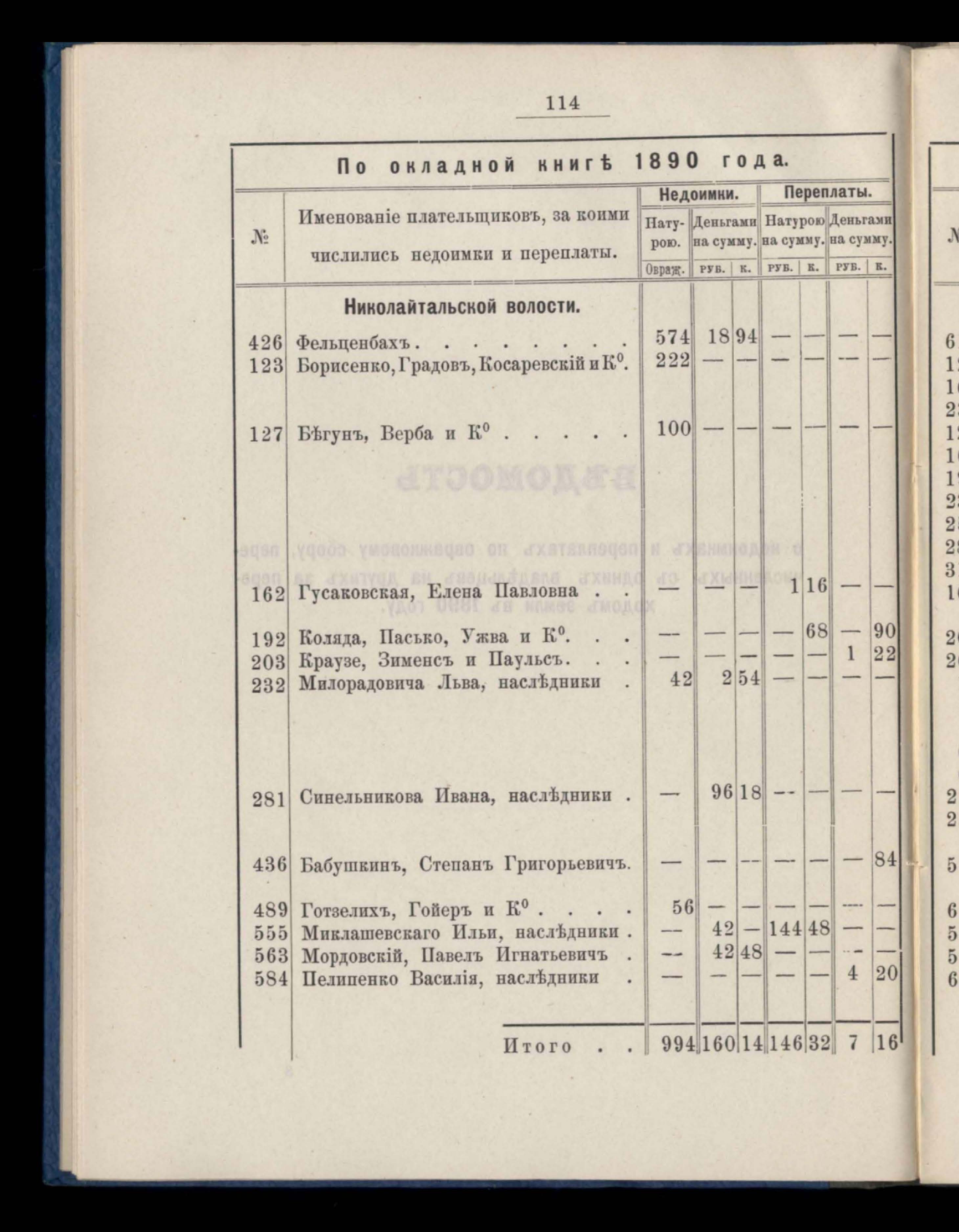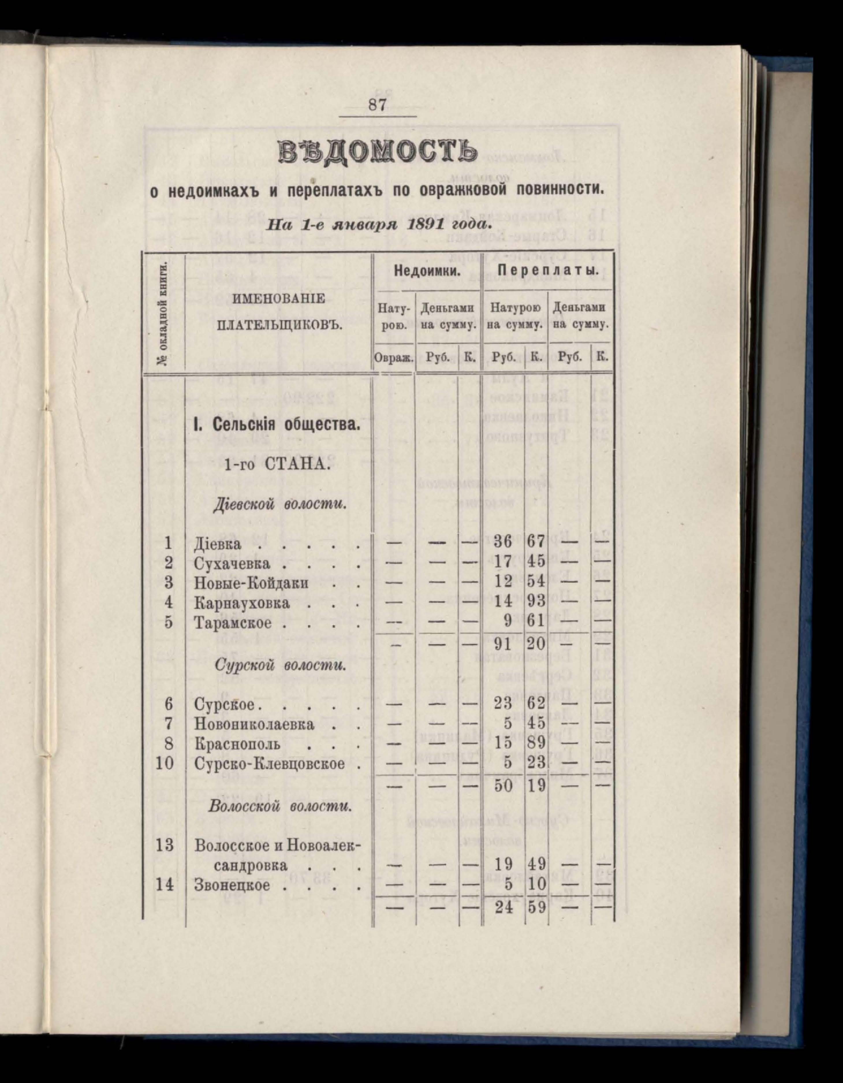 Въдомостъ о недоимкахъ и переплатахъ по овражковой повинности. На 1-е января 1891 года