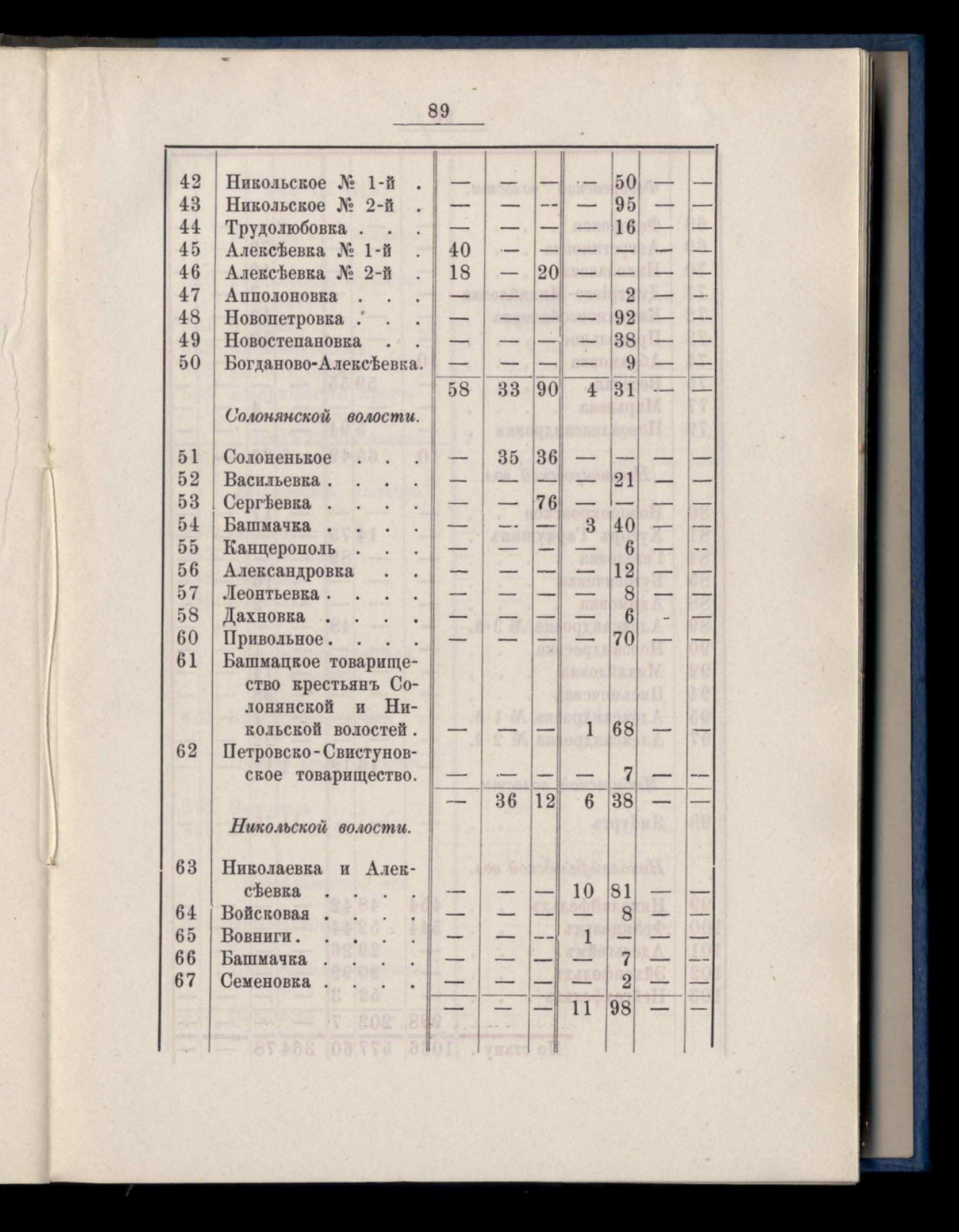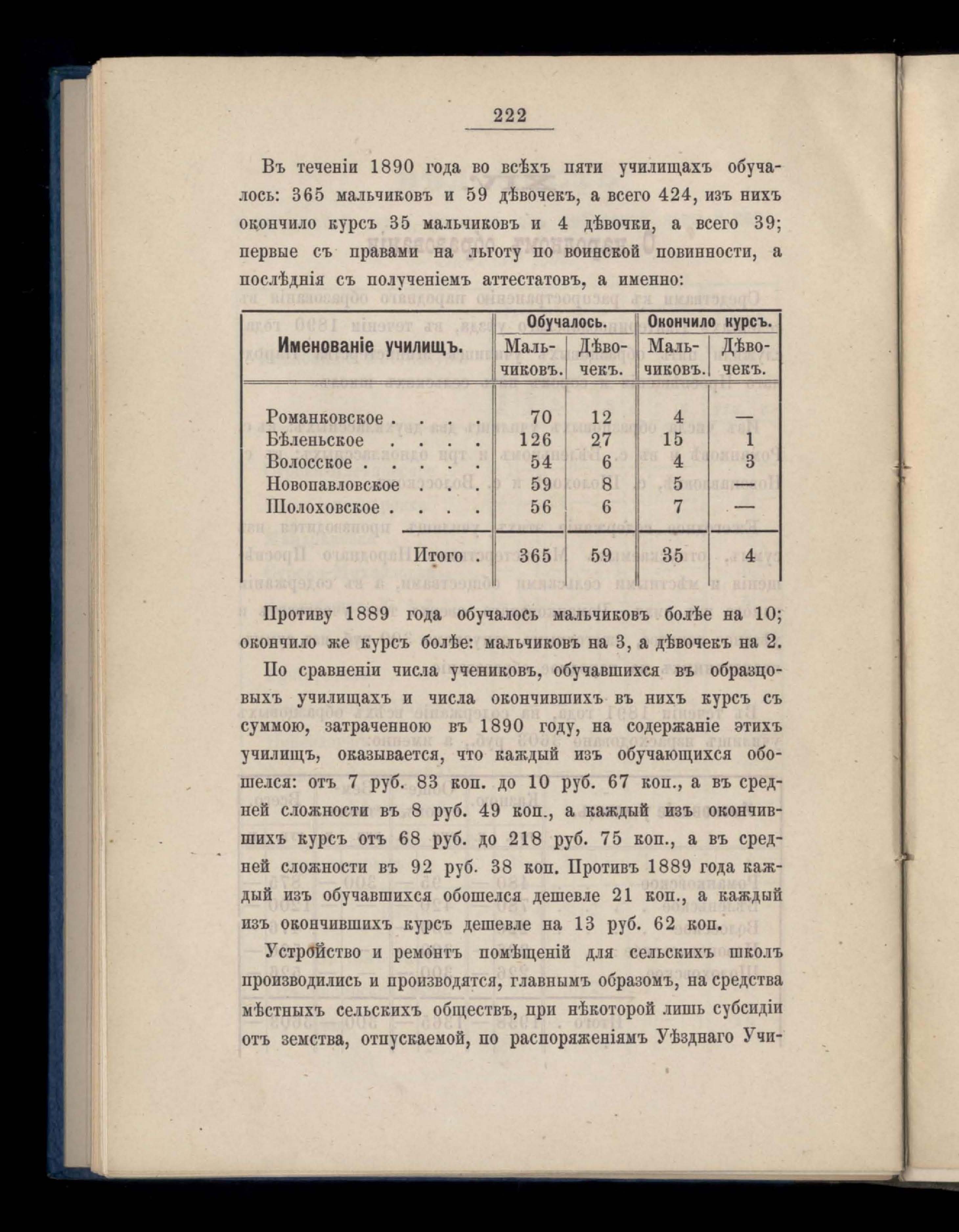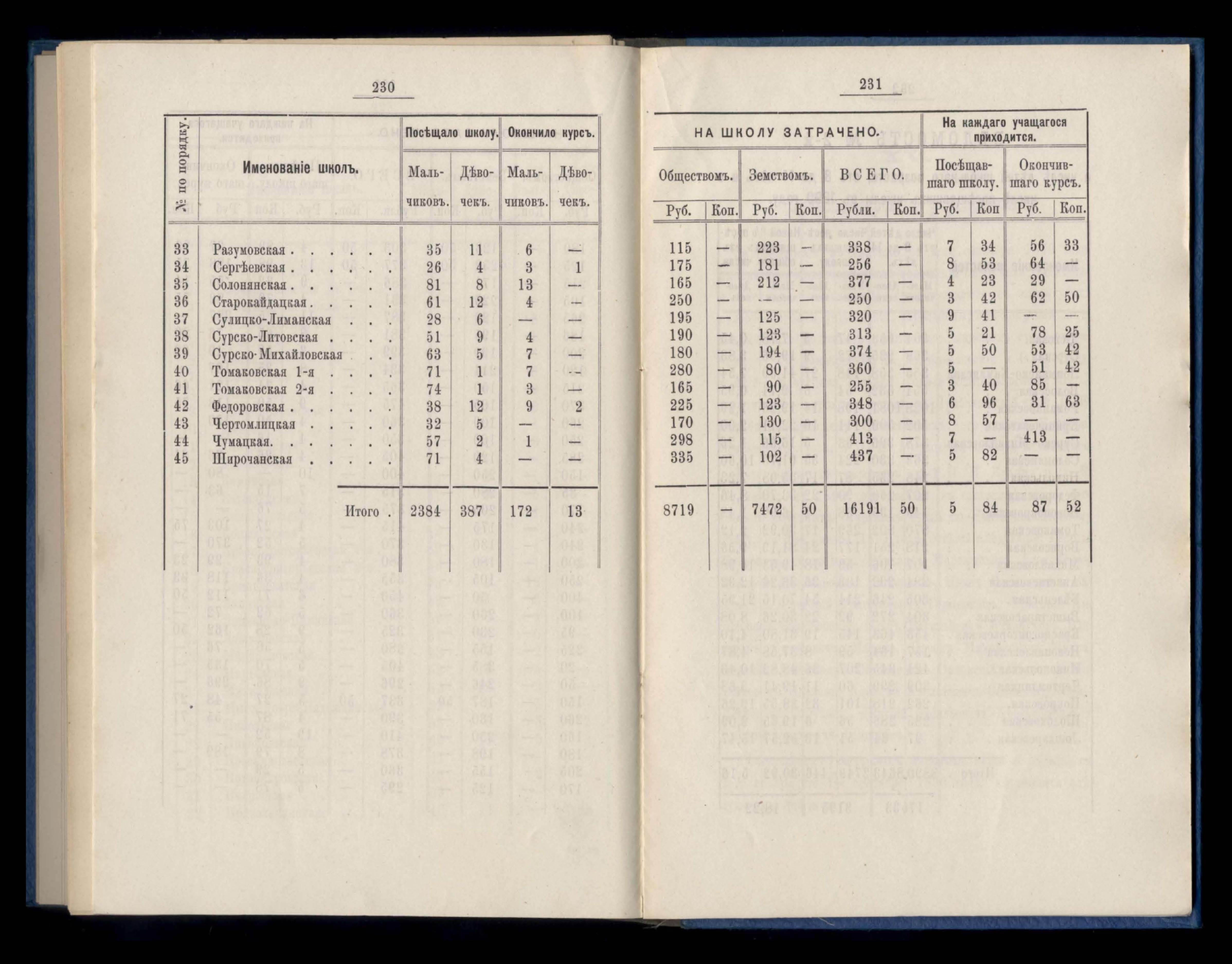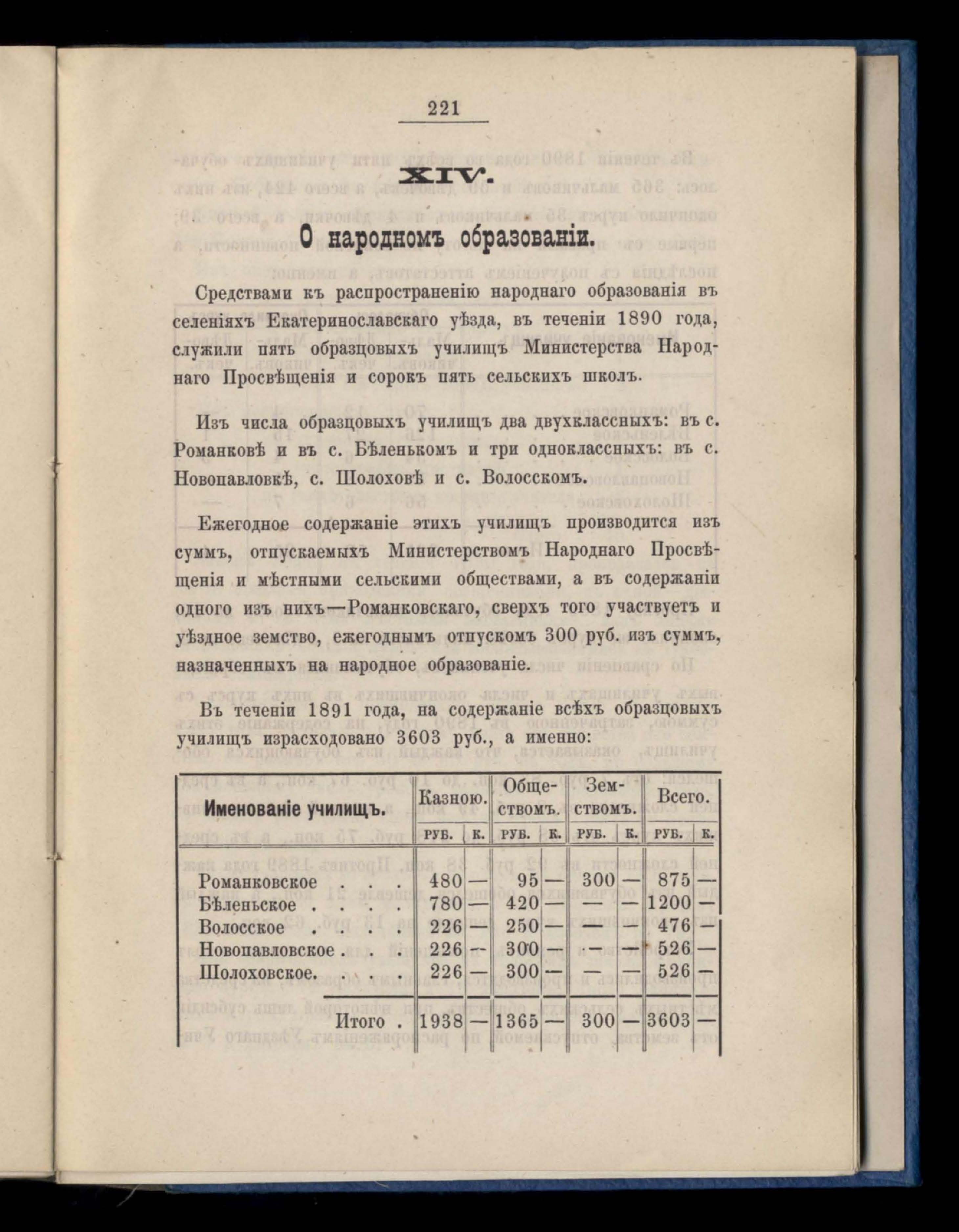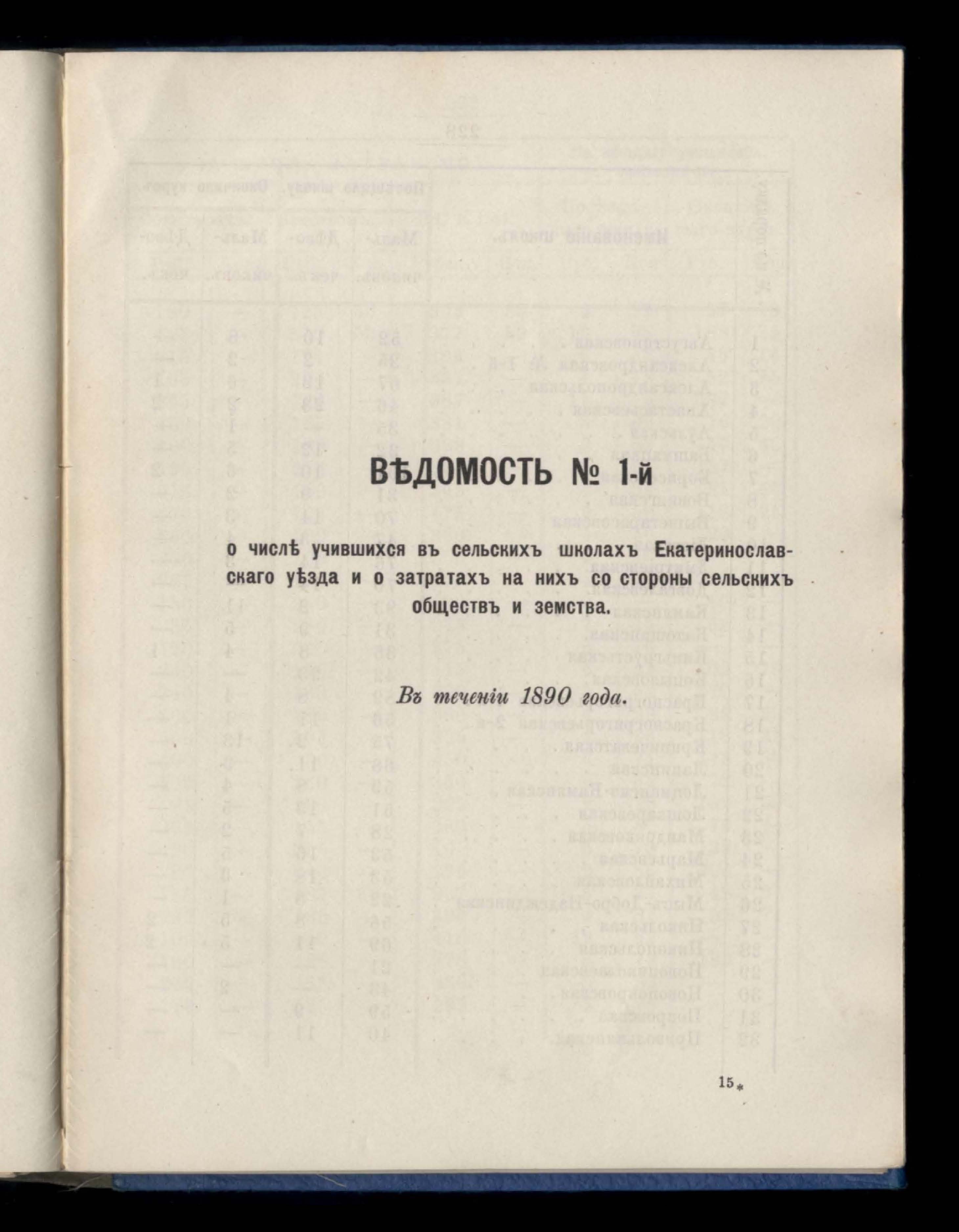 Въдомостъ № 1-й о числъ учащихся въ сельскихъ школахъ Екатеринославскаго уъзда и о затратахъ на нихъ со стороны сельскихъ обществъ и земства въ теченіи 1890 года