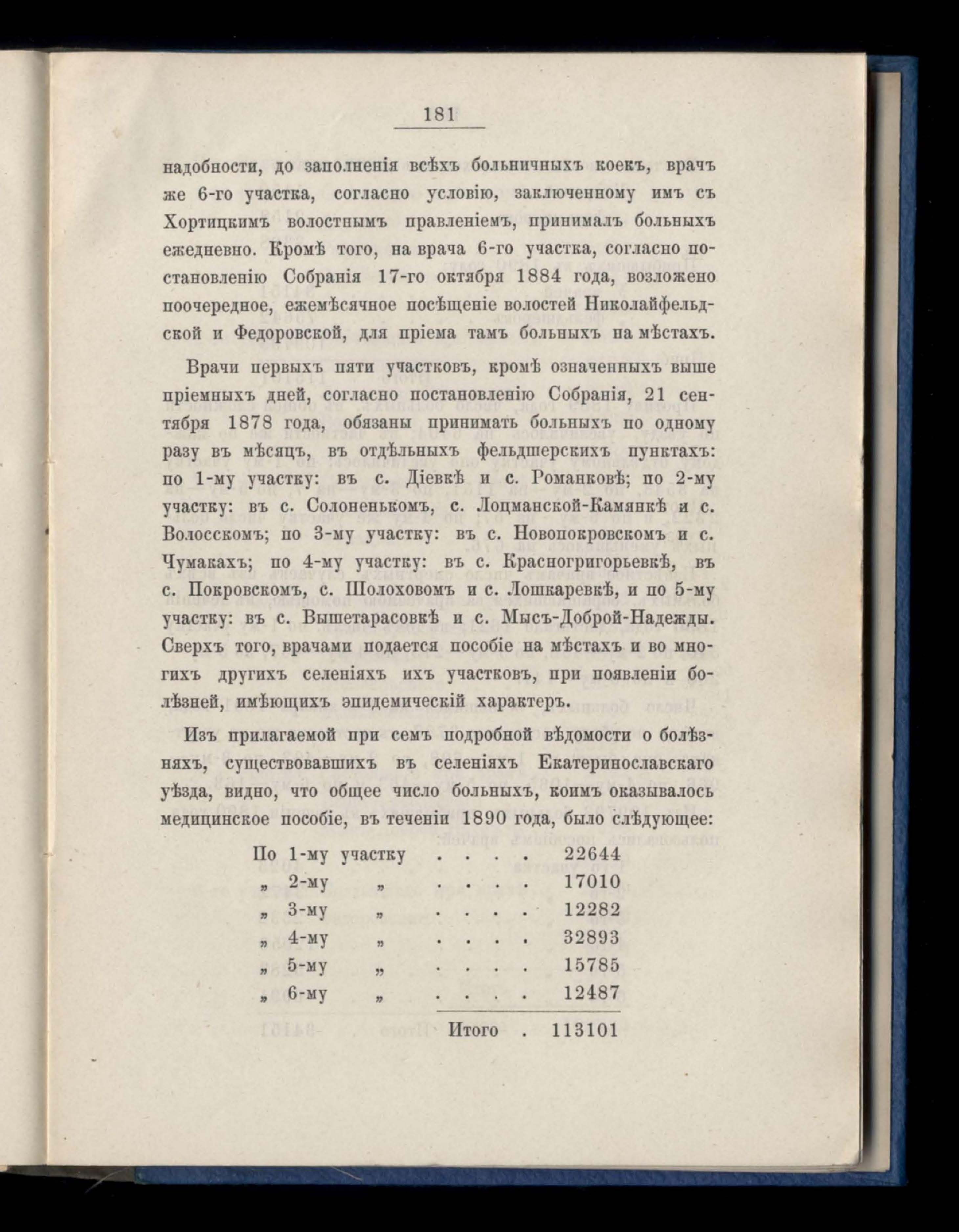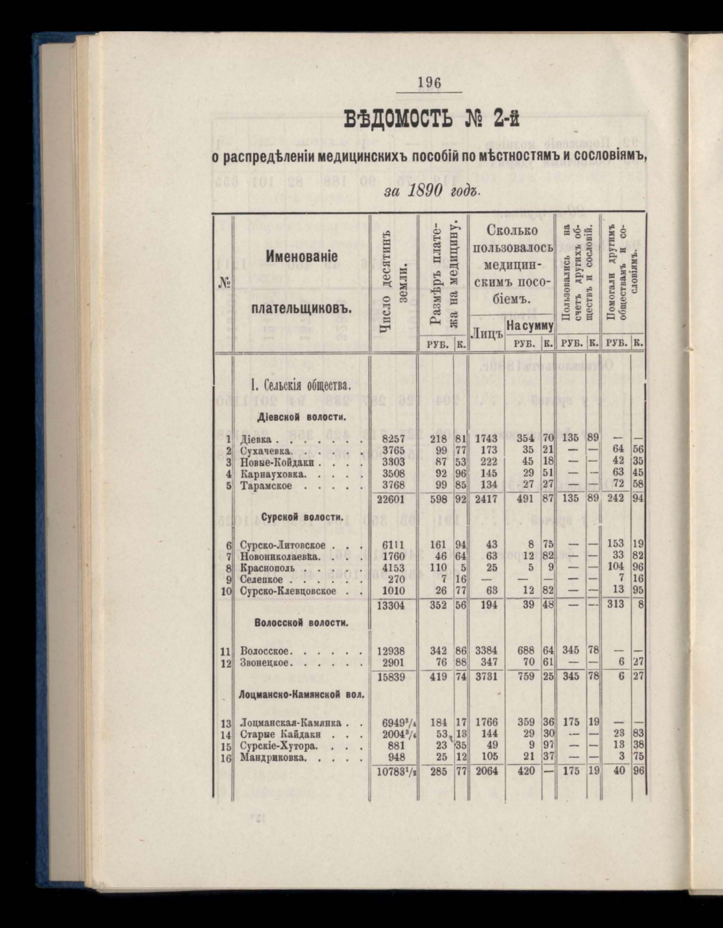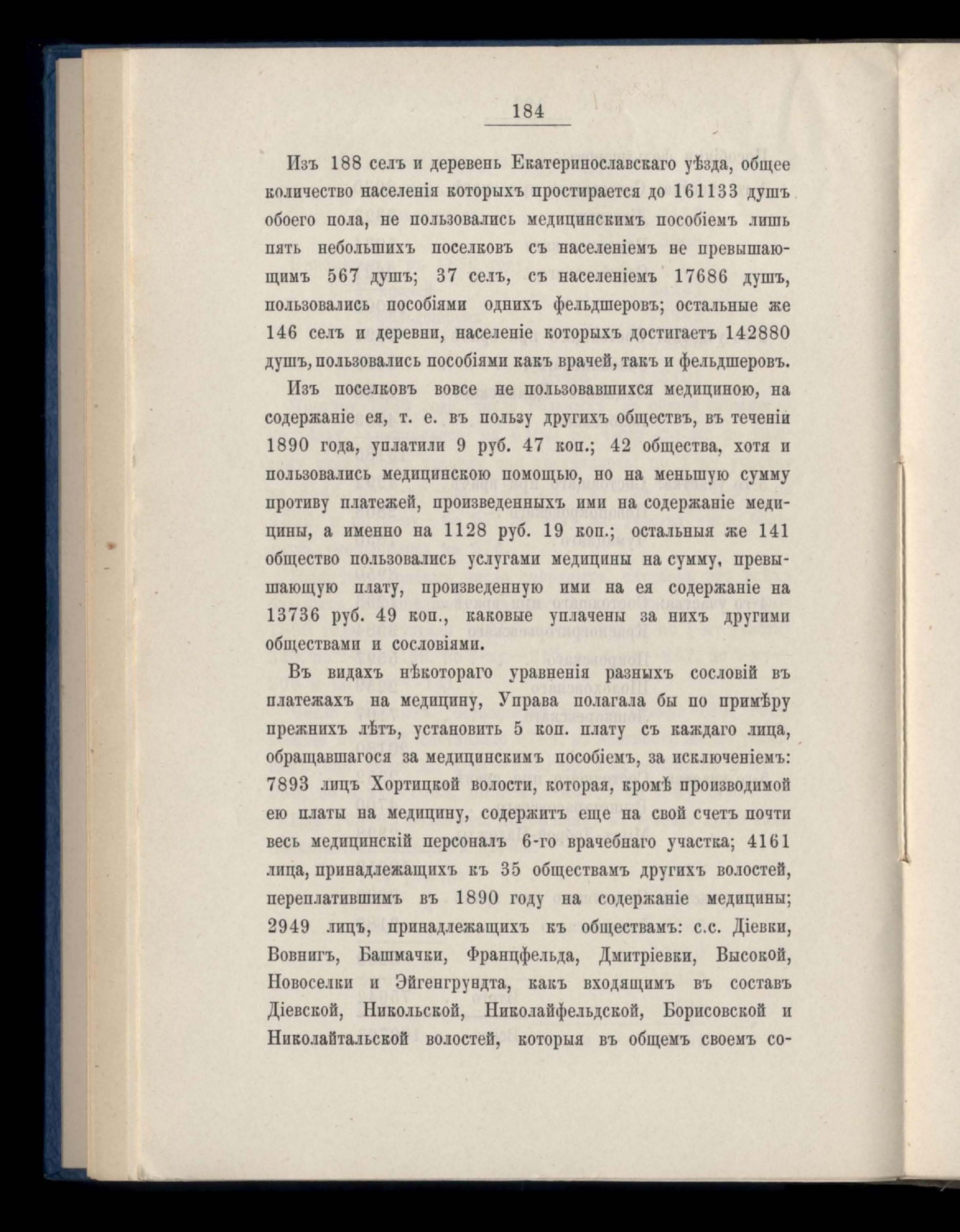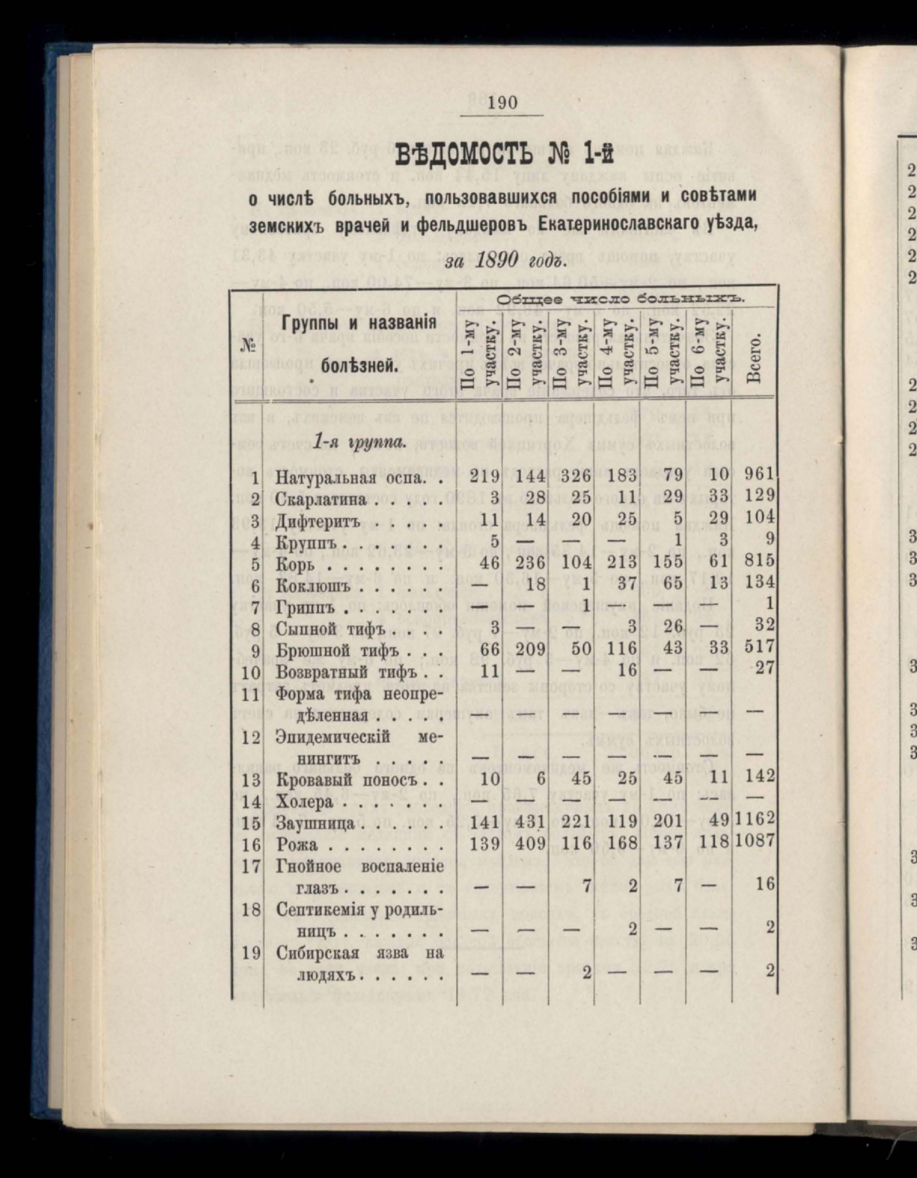 Въдомостъ № 1-й о числъ больныхъ, пользовавшихся пособіями и совътами земскихъ врачей и фельдшеровъ Екатеринославскаго уъзда за 1890 годъ