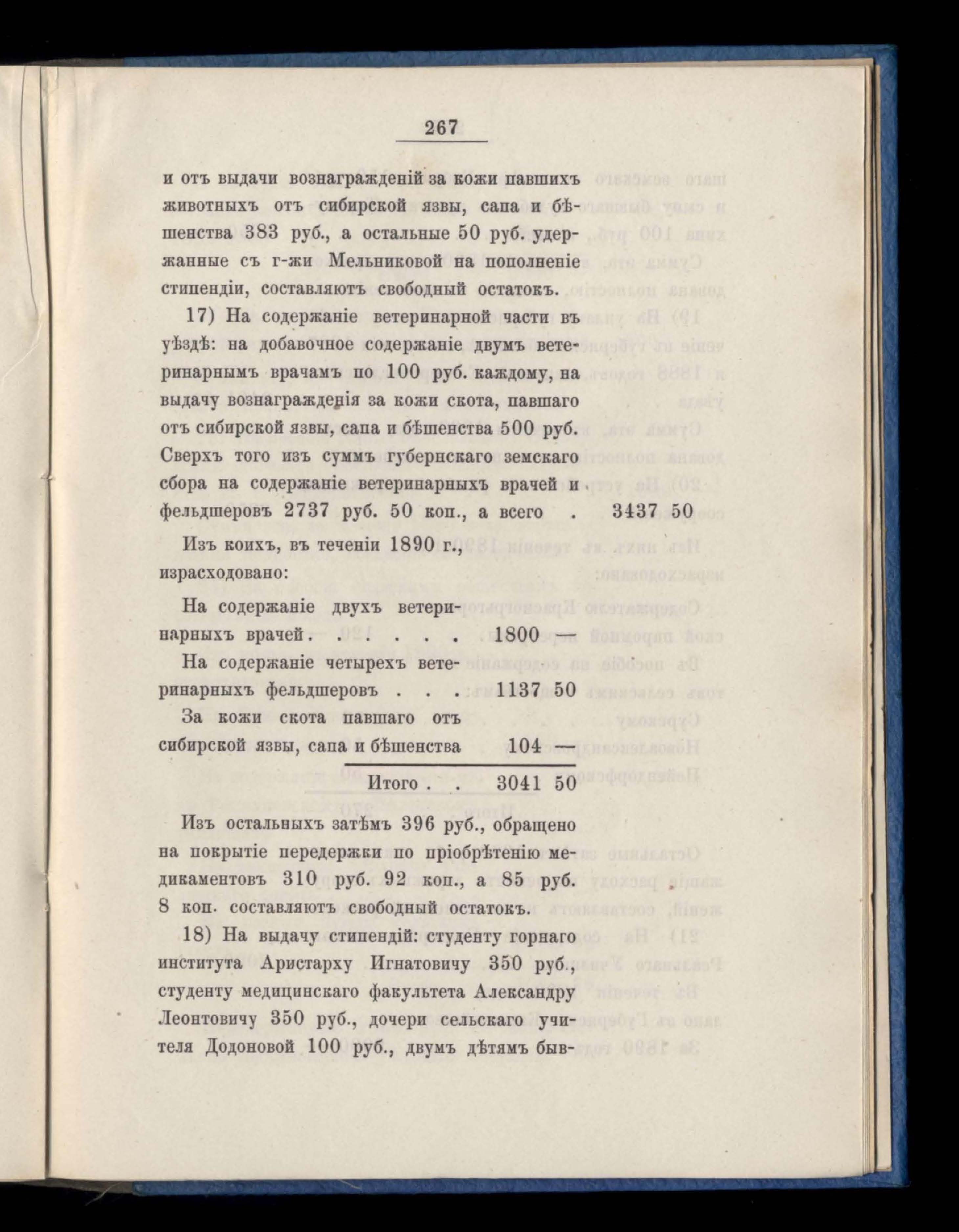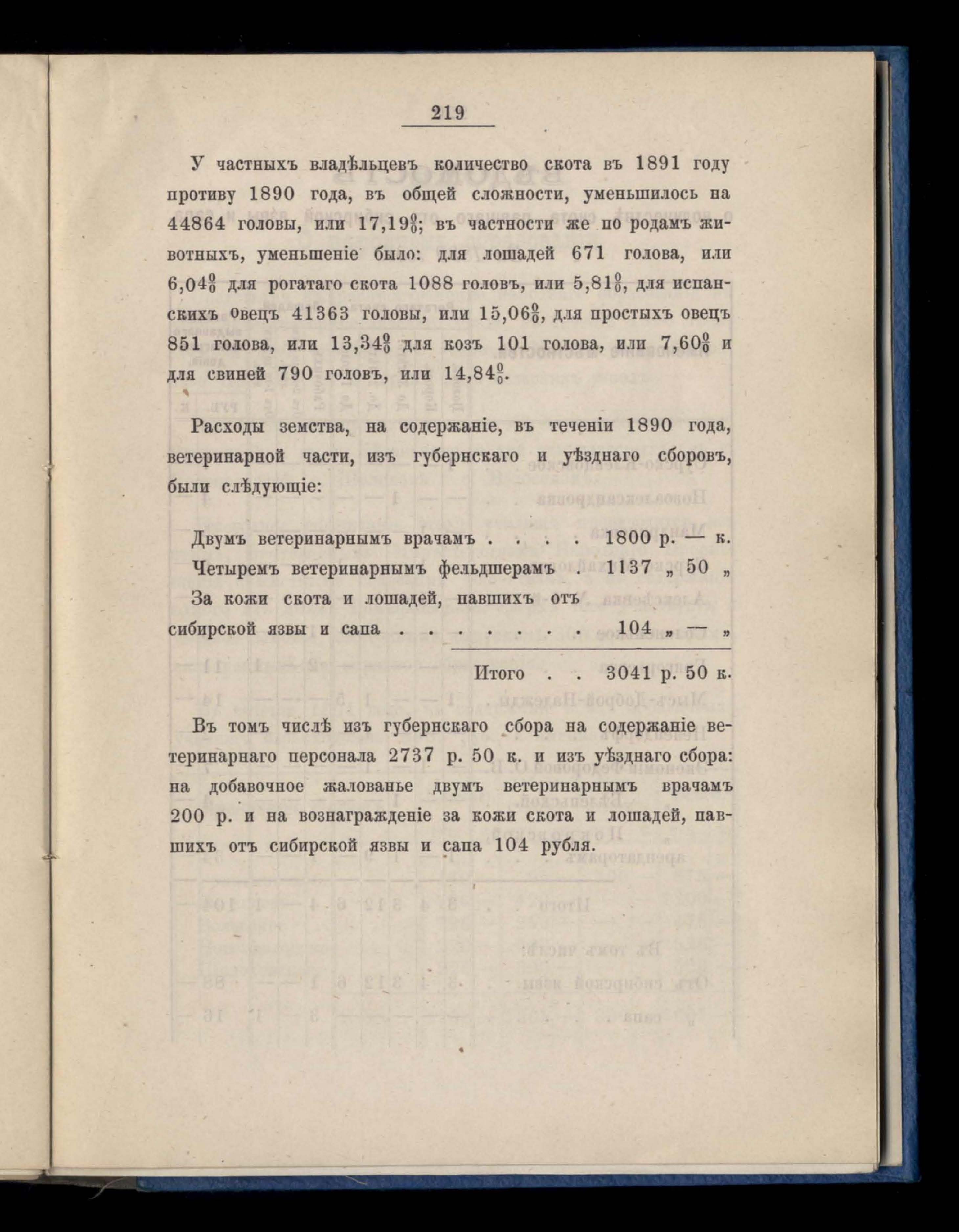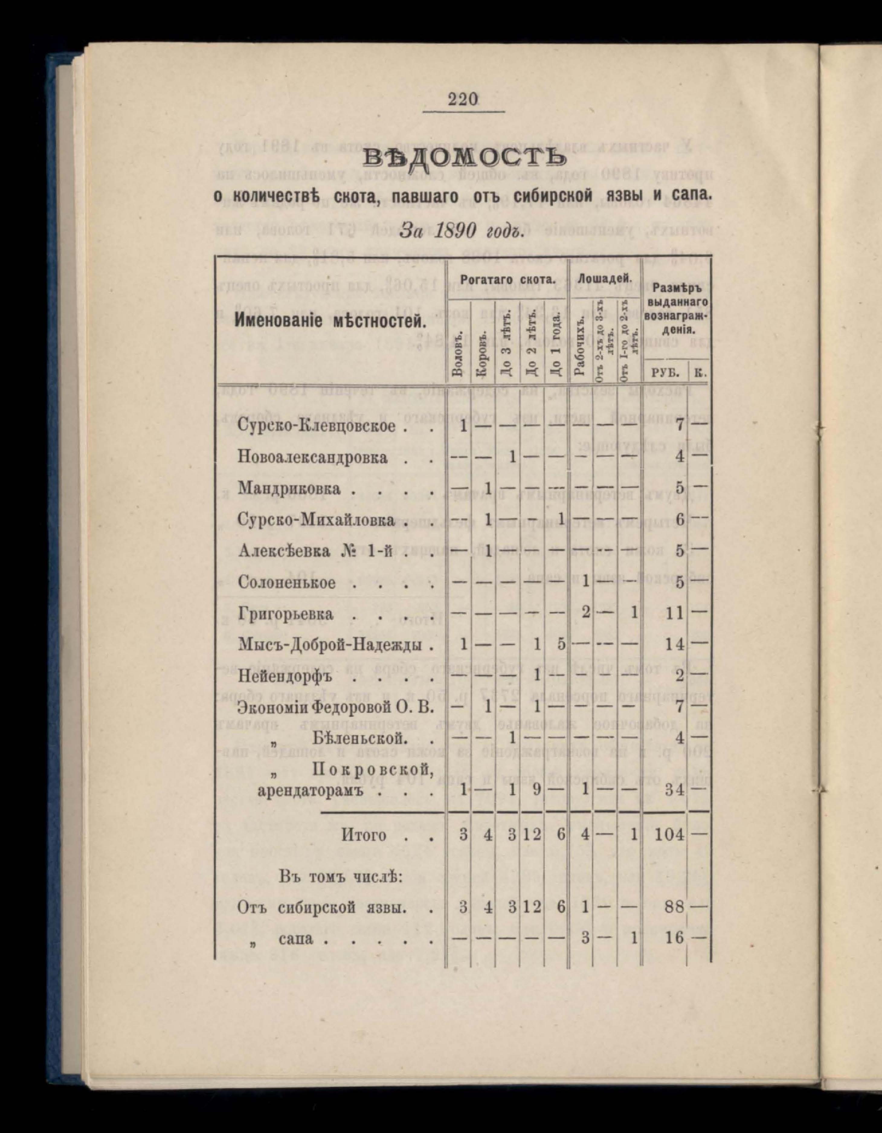 Въдомостъ о количествъ скота , павшаго отъ сибирской язвы и сала за 1890 годъ