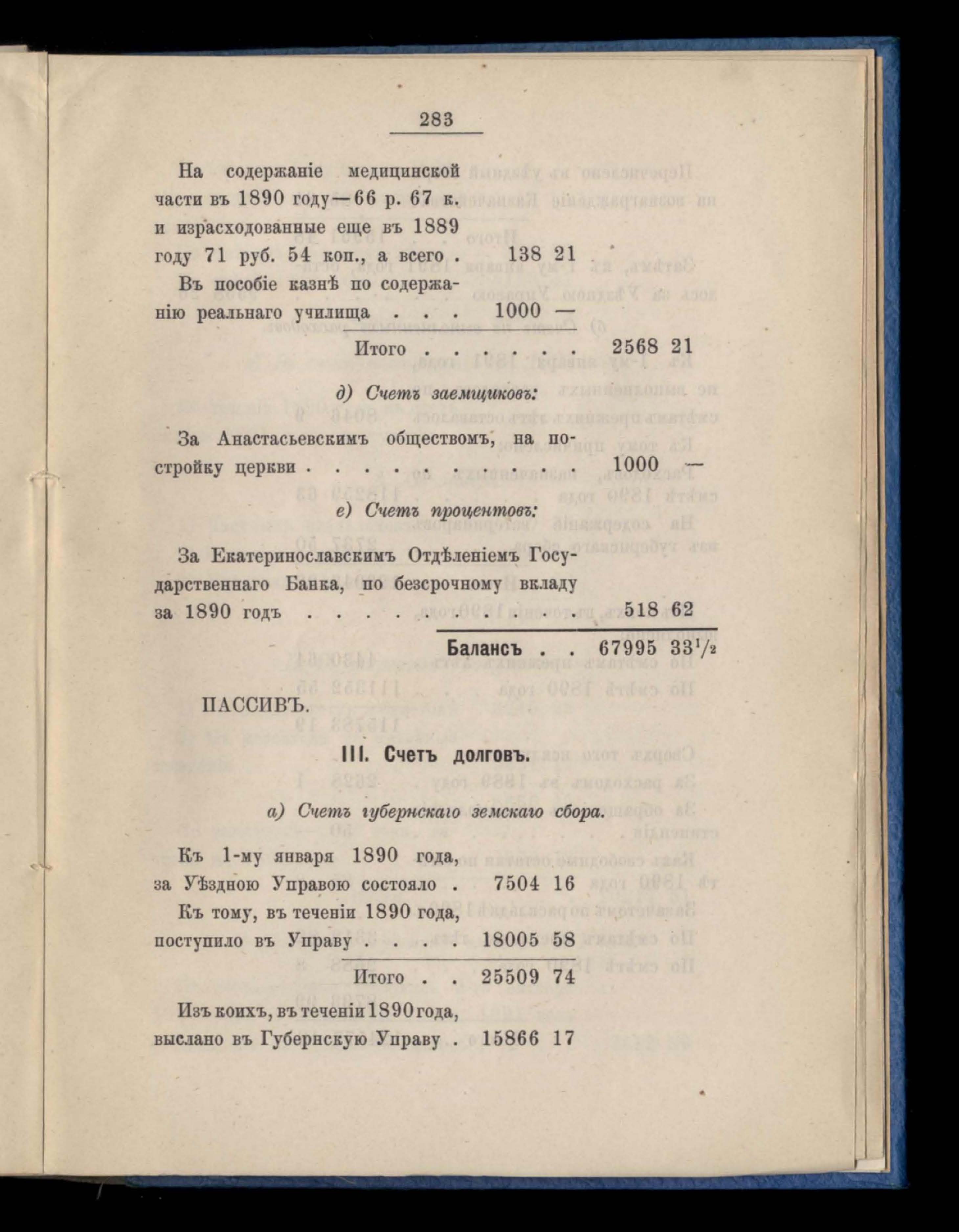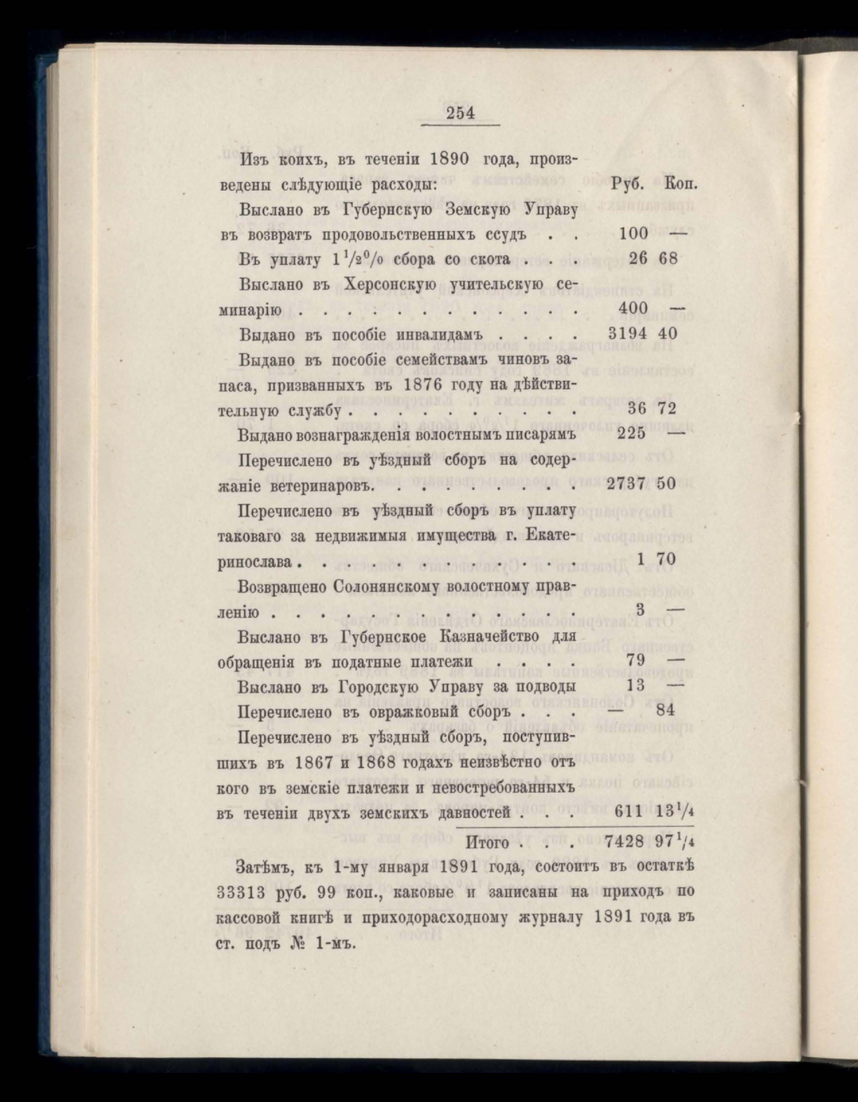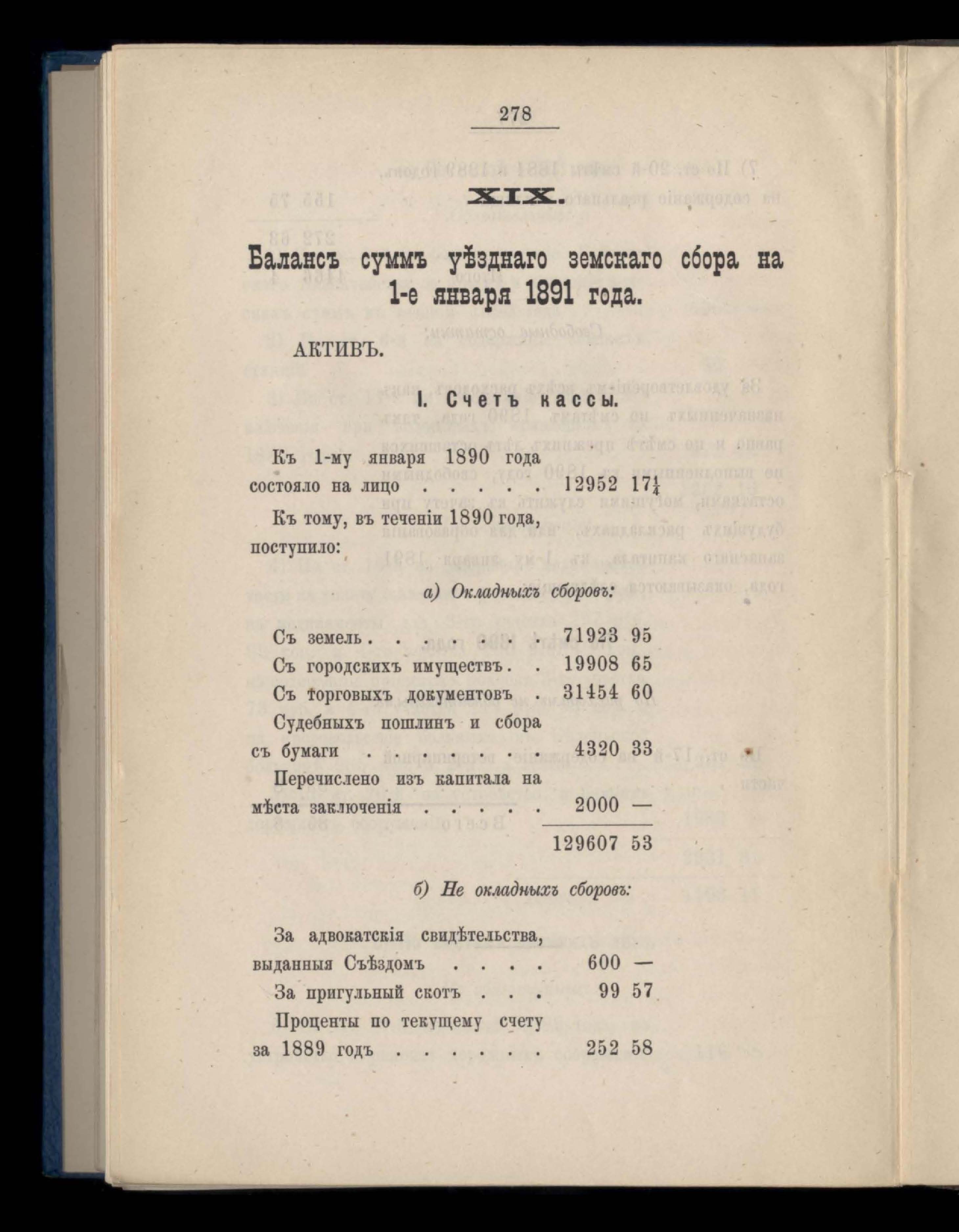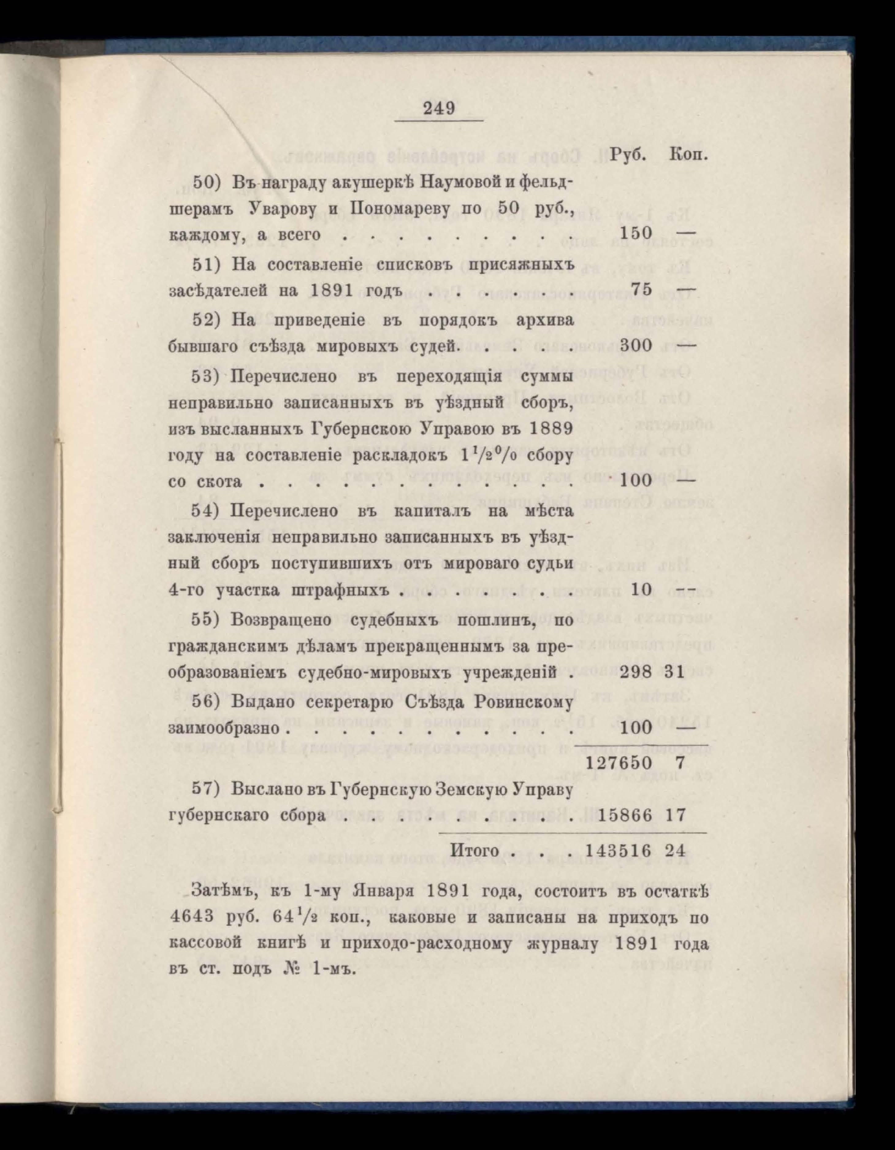 Балансъ суммъ уъзднаго земскаго сбора на 1-е января 1891 года