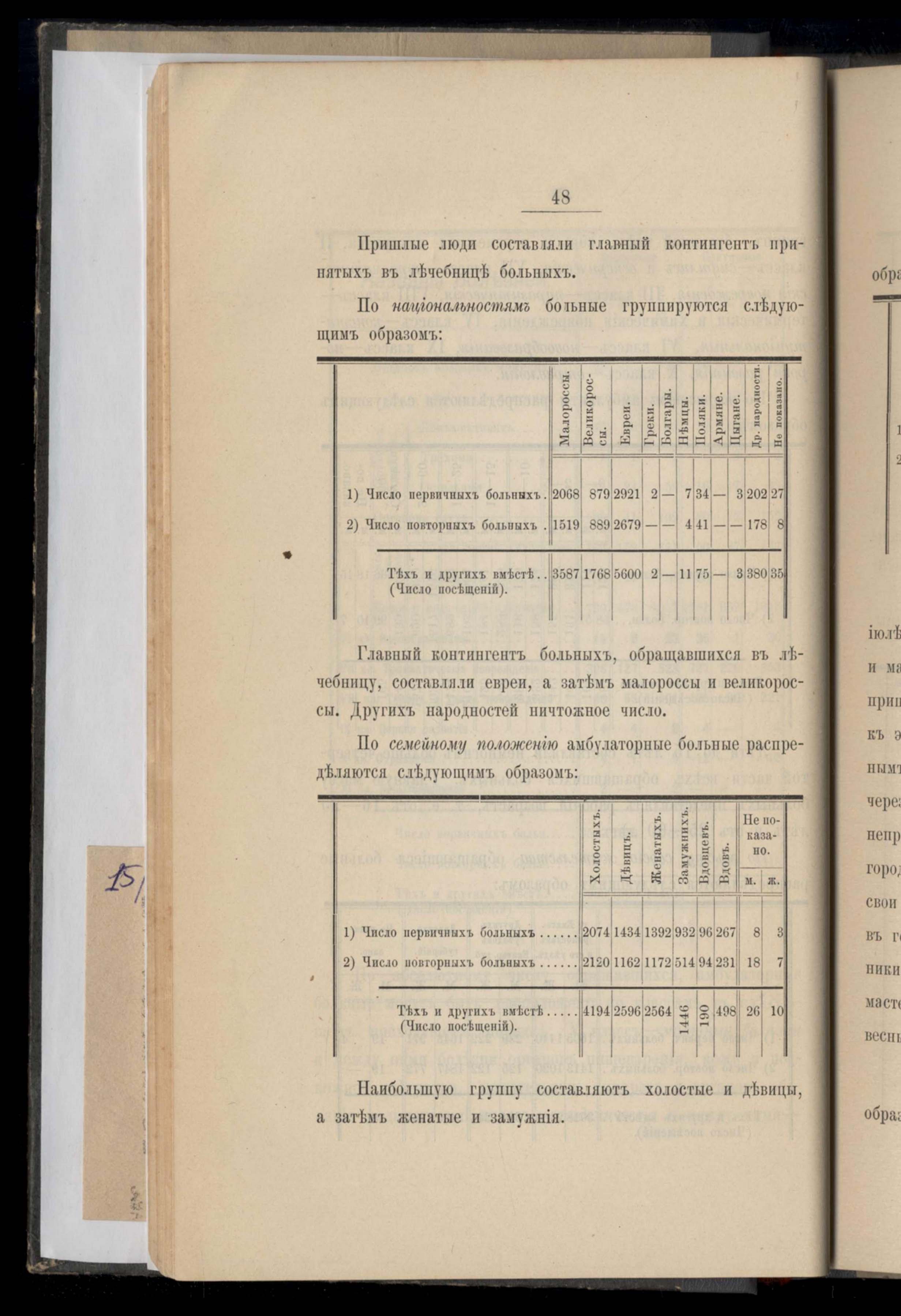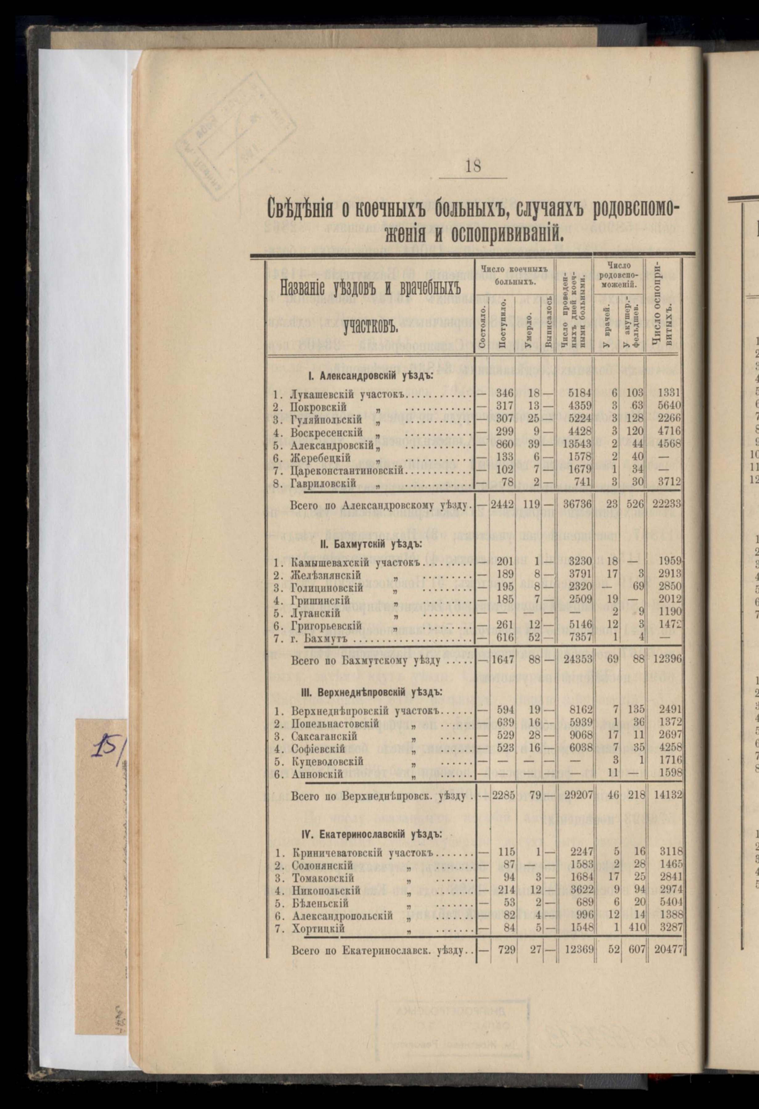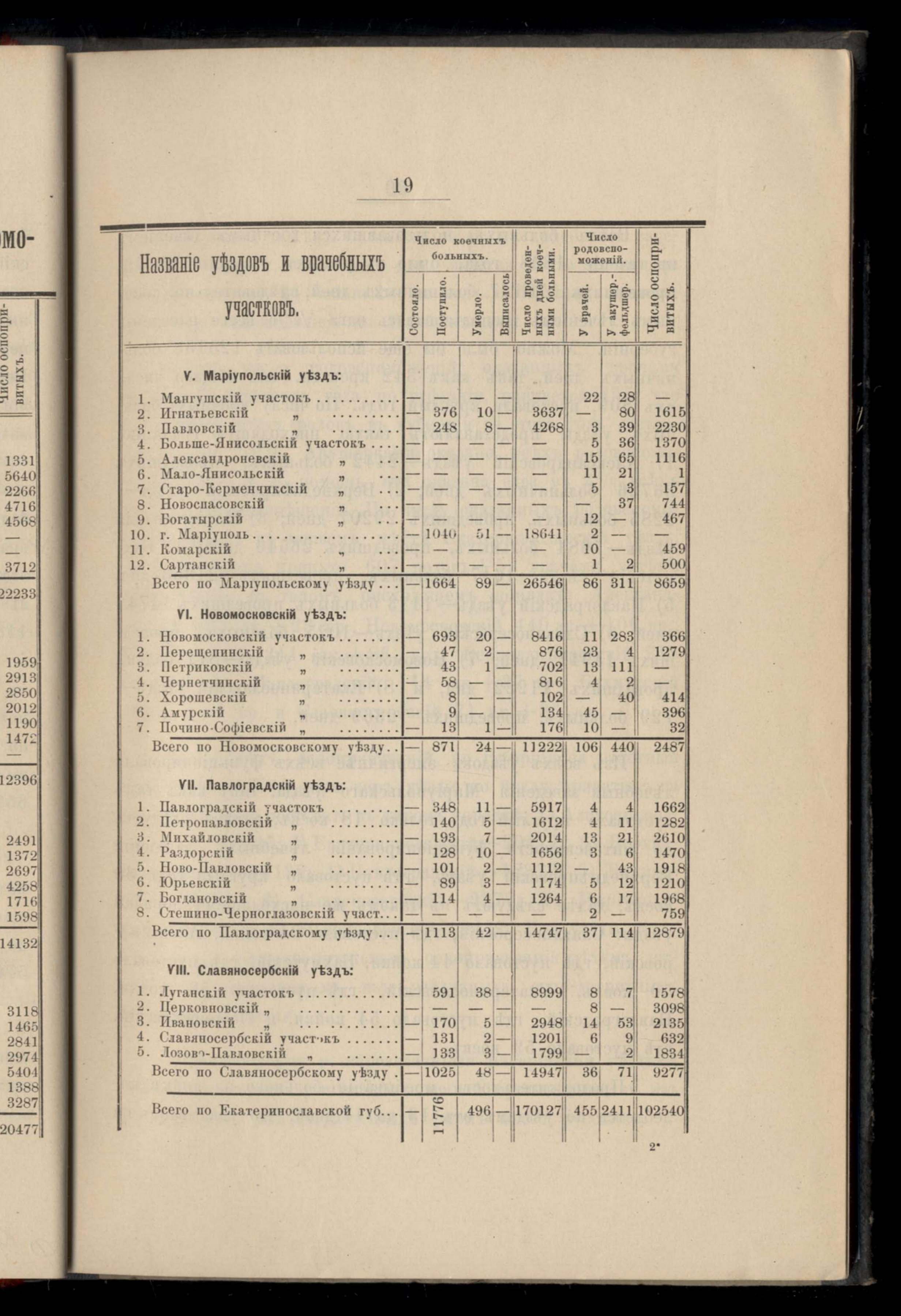 Сведенія о коечныхъ больныхъ, случаяхъ родовспоможенія и оспориваній.