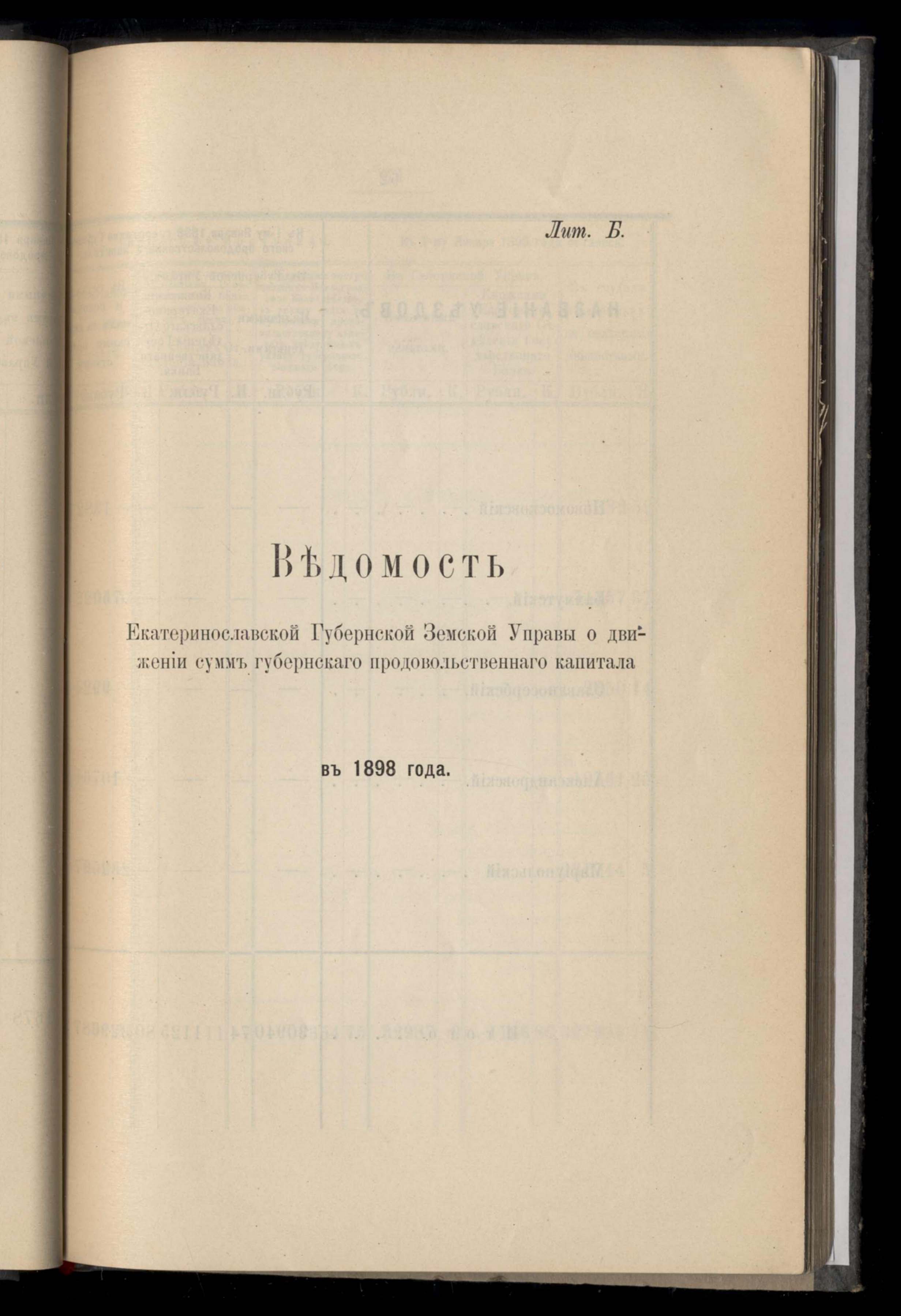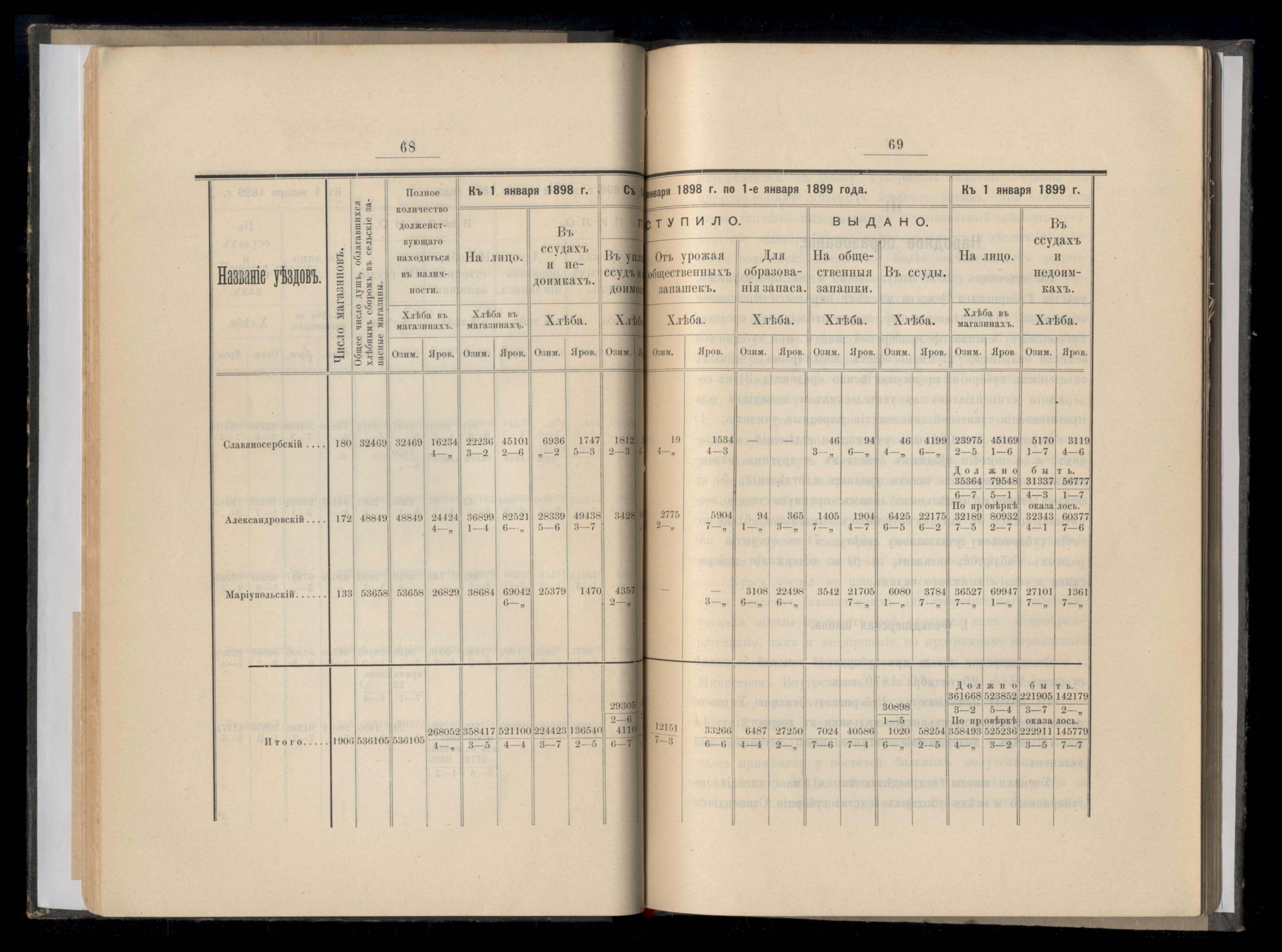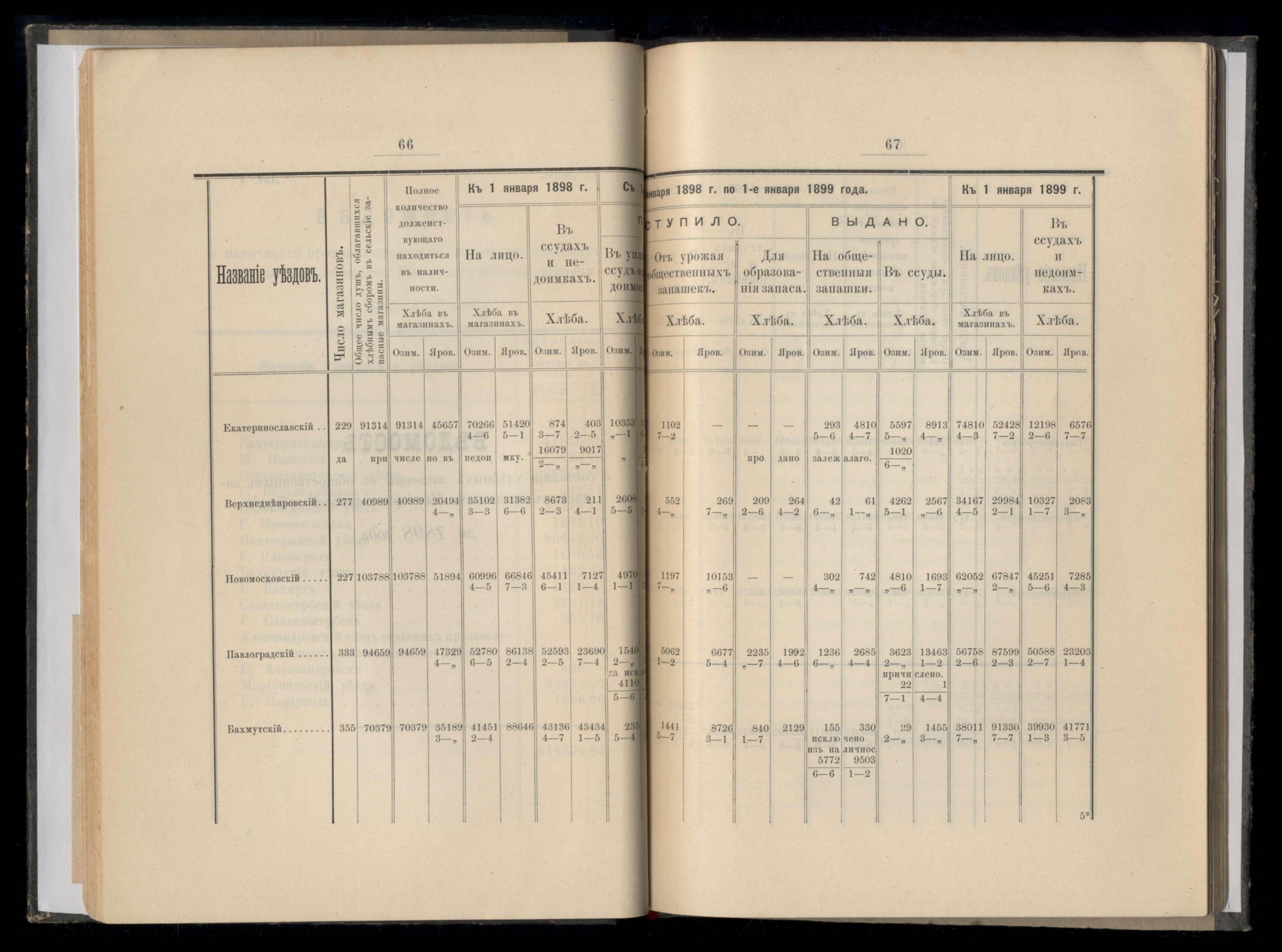 Ведомость о состояніи хлебныхъ запасовъ въ отбщественныхъ запасныхъ магазинахъ Екатеринославской губерніи за 1898 года