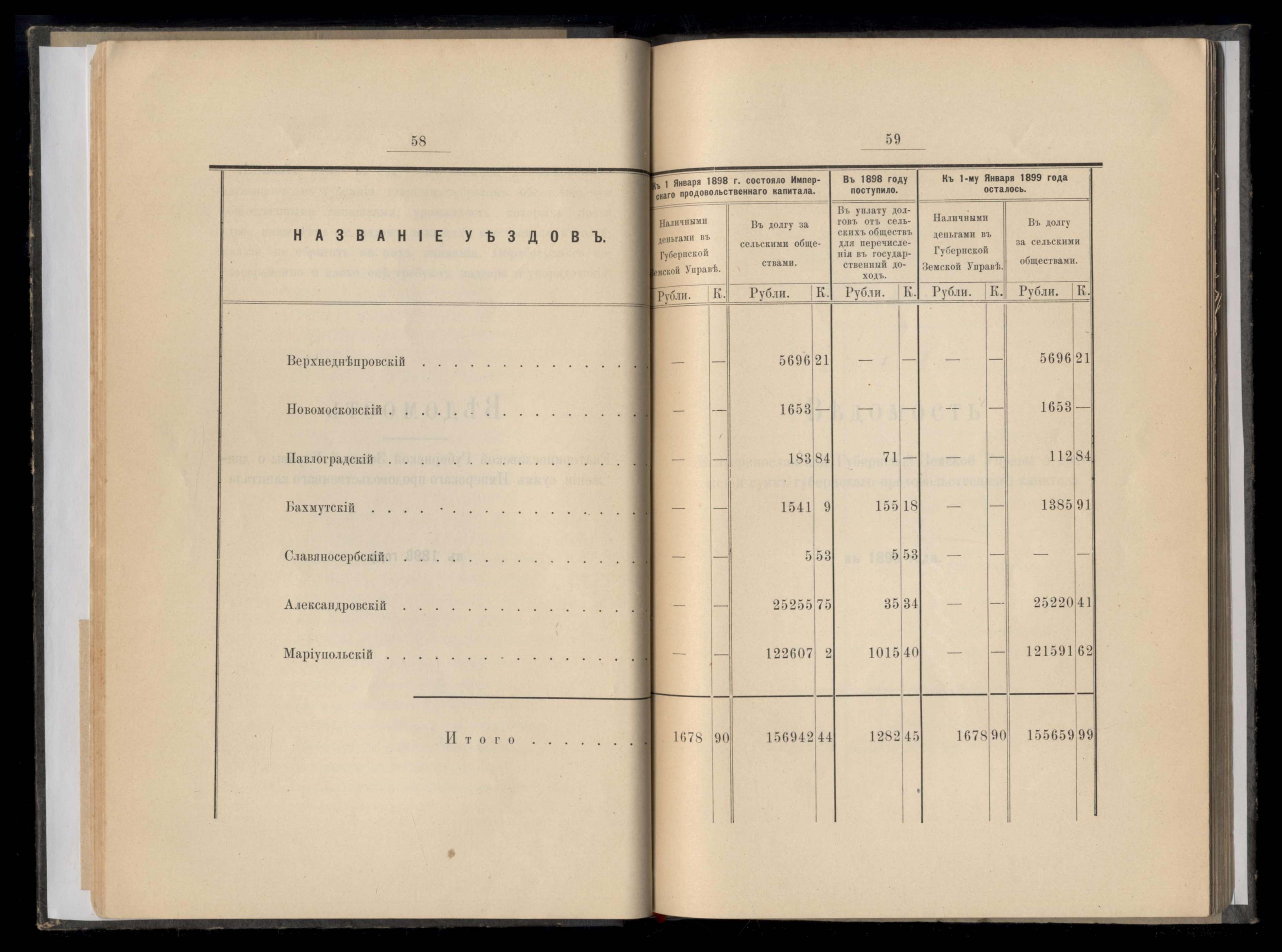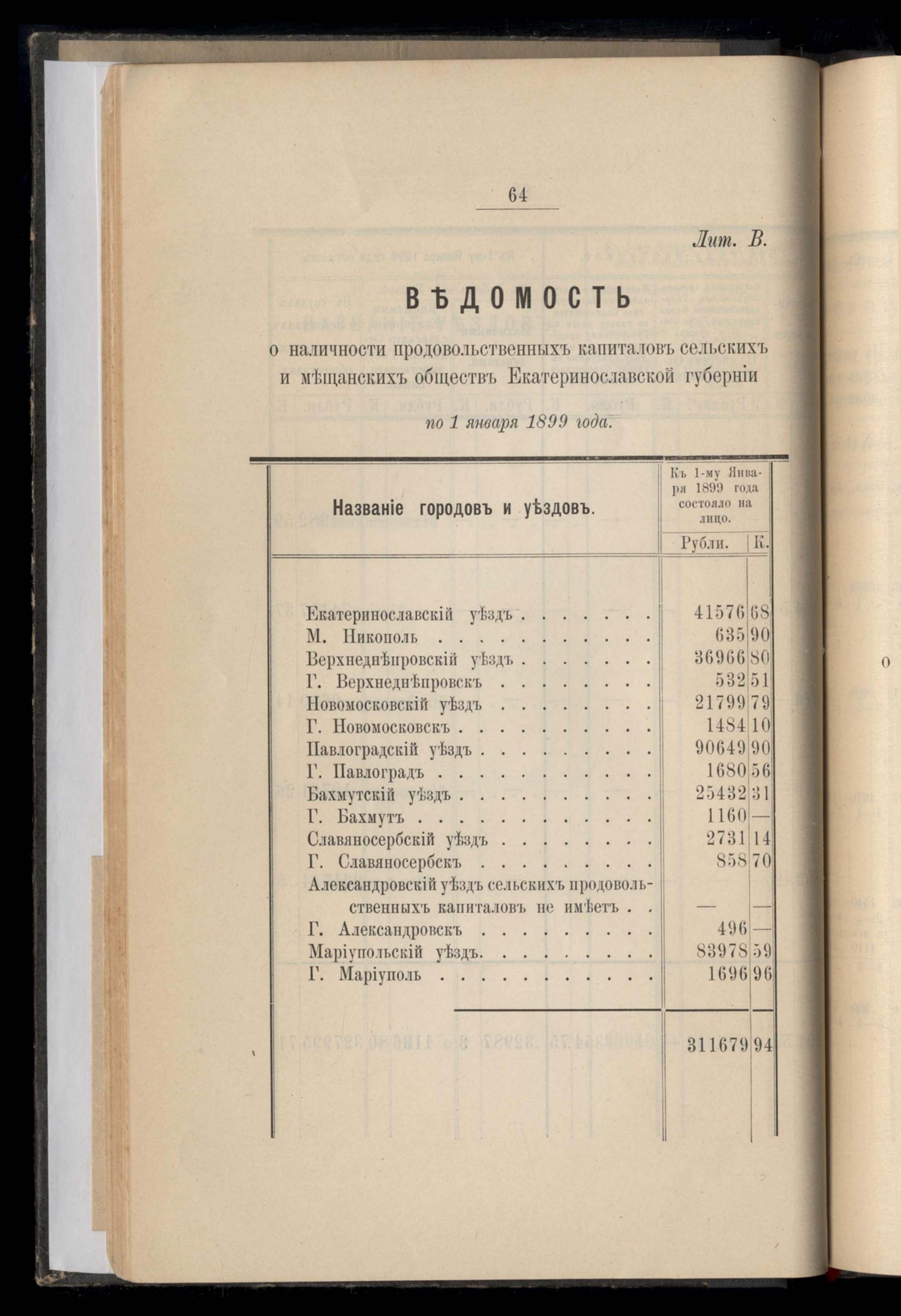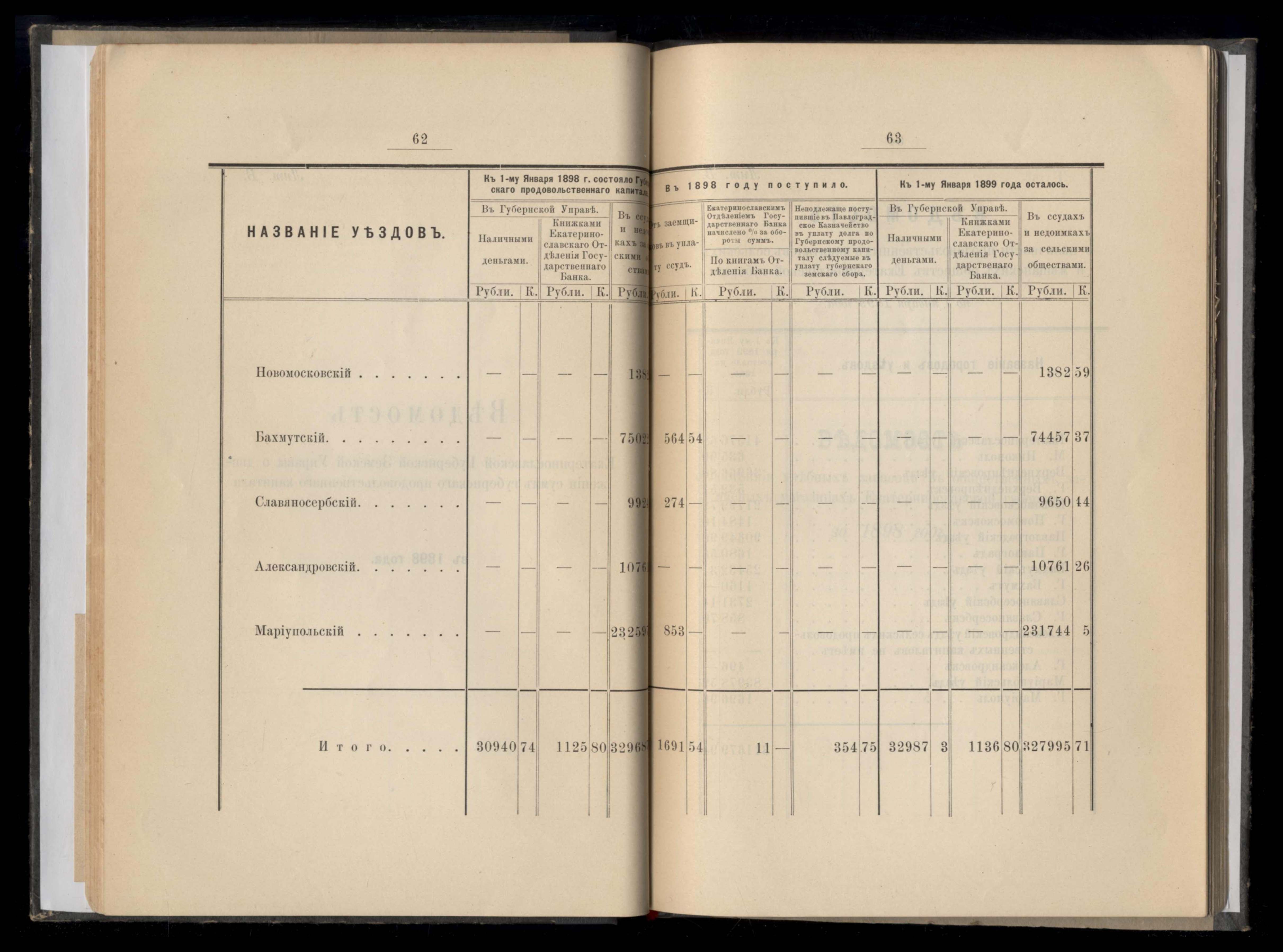 Ведомость о нальчности продовольственныхъ капиталовъ сельскихъ и мещанскихъ обществъ Екатеринославской губерніи по 1 января 1899 года
