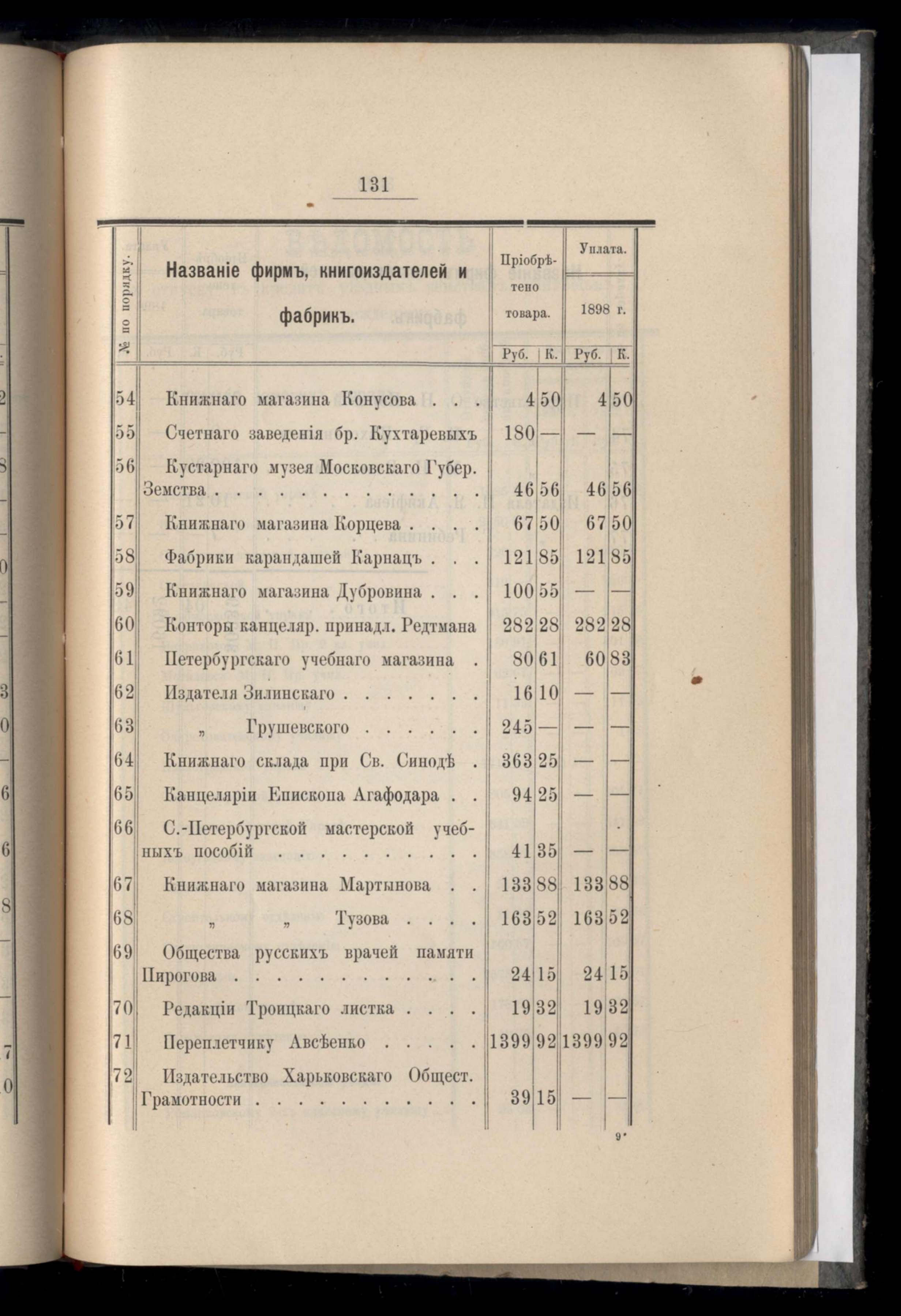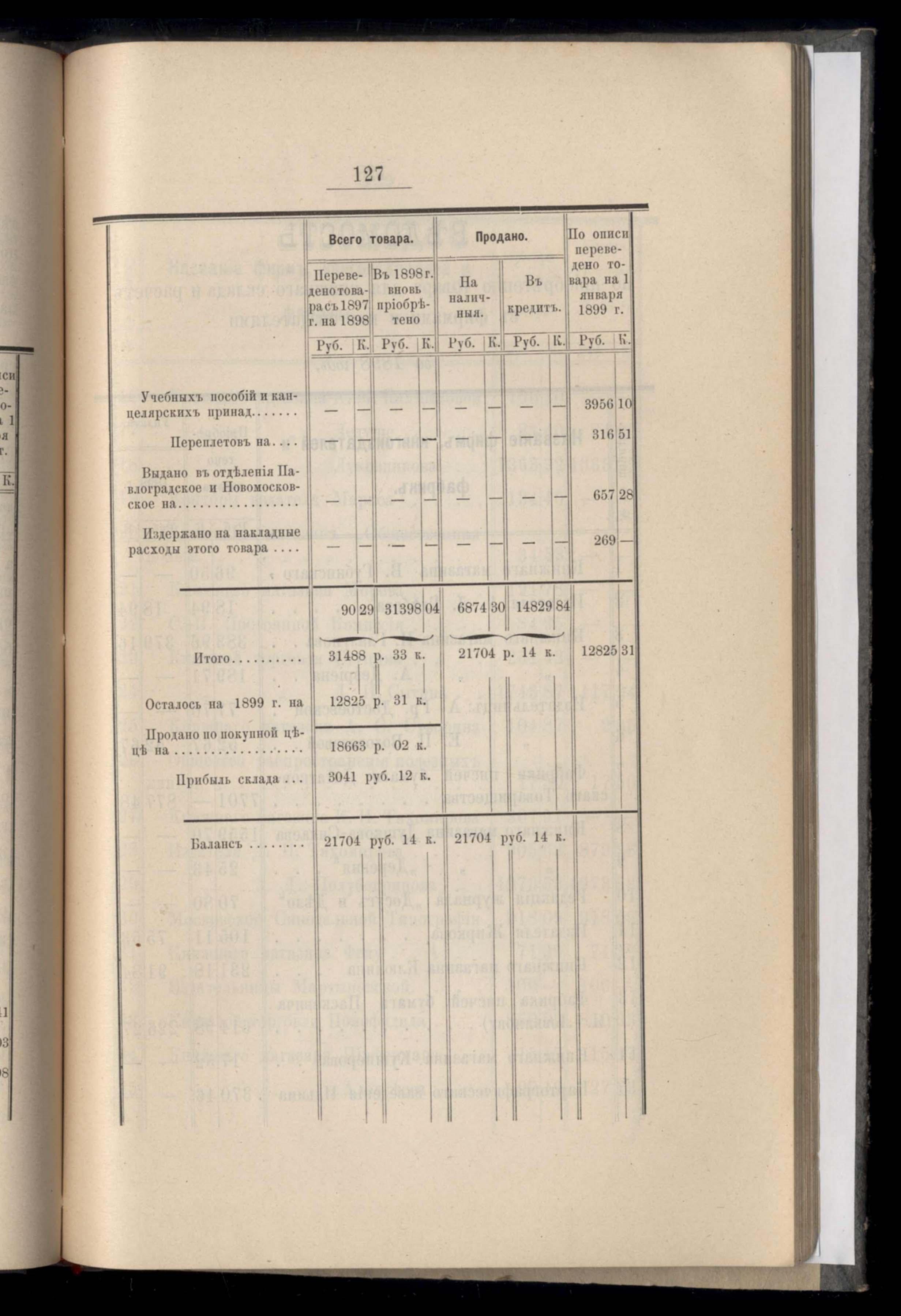 Ведомость о продажъ книгъ, учебныхъ пособій и письменныхъ принадлежностей съ основанія книжнаго склада съ декабря 1897 г. по 1 января 1899 г.