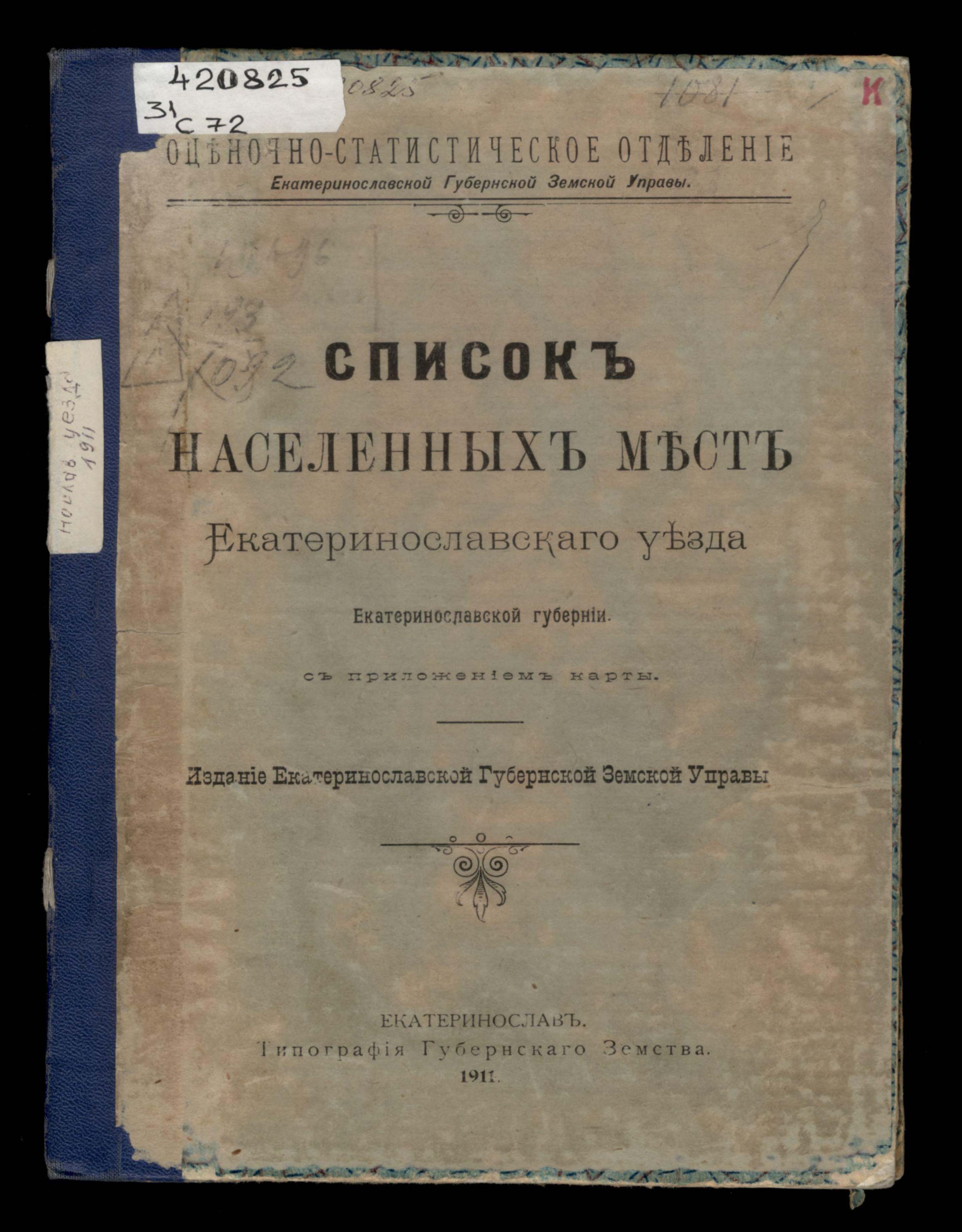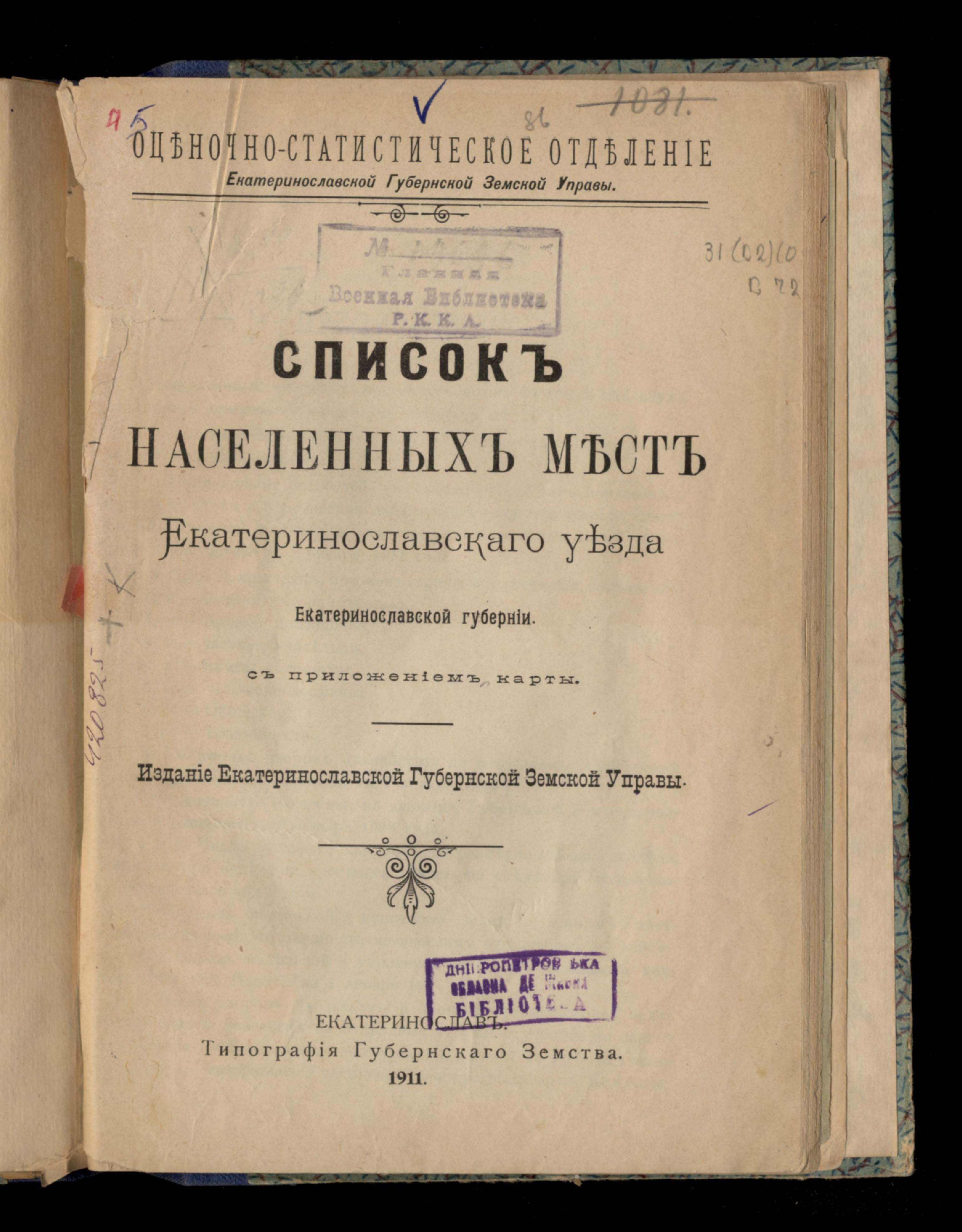 1. Списокъ населенныхъ местъ Екатеринославскаго уезда екатеринославской губерніи. Съ приложеніемъ карты