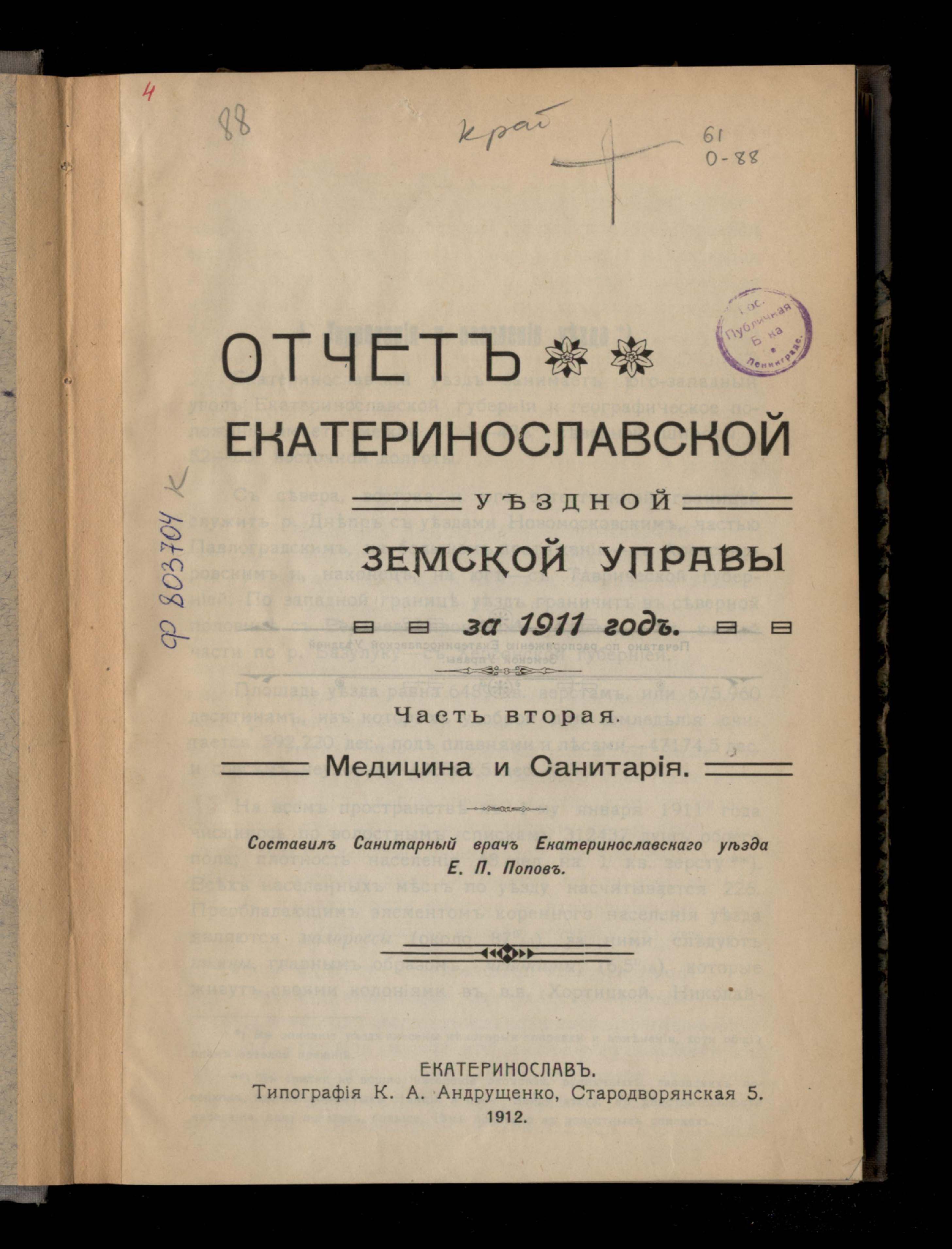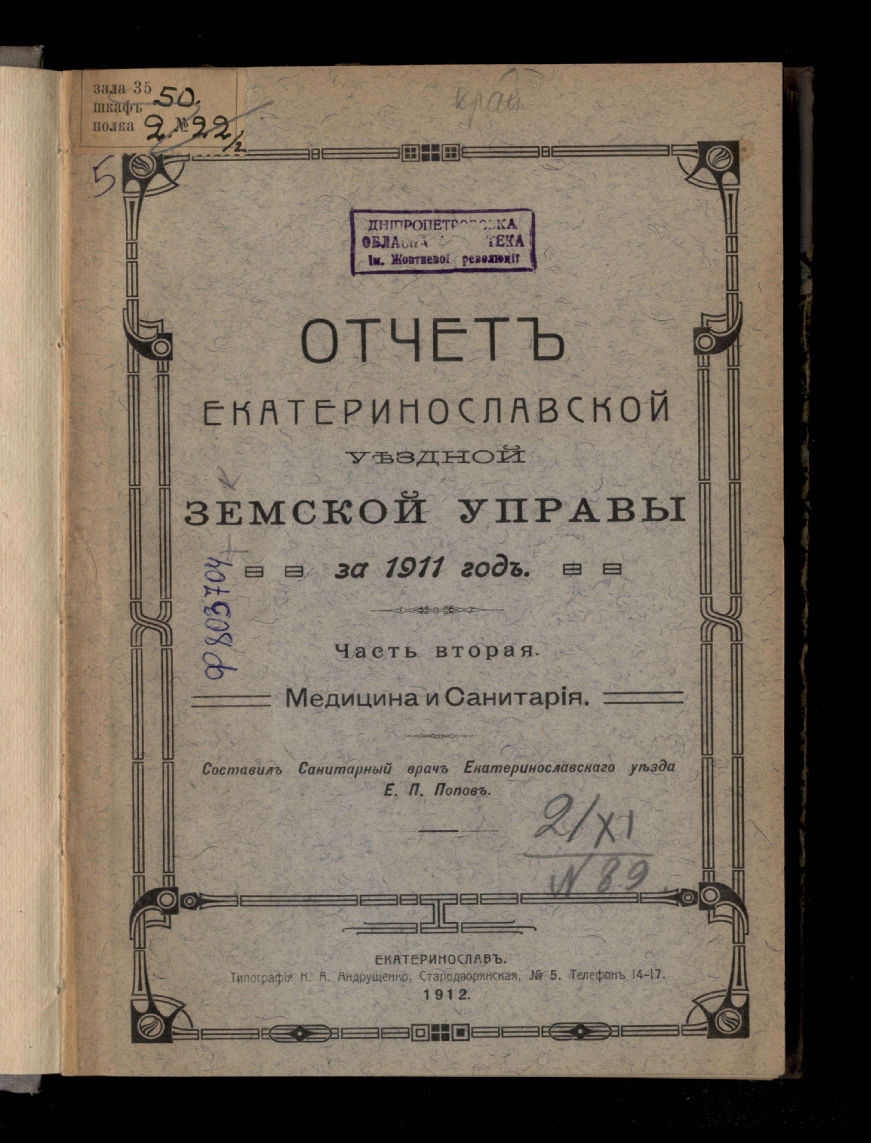 5. Отчетъ Екатеринославской Уездной Земской Управы за 11 годъ. Часть вторая Медицина и Санитарія