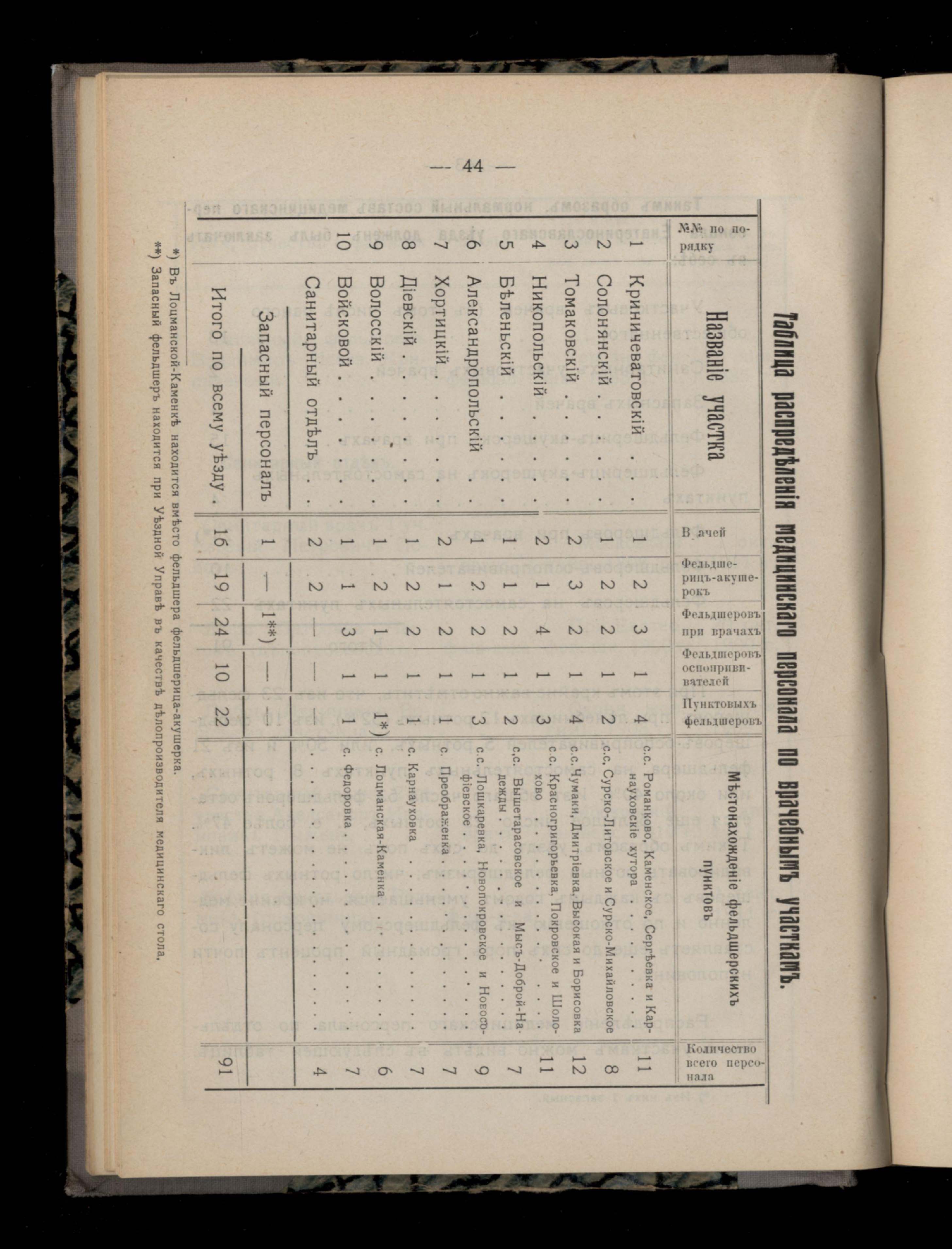 50. Таблица распределенія медицинскаго персонала по врачебнымъ участкамъ