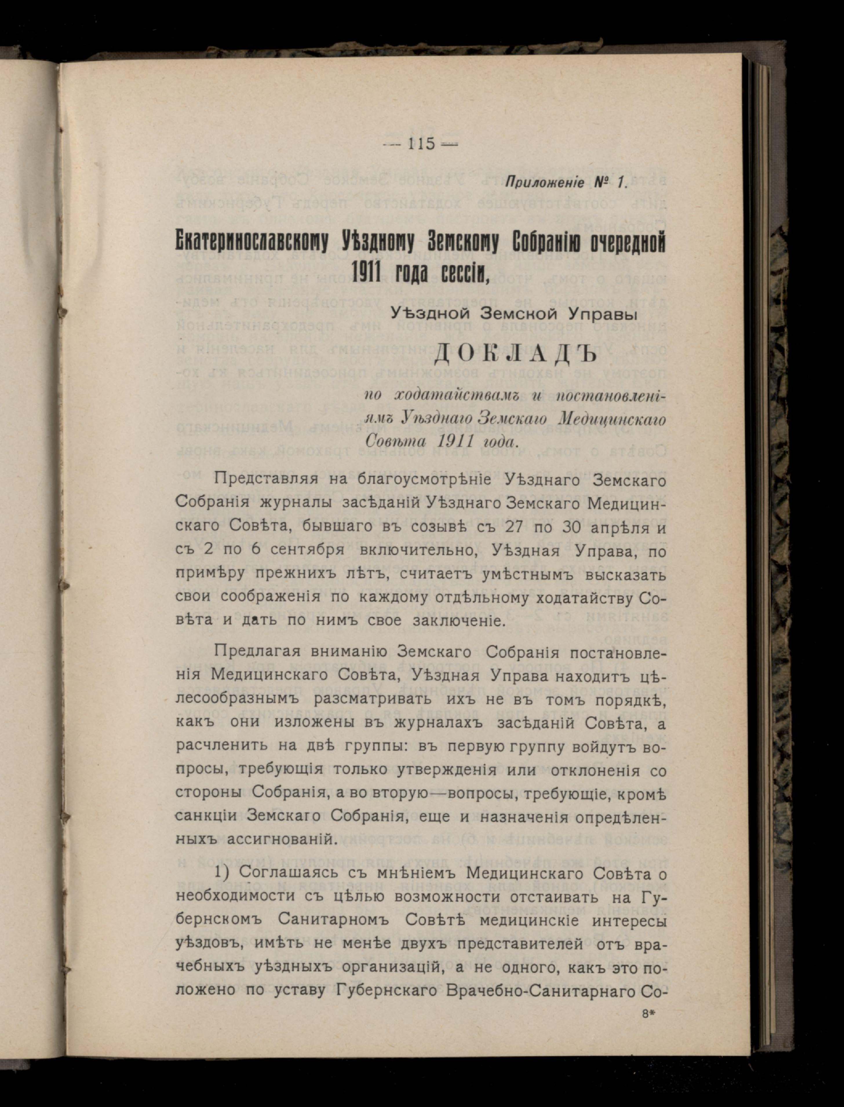 121. Приложеніе № 1. Екатеринославскому Уездному Земскому Собранію очередной 1911 года сессіи, Уездной Земской Управы Докладъ
