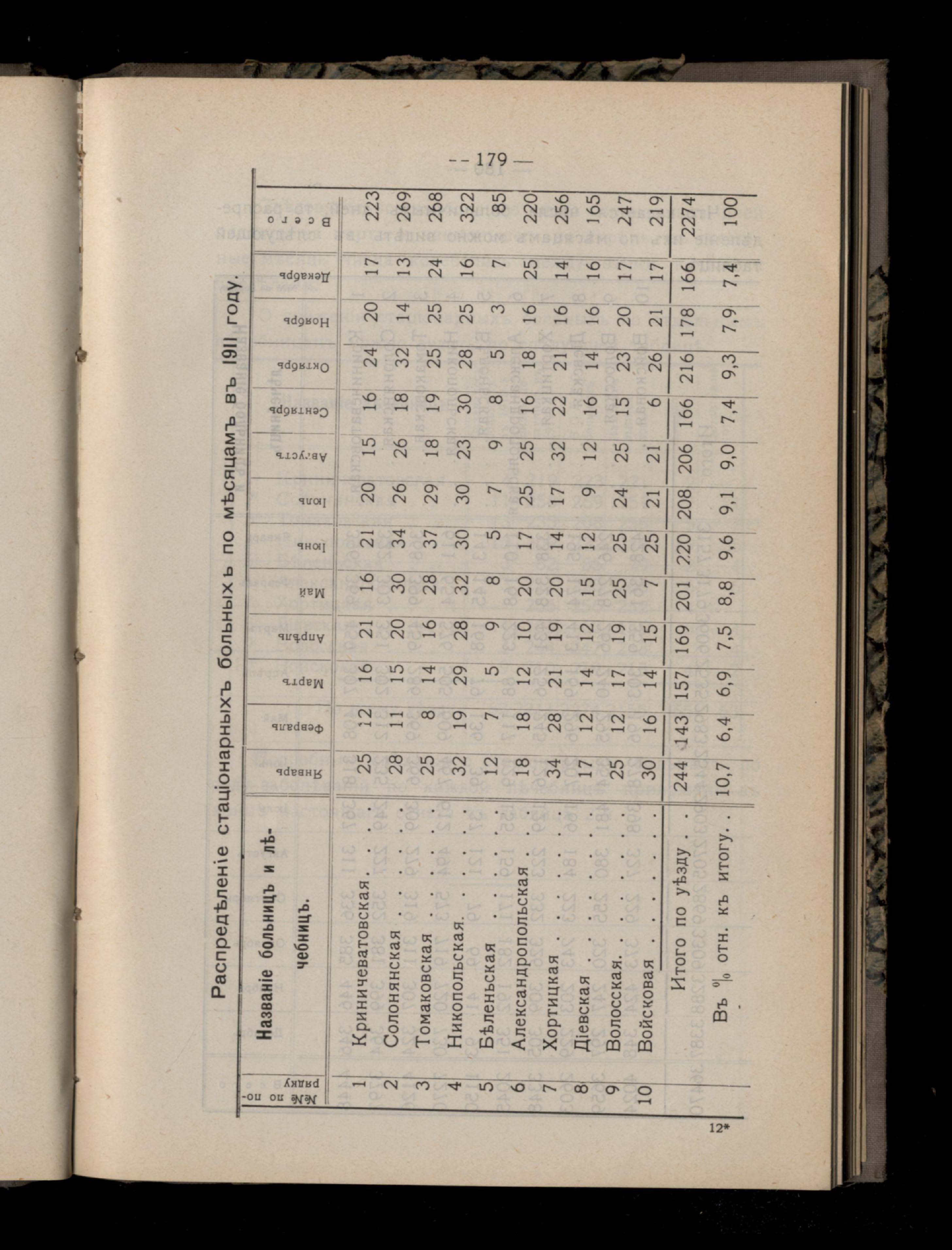 185. Распределеніе стаціонарныхъ больныхъ по месяцамъ въ 1911 году