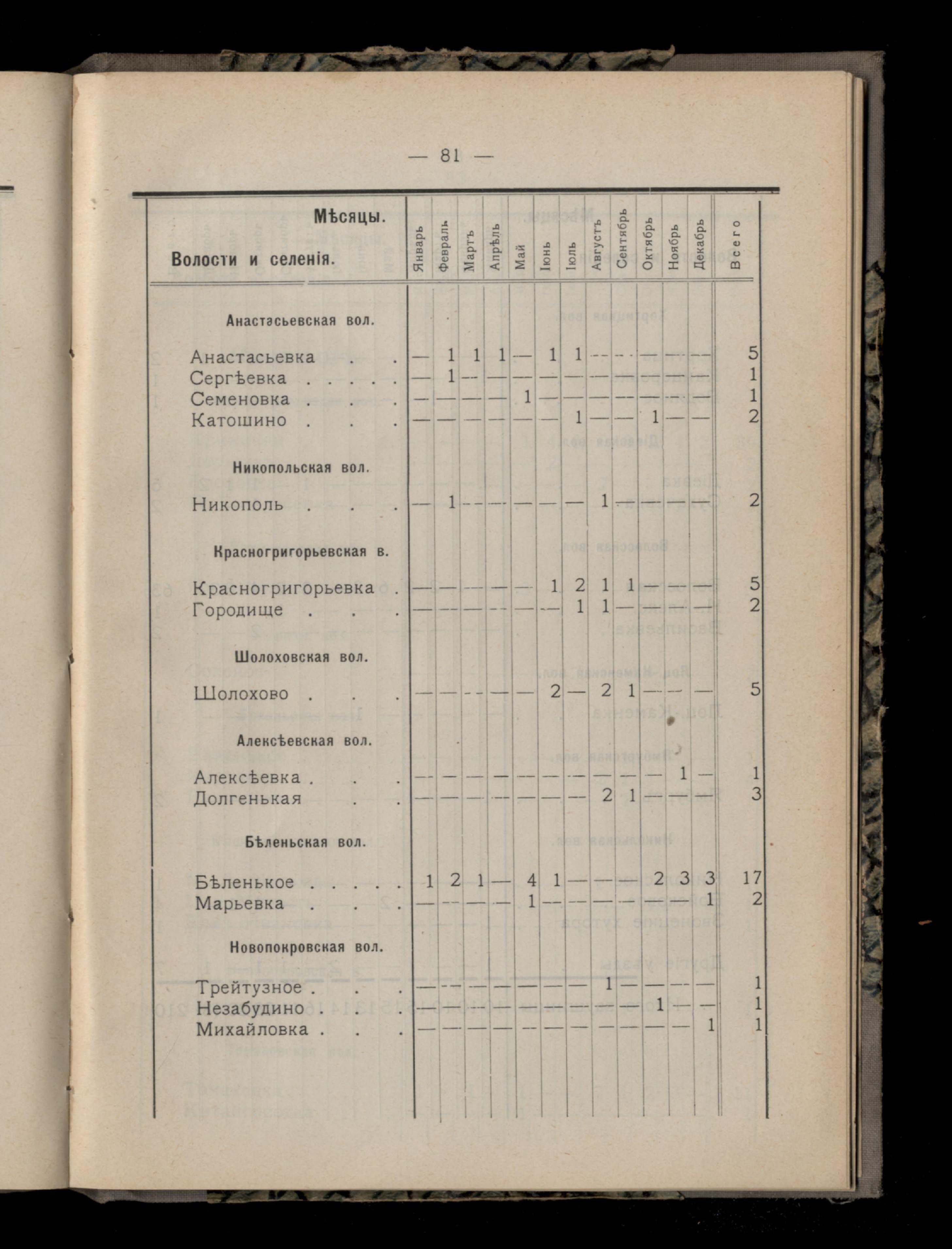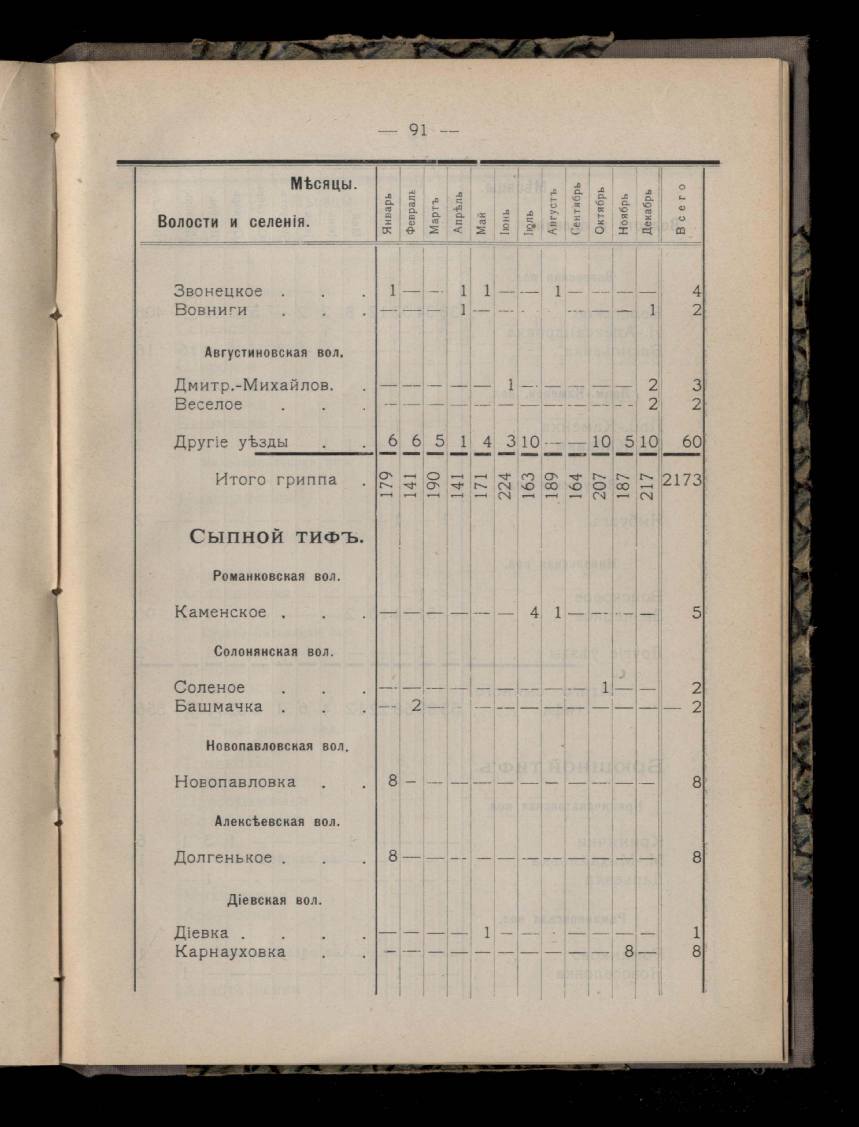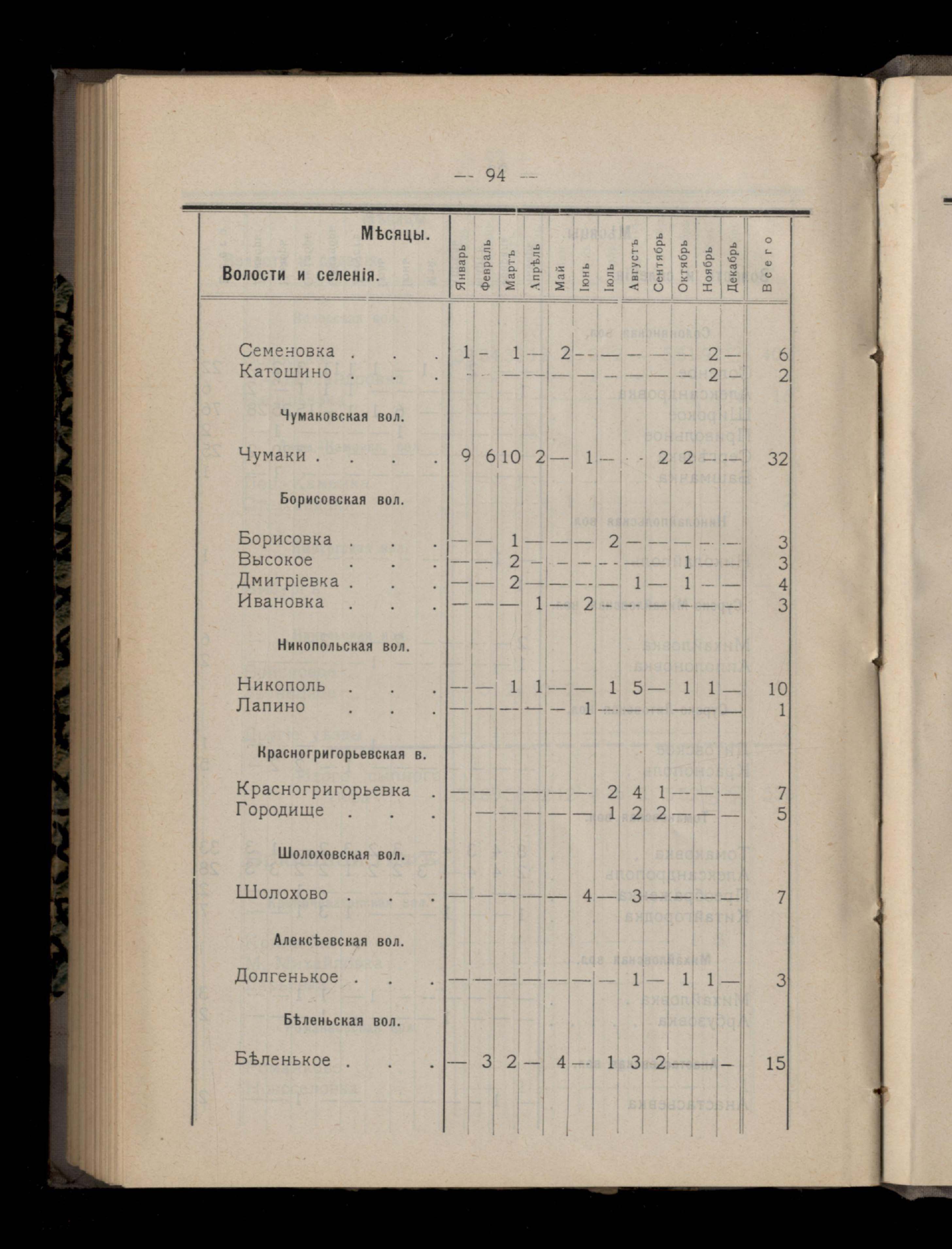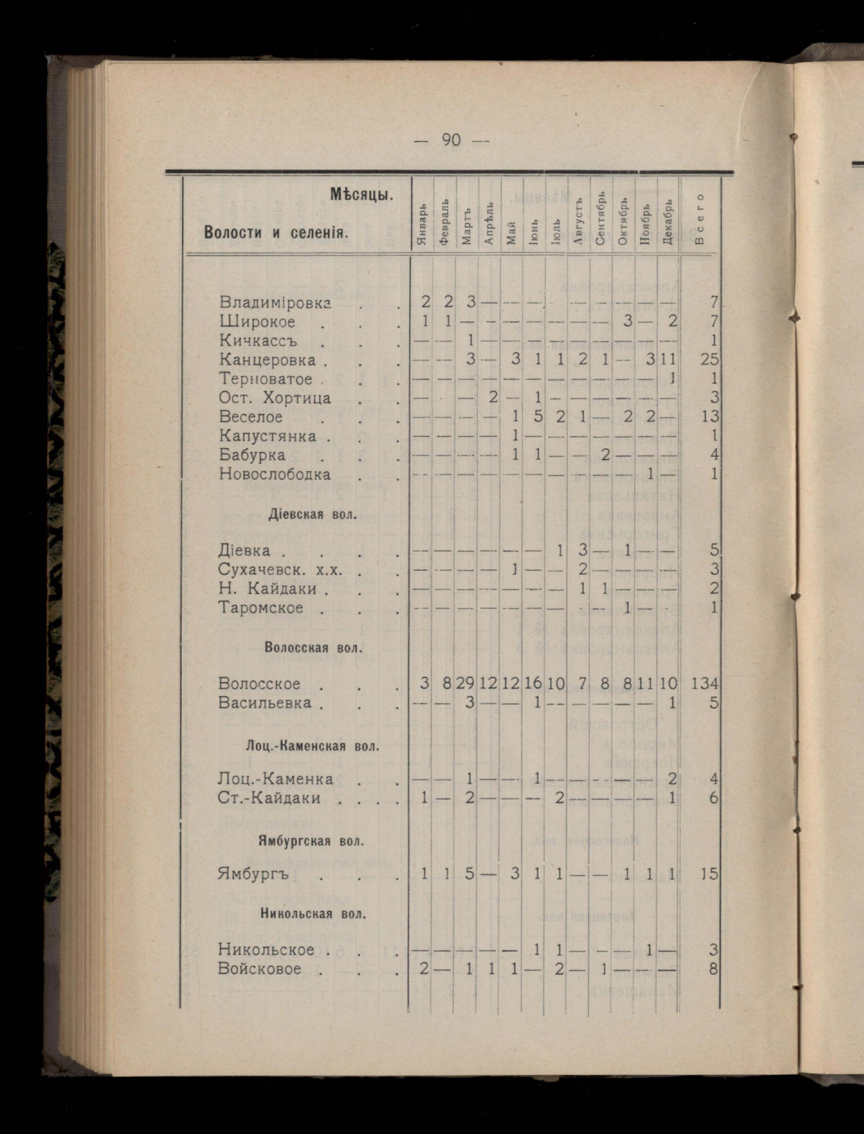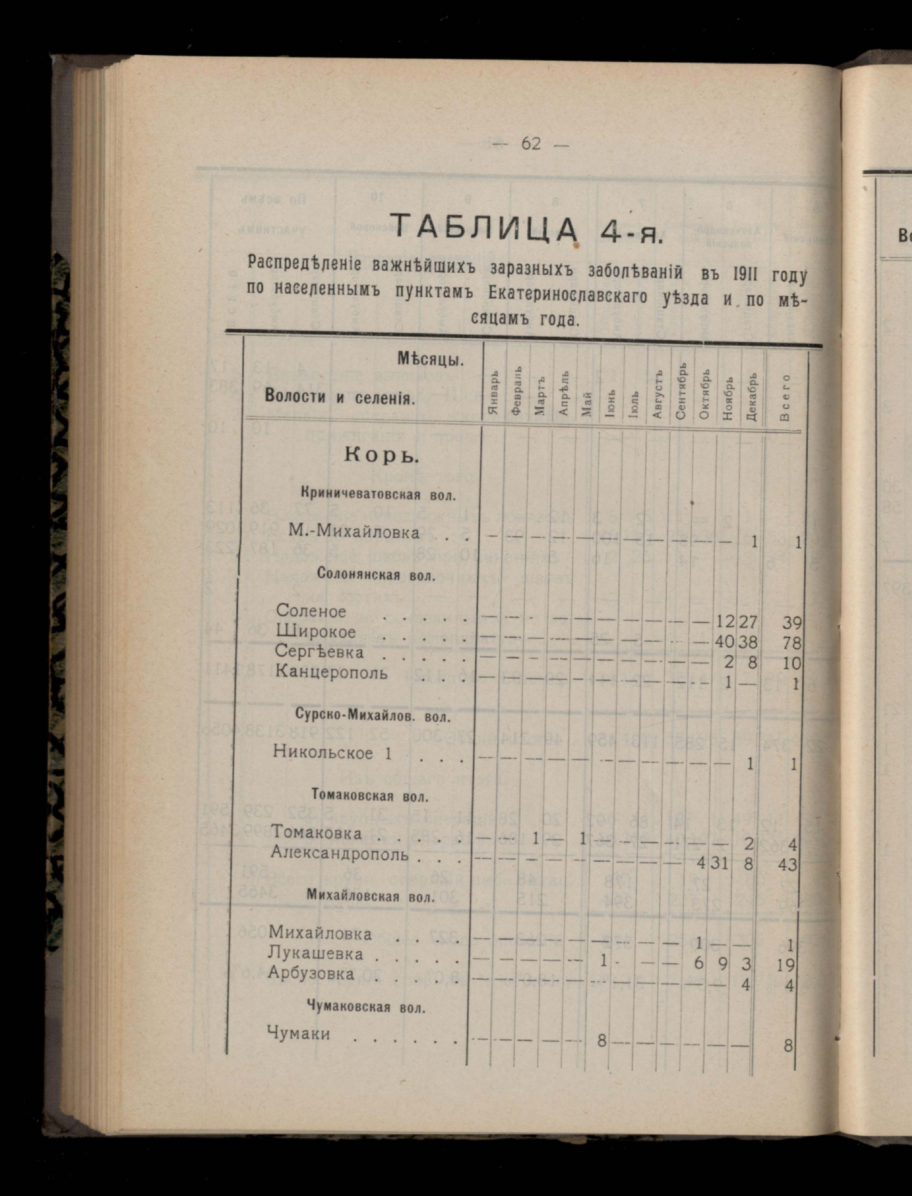 Таблица 4-я. Распределеніе важнейших заразныхъ заболеваній въ 1911 году по населеннымъ пунктамъ Екатеринославскаго уезда и по месяцамъ года