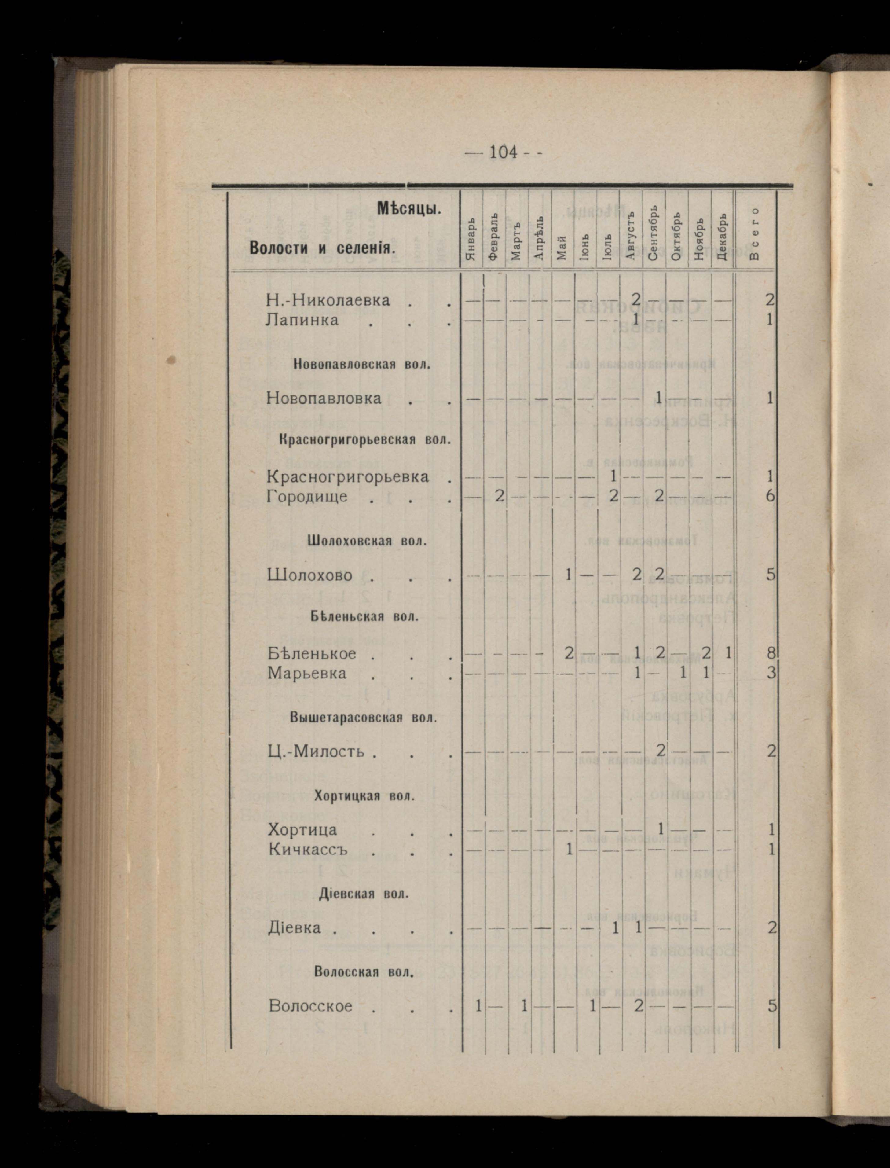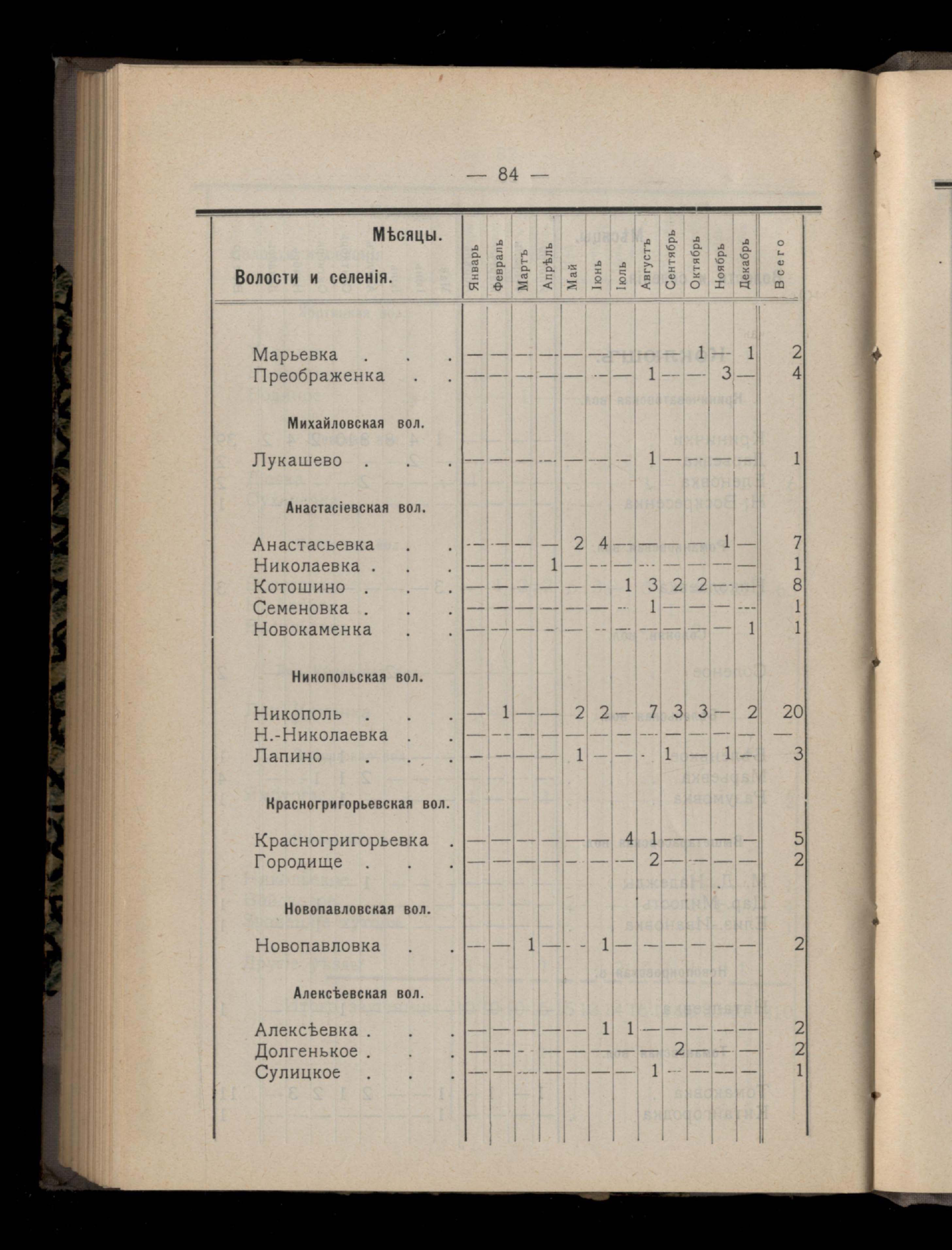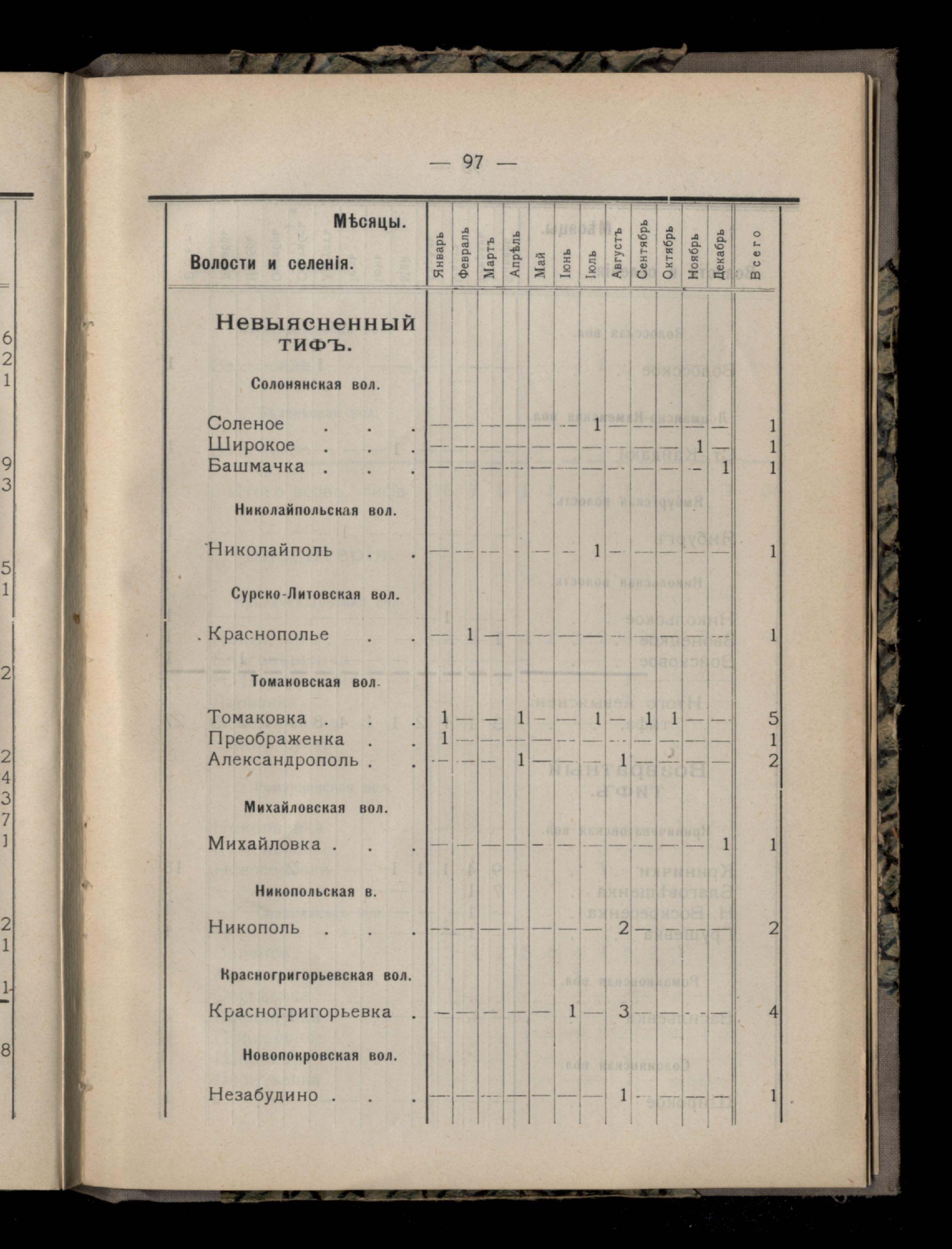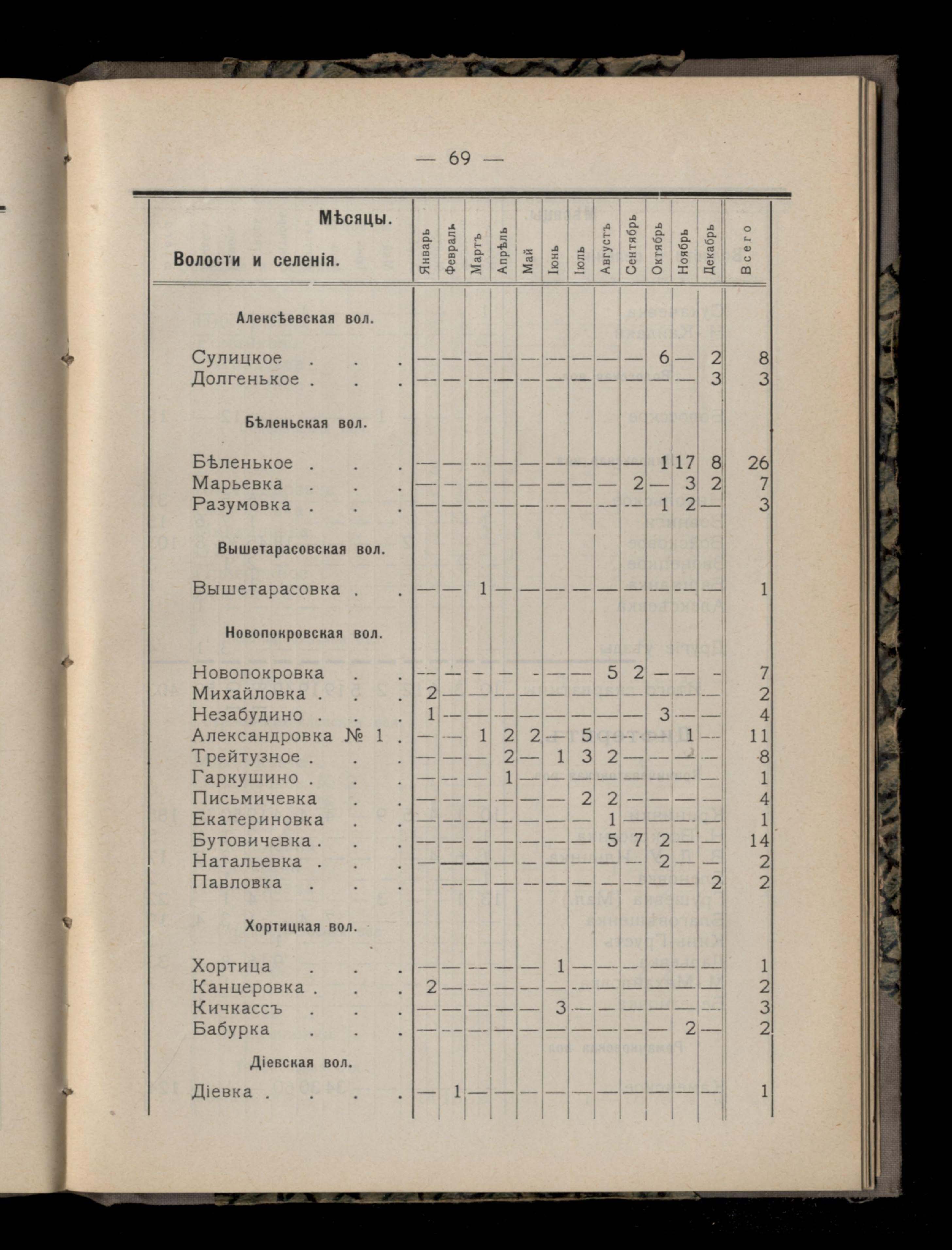 Таблица 4-я. Распределеніе важнейших заразныхъ заболеваній въ 1911 году по населеннымъ пунктамъ Екатеринославскаго уезда и по месяцамъ года