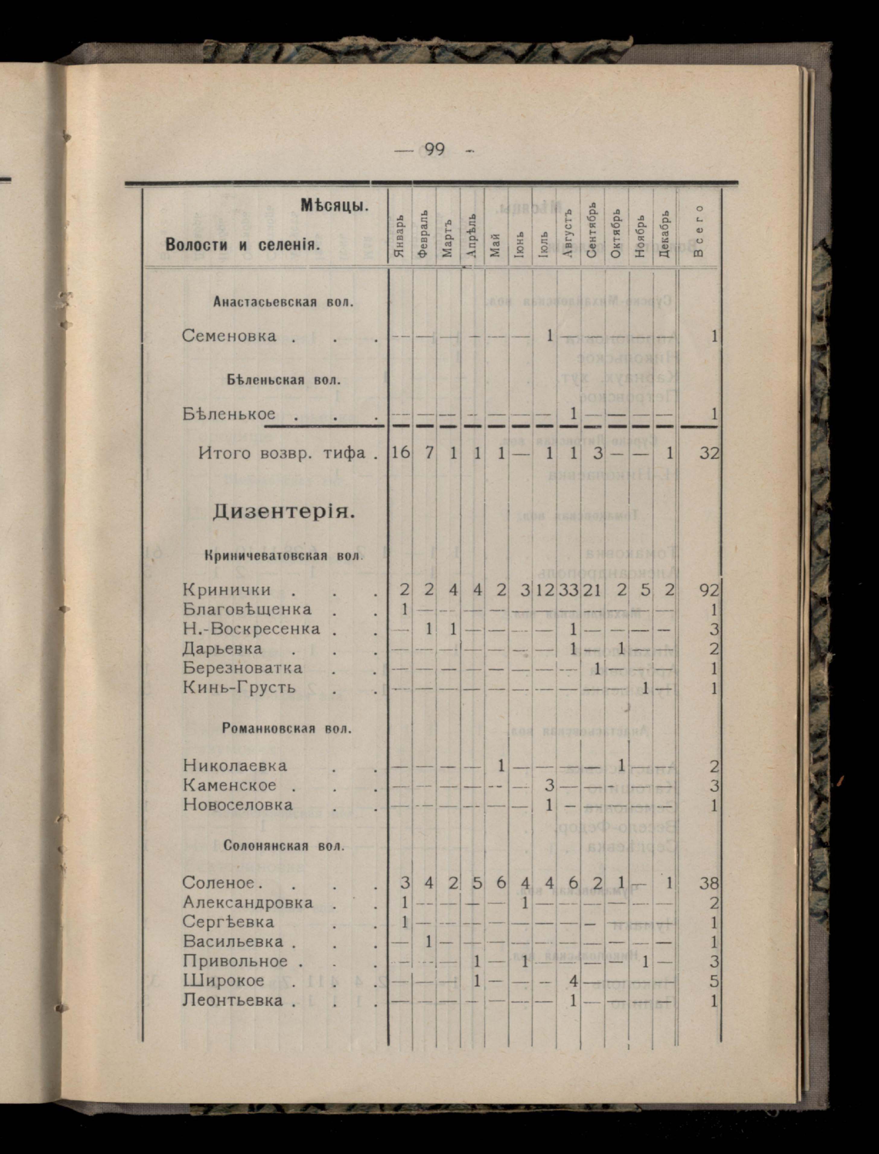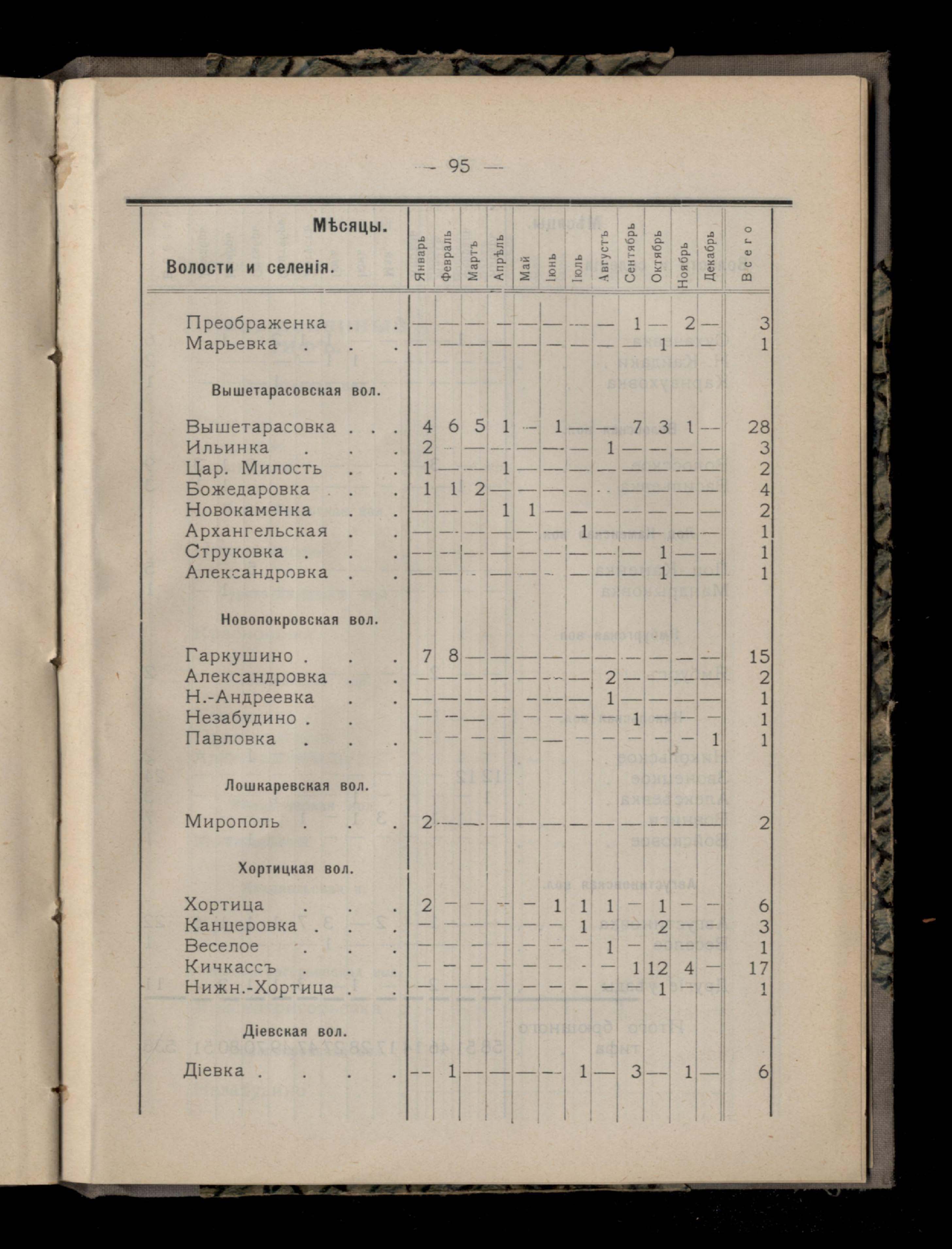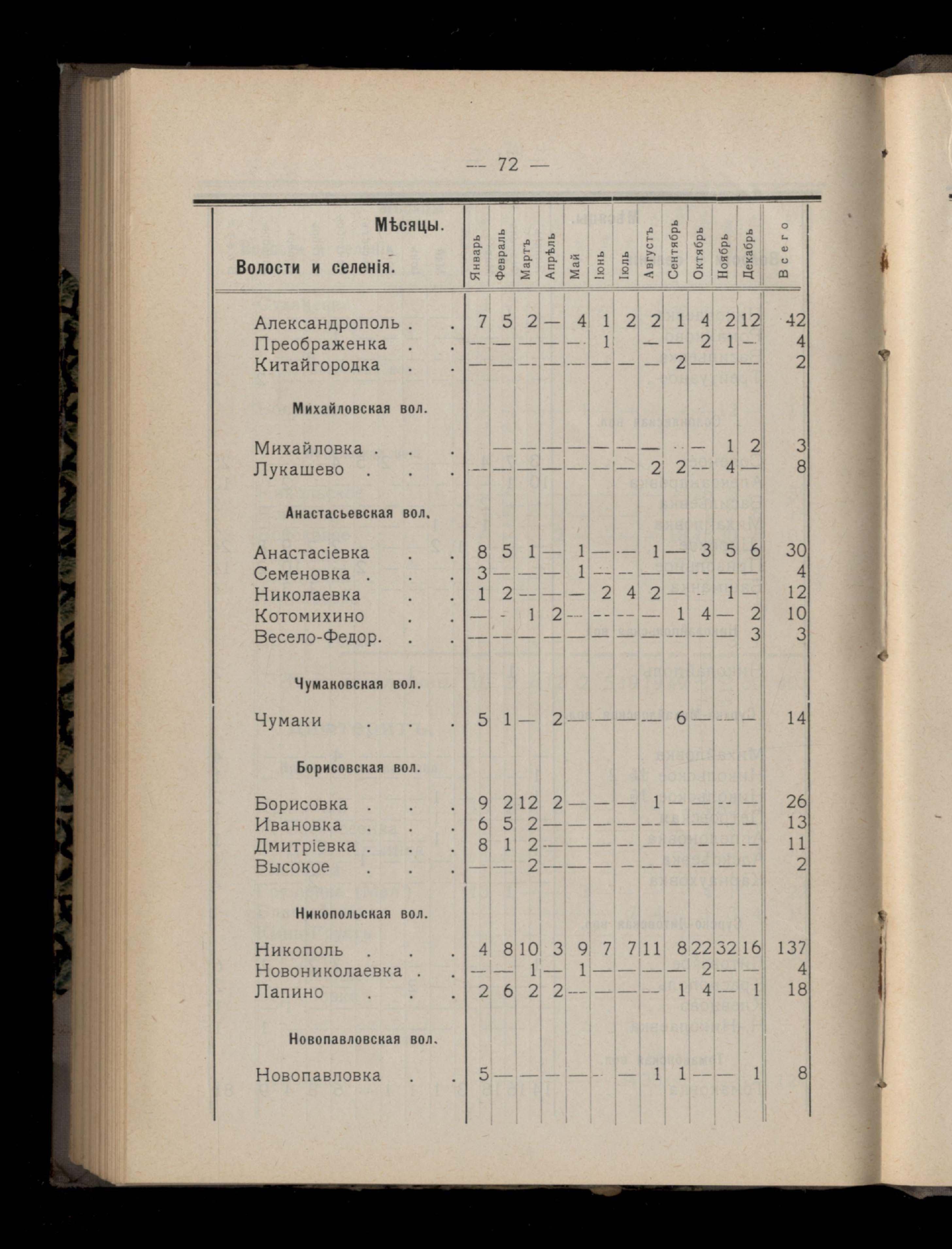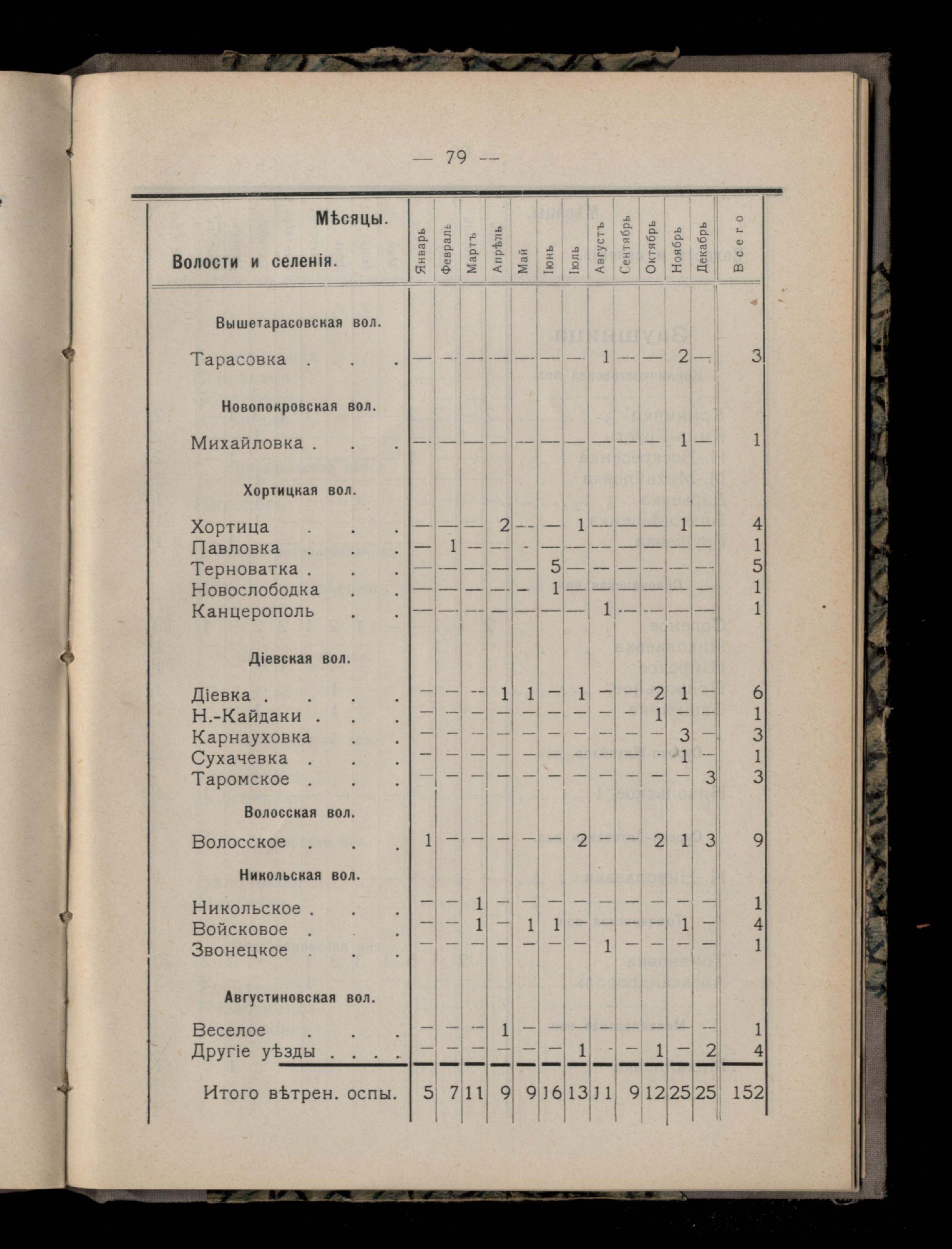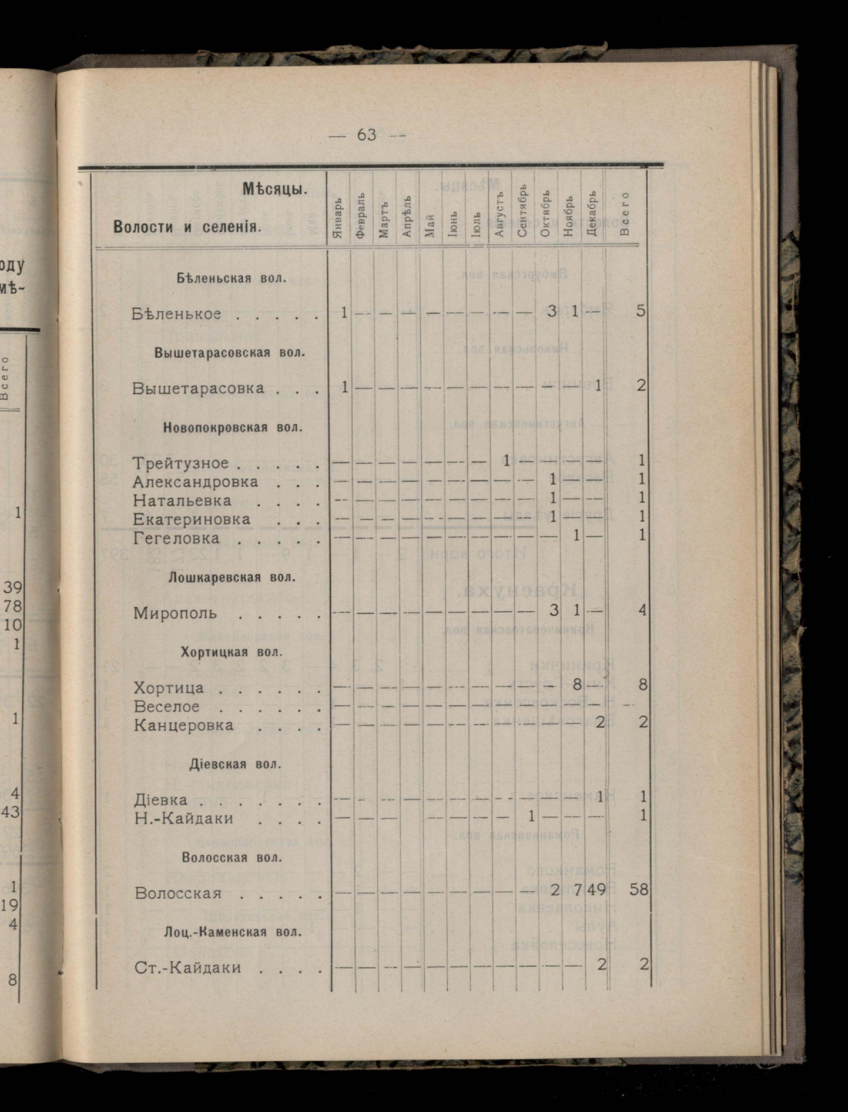 Таблица 4-я. Распределеніе важнейших заразныхъ заболеваній въ 1911 году по населеннымъ пунктамъ Екатеринославскаго уезда и по месяцамъ года
