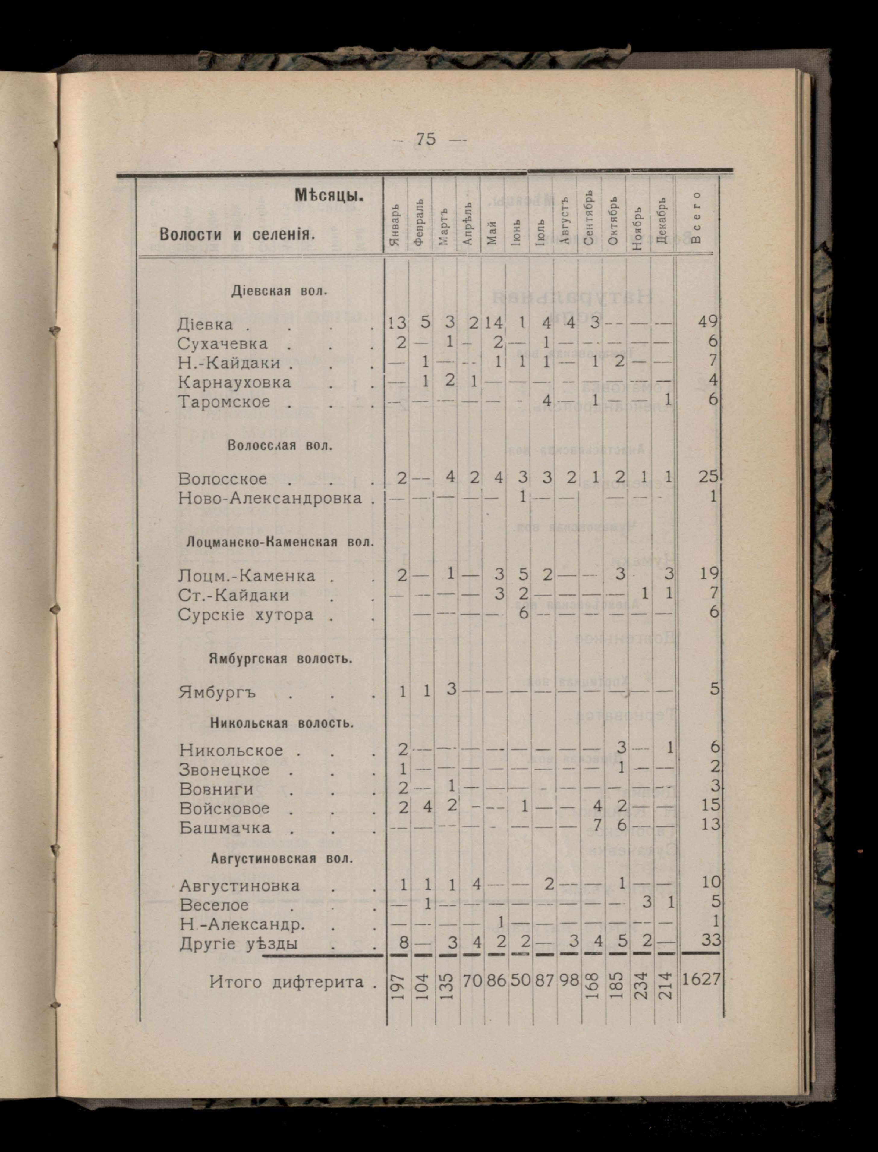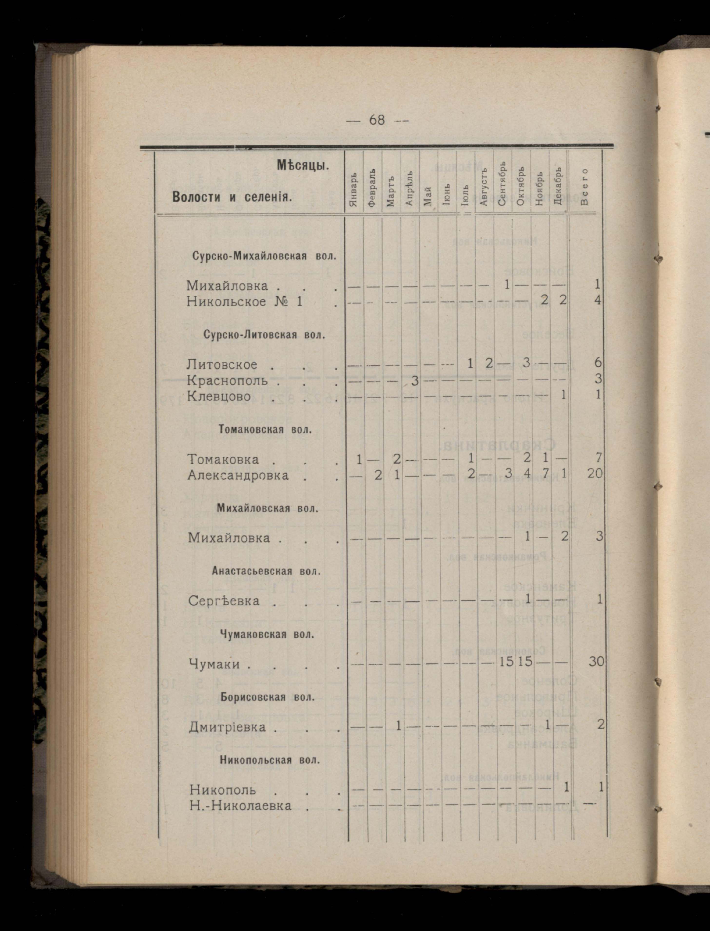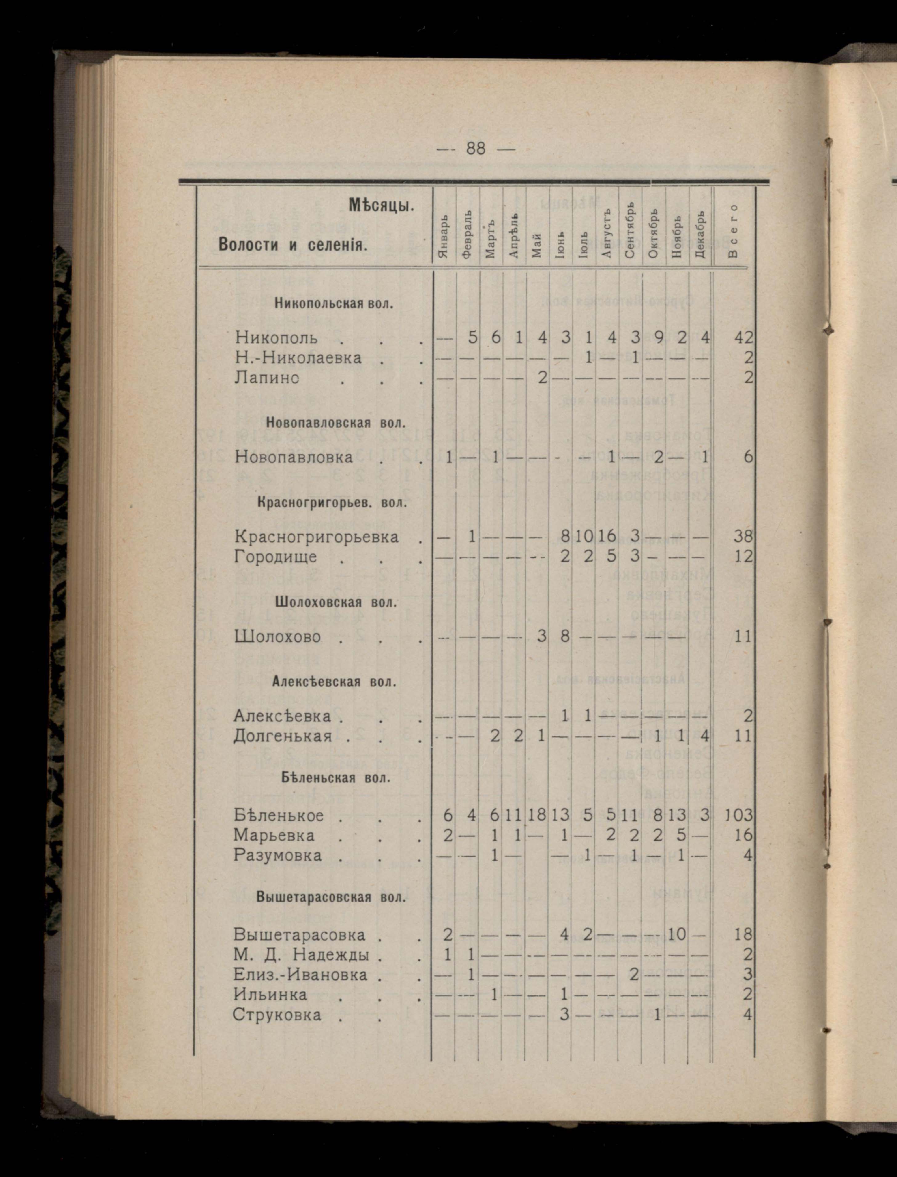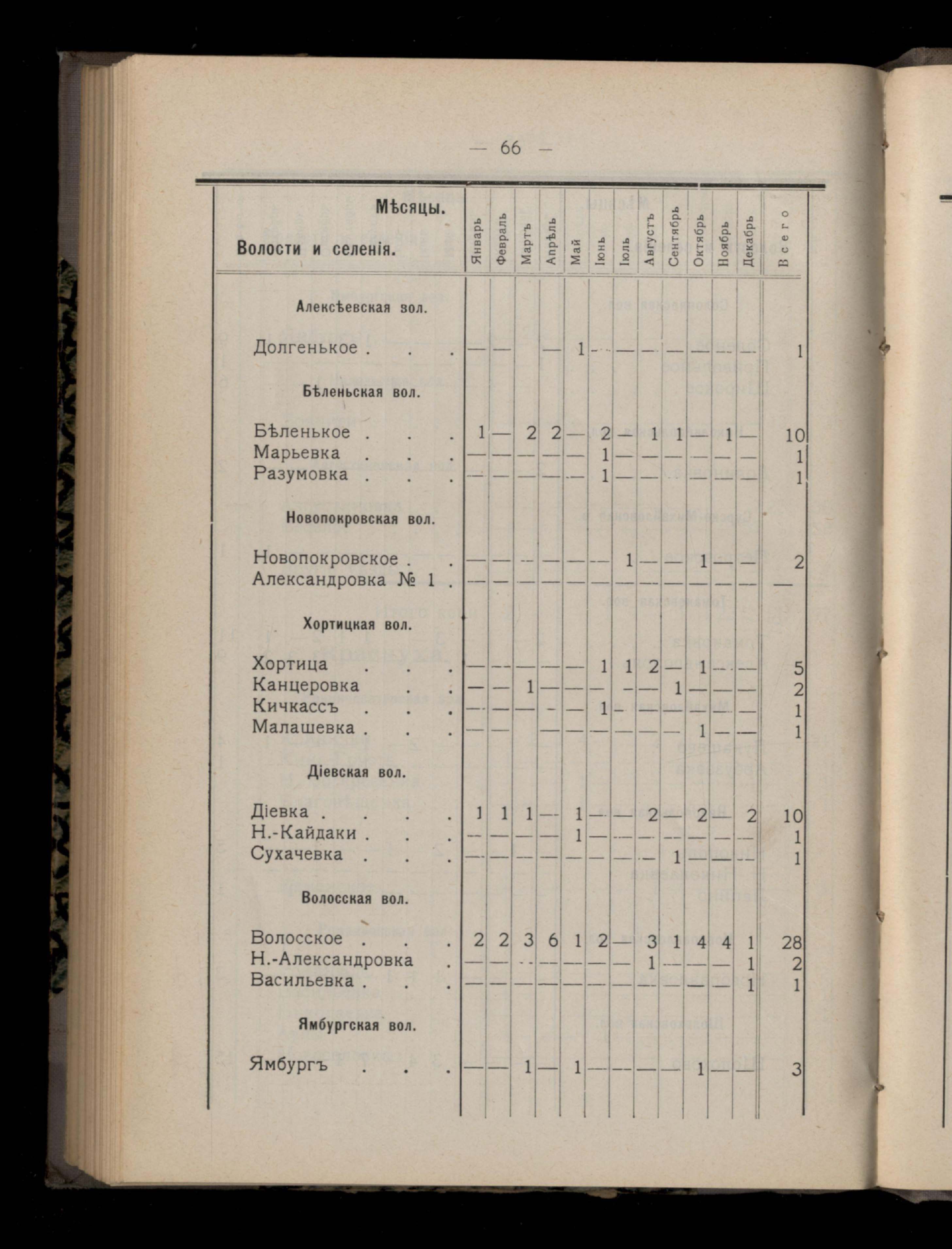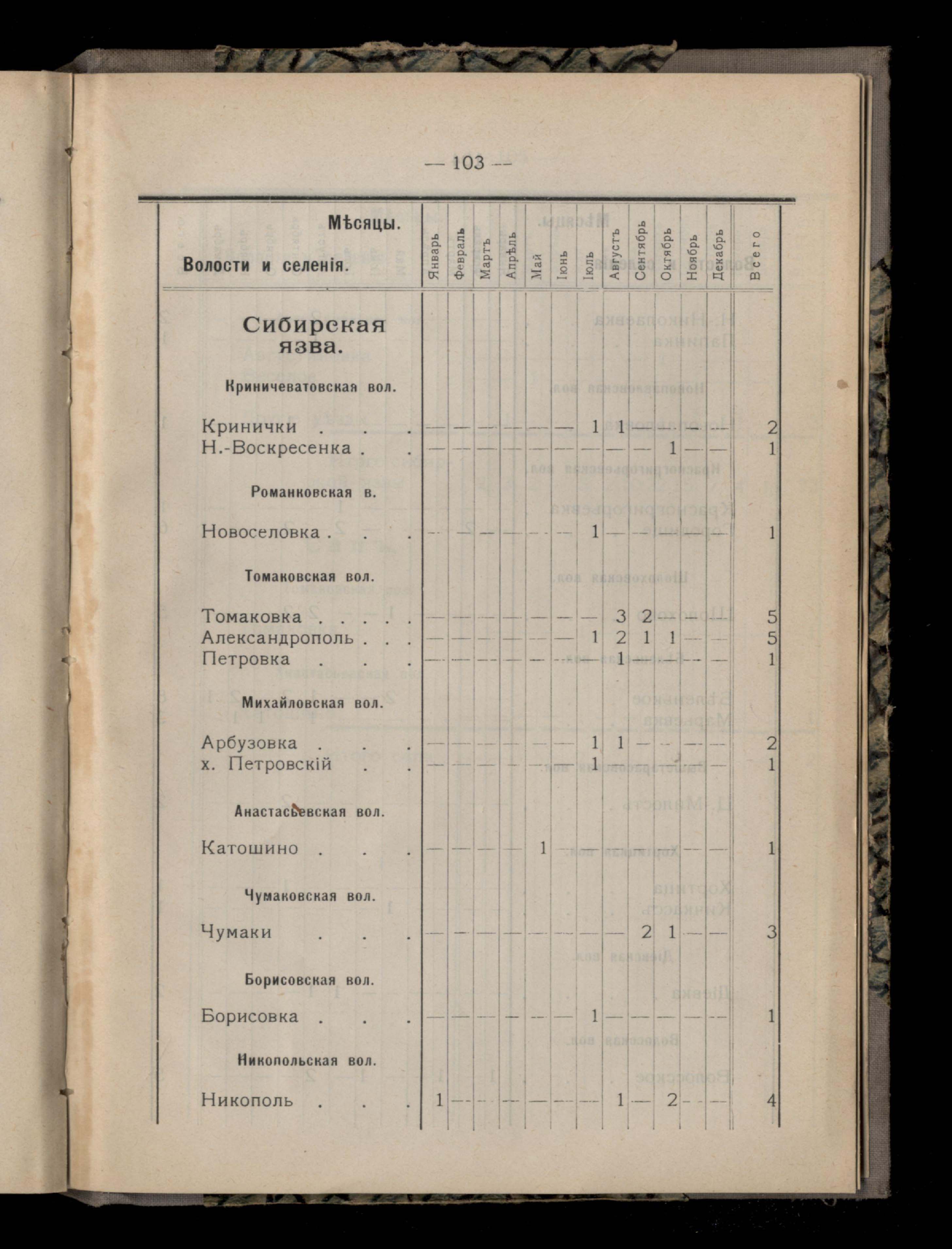 Таблица 4-я. Распределеніе важнейших заразныхъ заболеваній въ 1911 году по населеннымъ пунктамъ Екатеринославскаго уезда и по месяцамъ года