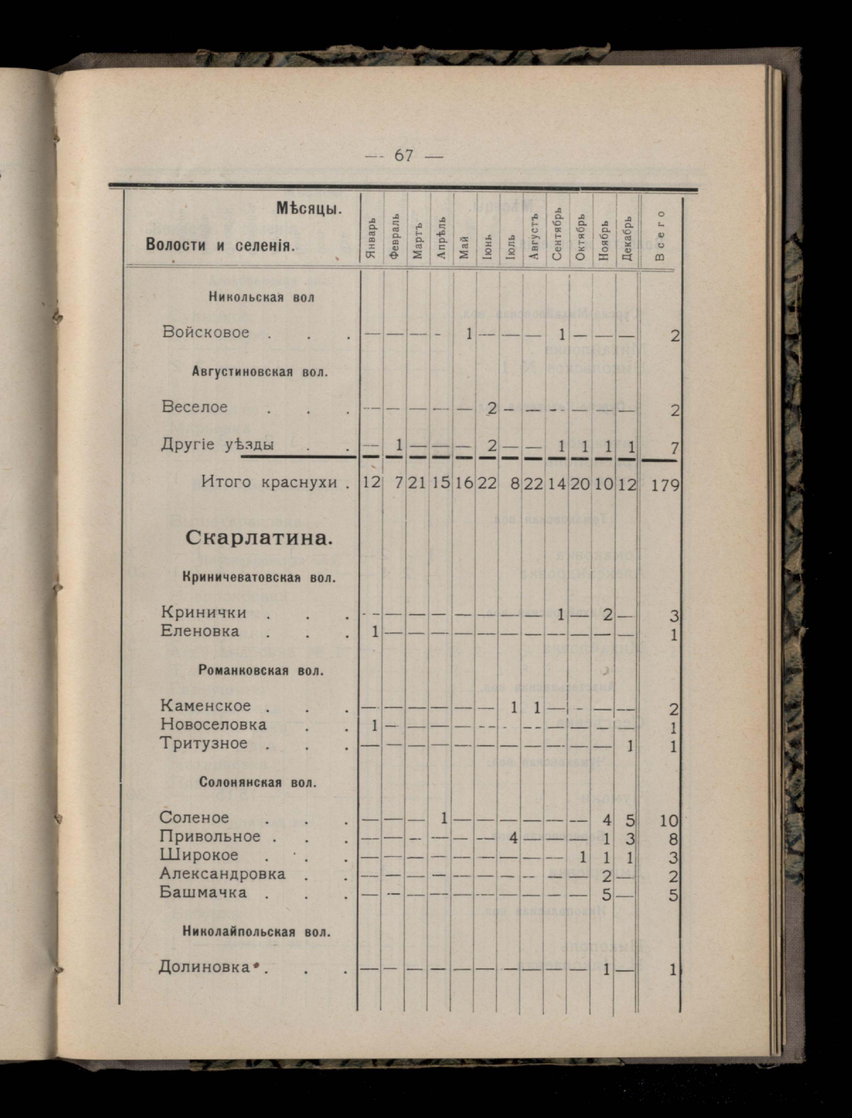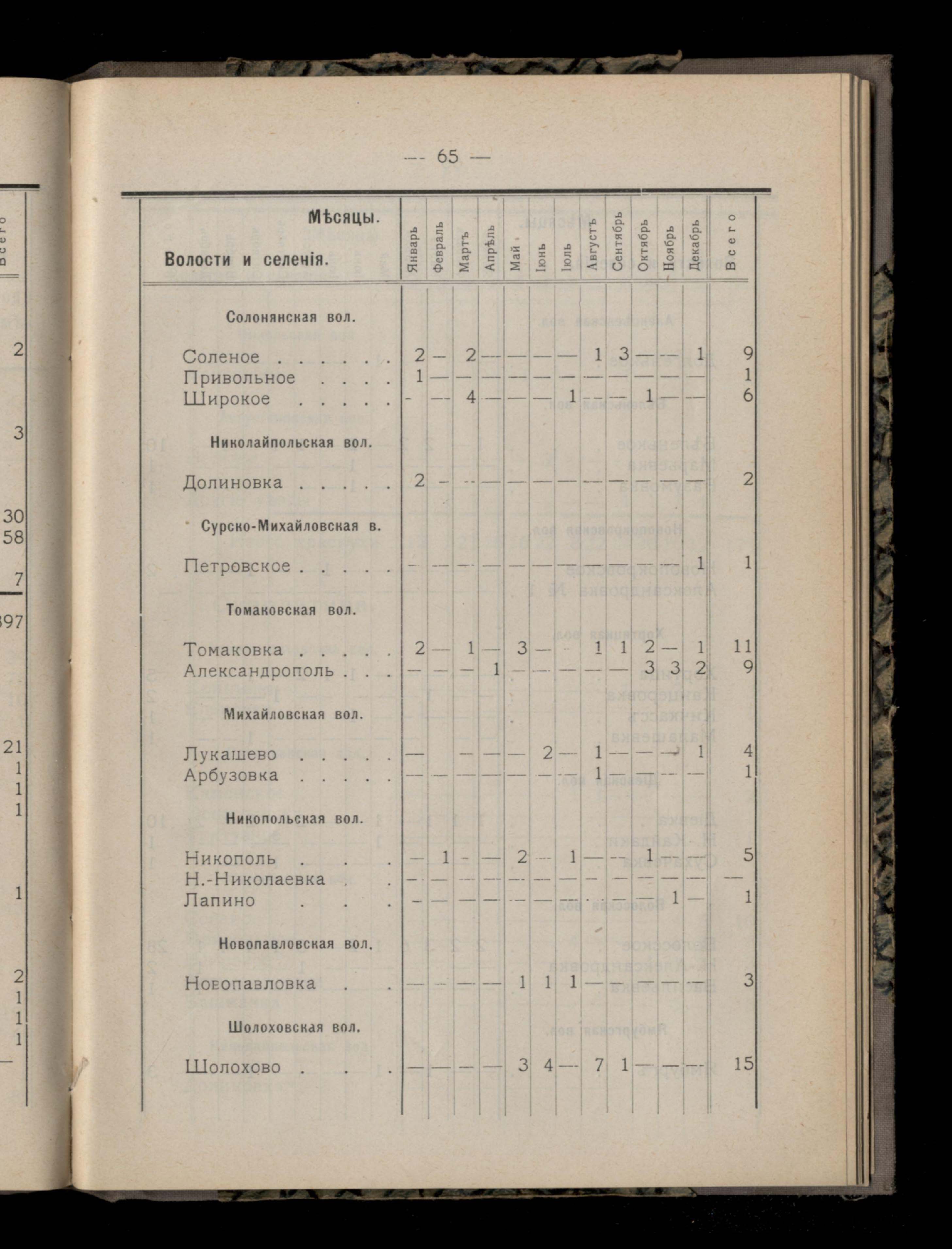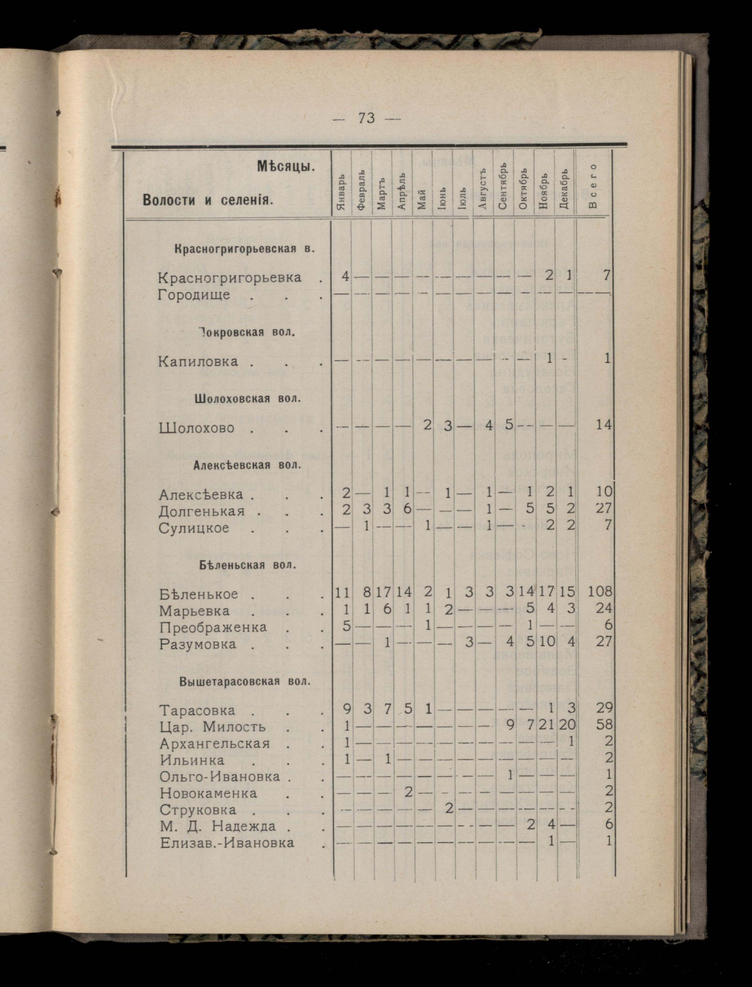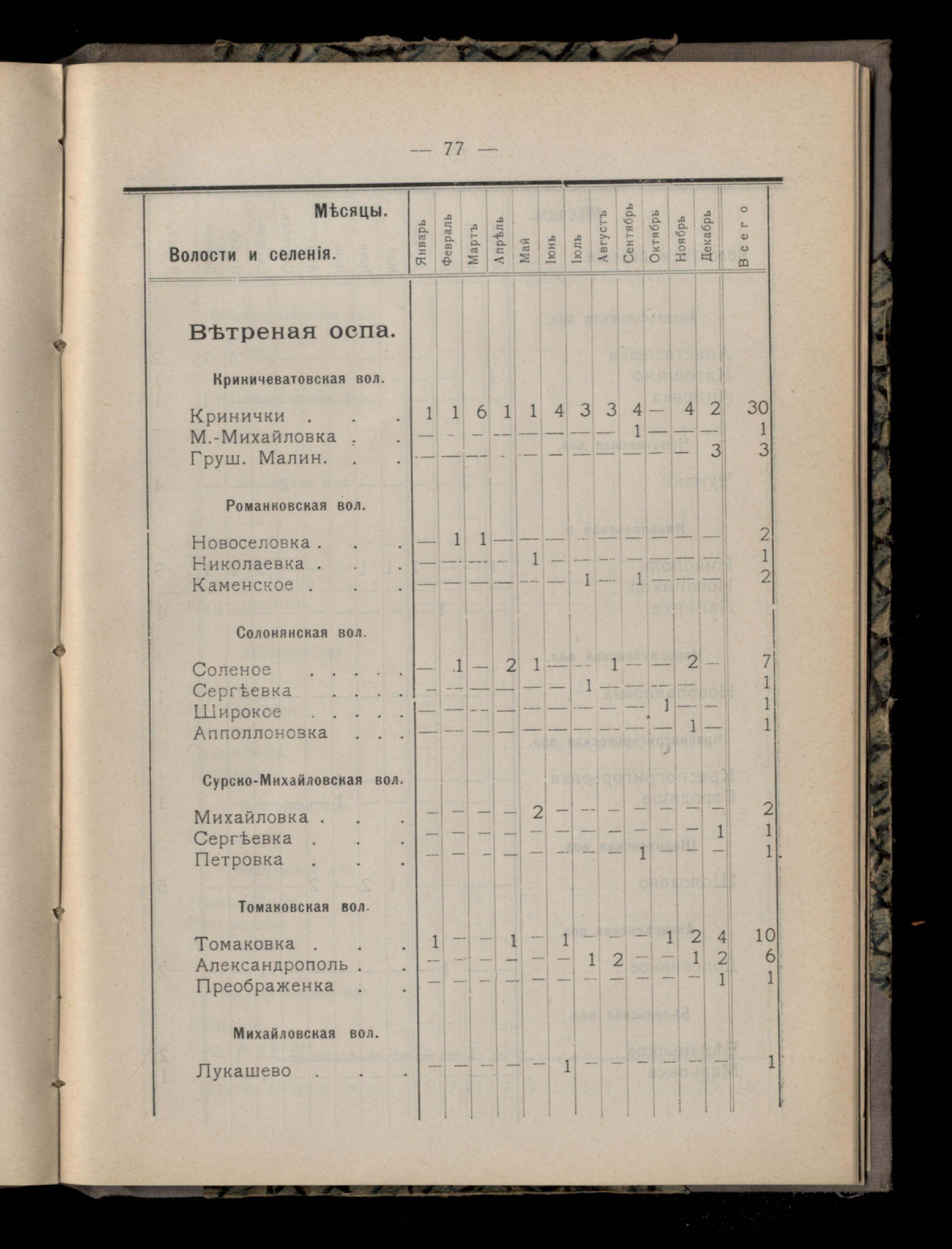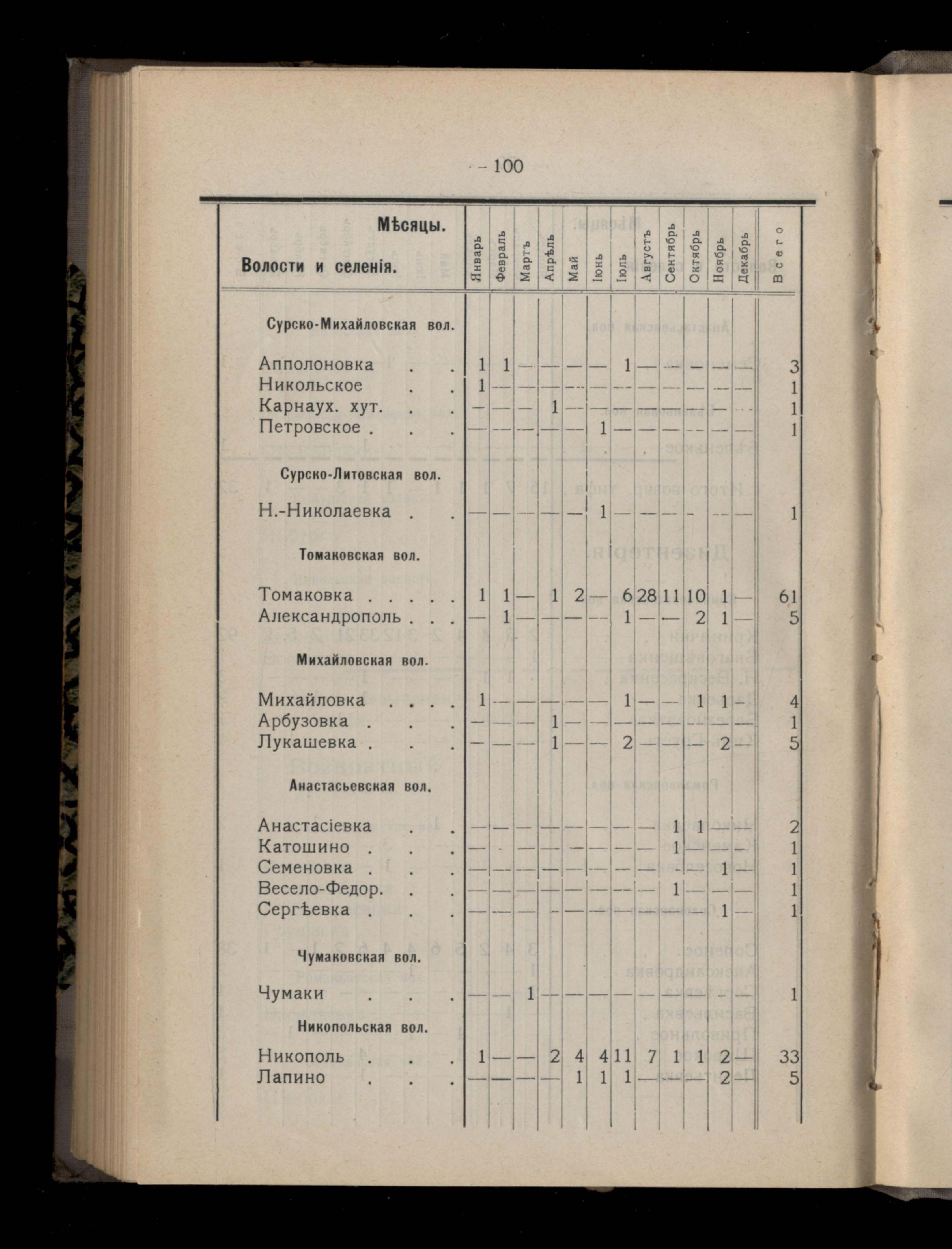 Таблица 4-я. Распределеніе важнейших заразныхъ заболеваній въ 1911 году по населеннымъ пунктамъ Екатеринославскаго уезда и по месяцамъ года