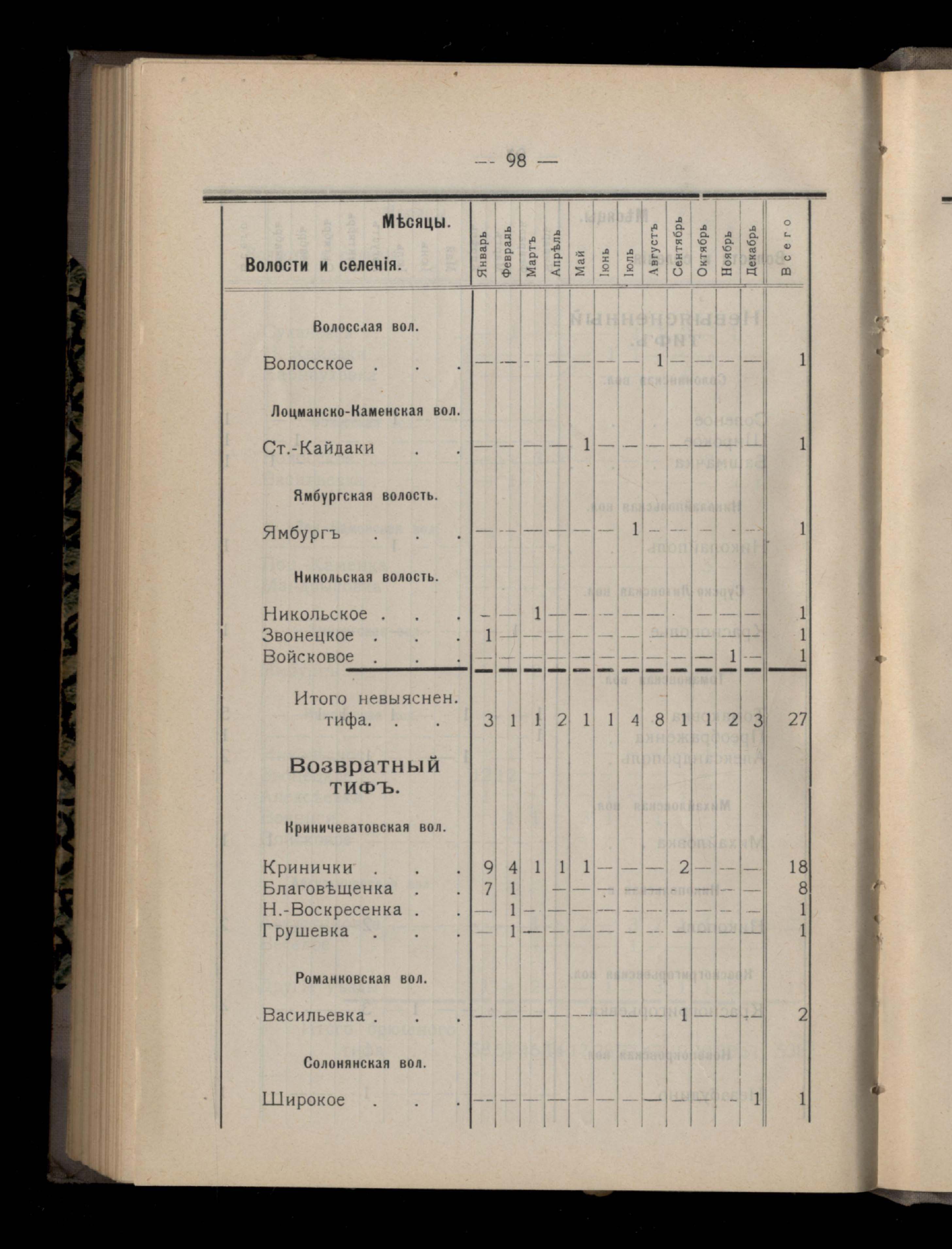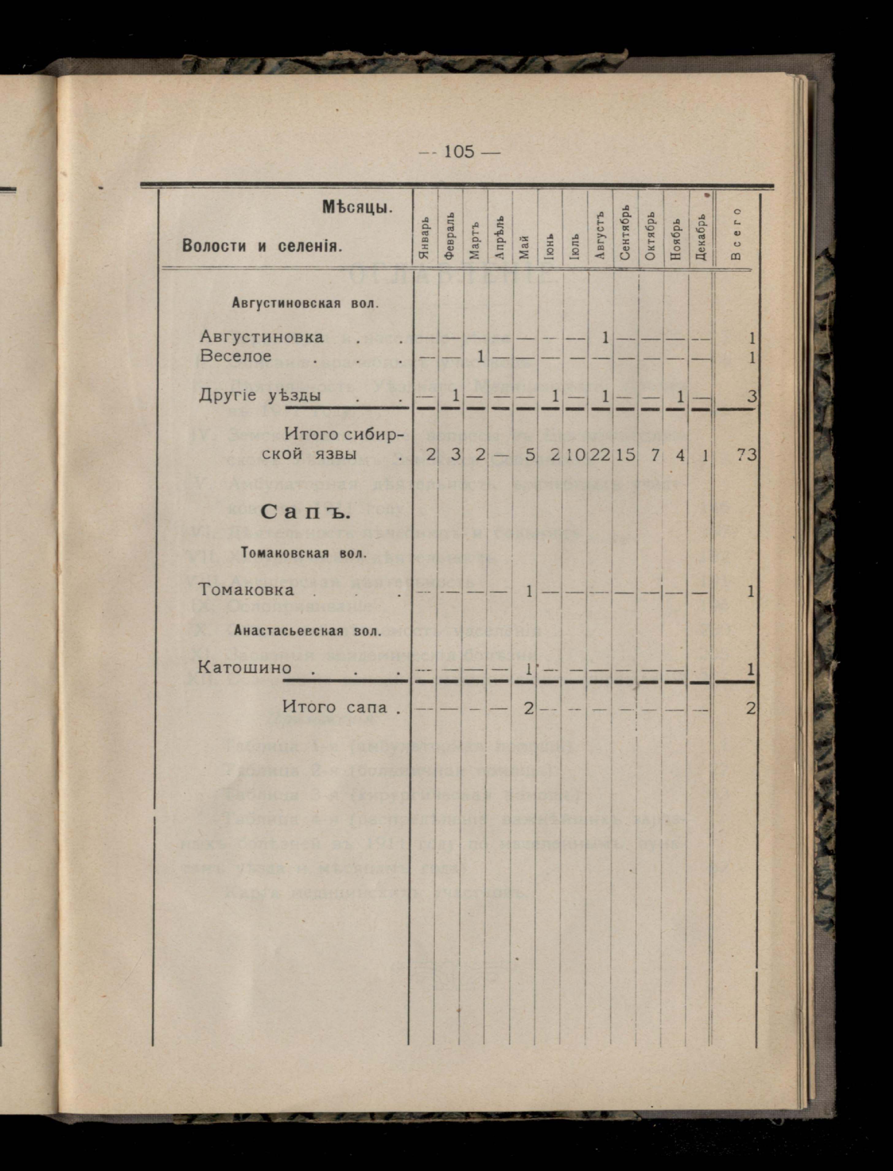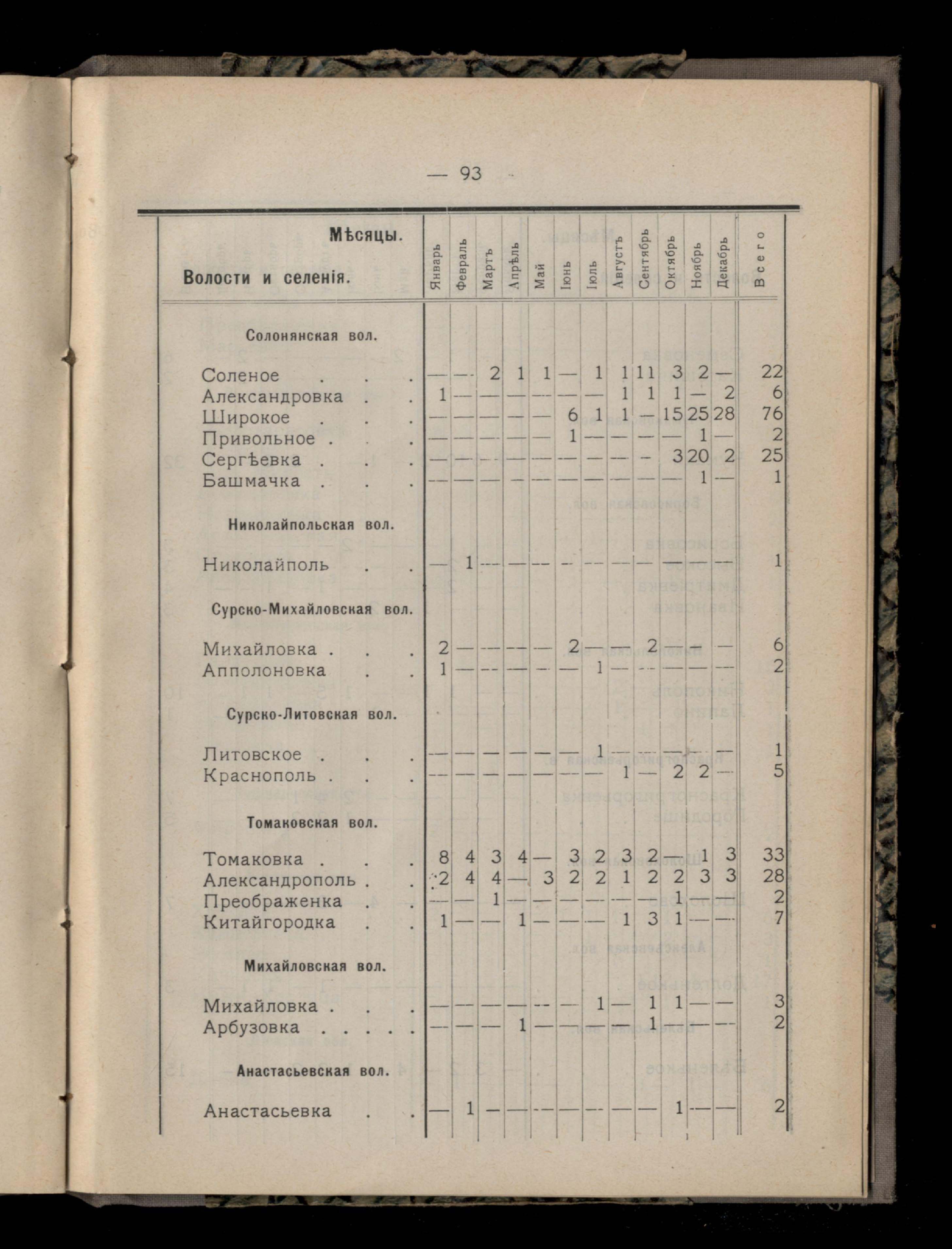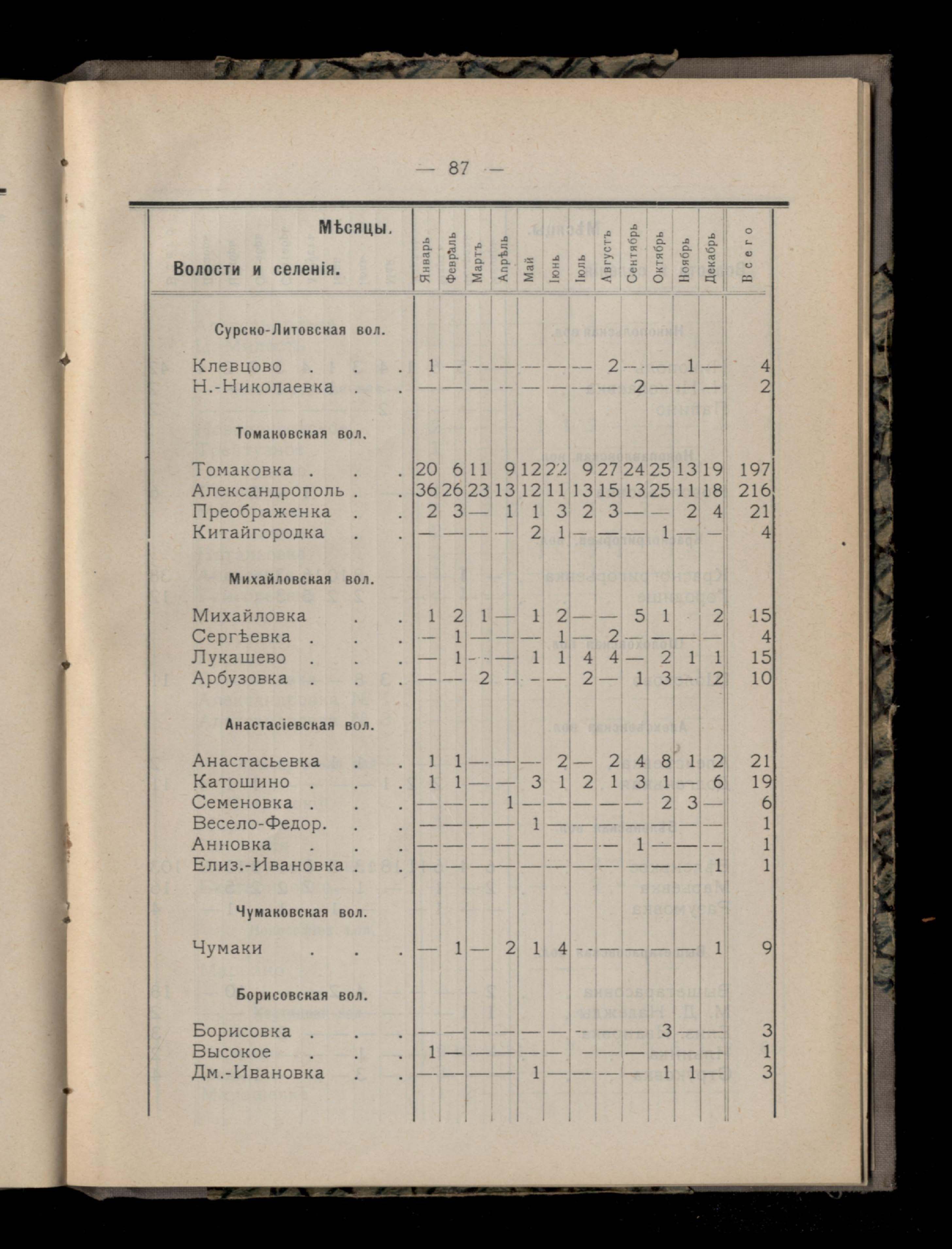 Таблица 4-я. Распределеніе важнейших заразныхъ заболеваній въ 1911 году по населеннымъ пунктамъ Екатеринославскаго уезда и по месяцамъ года