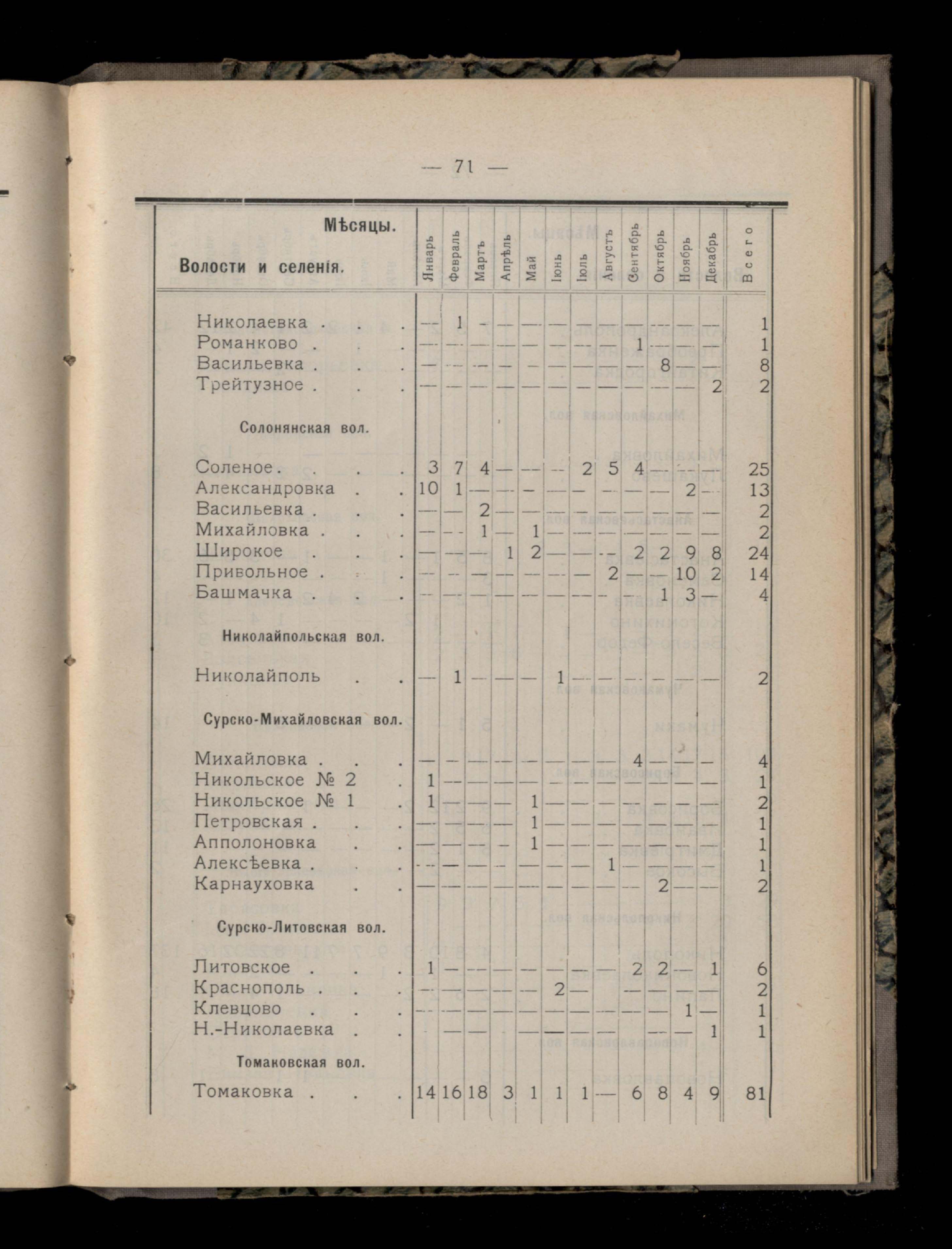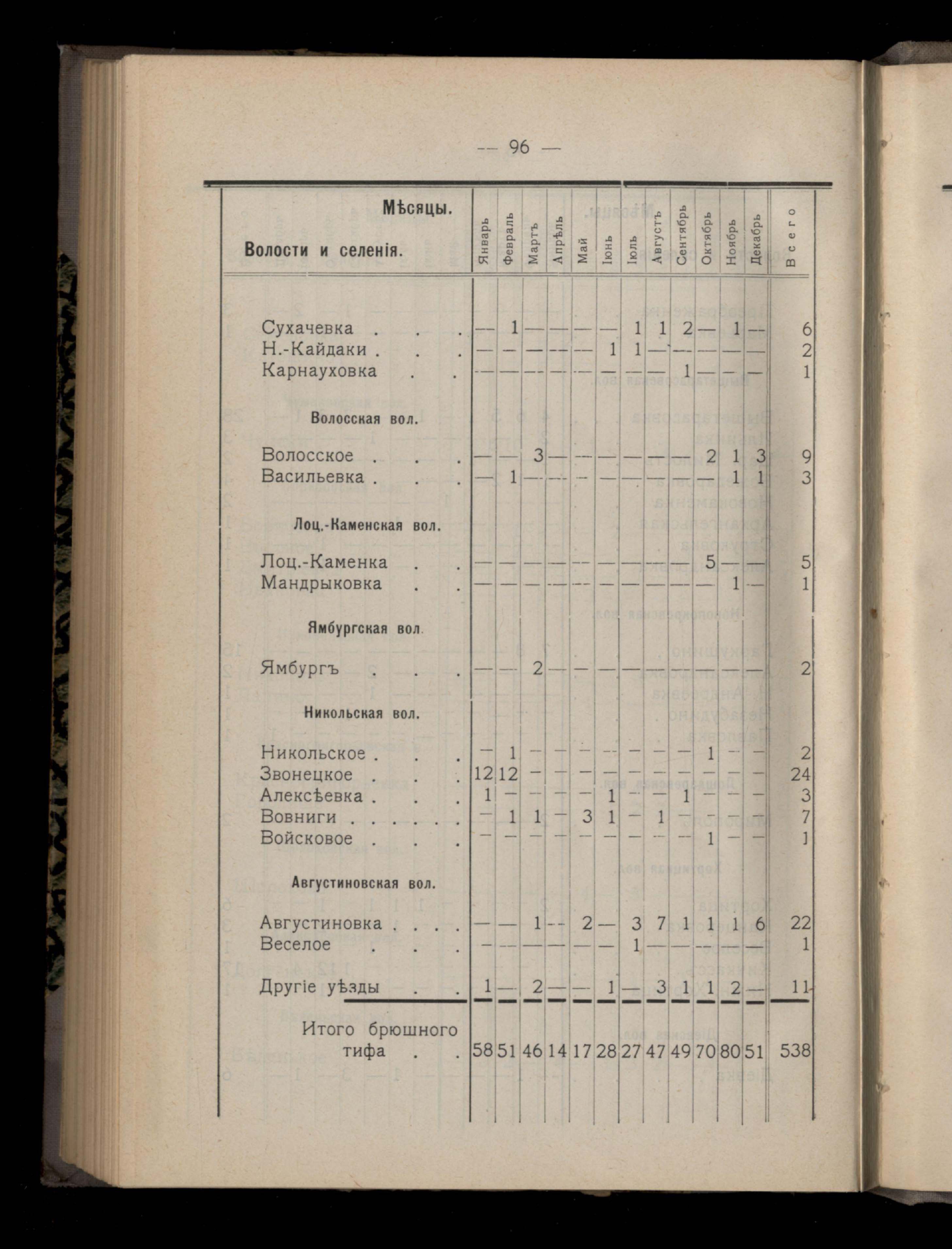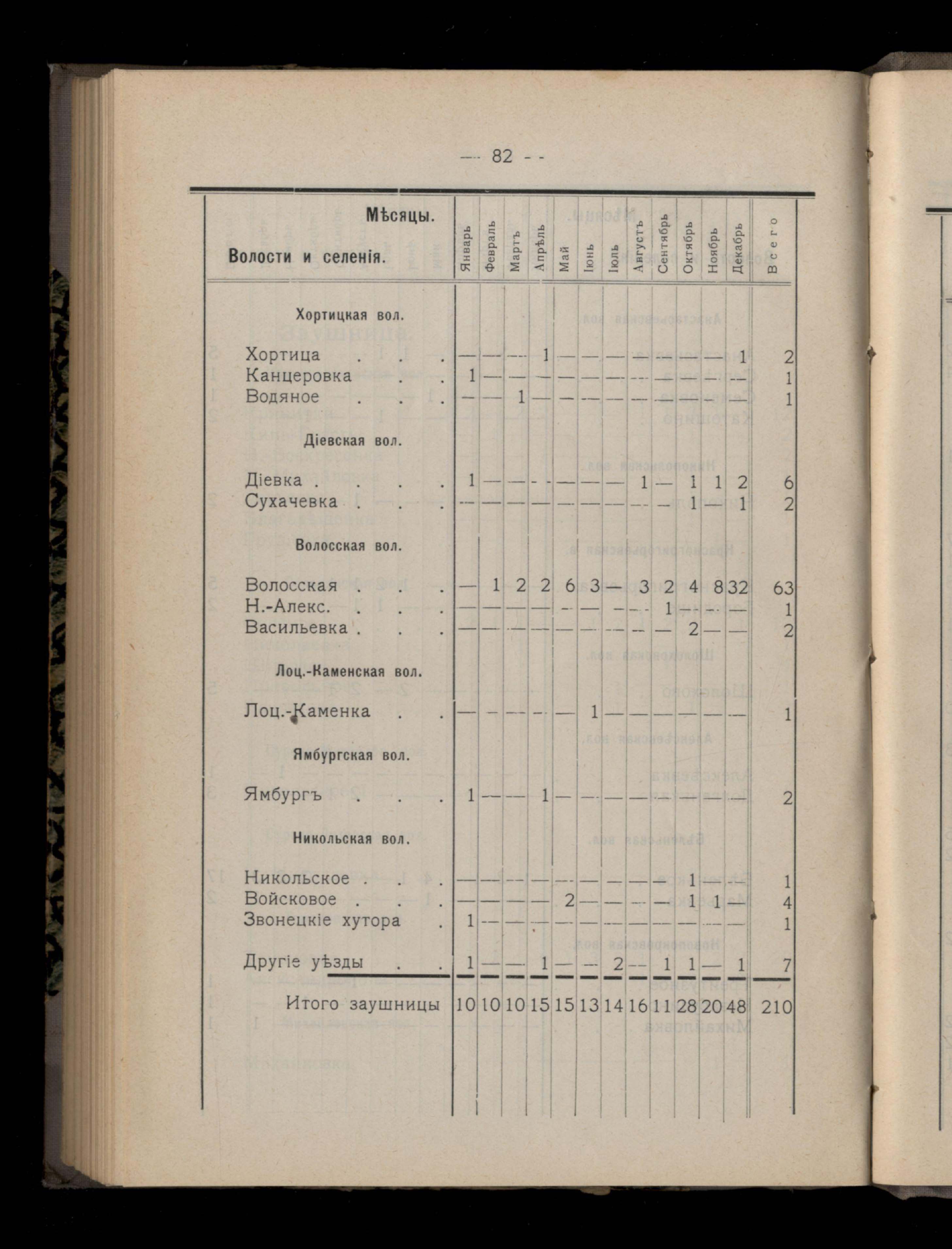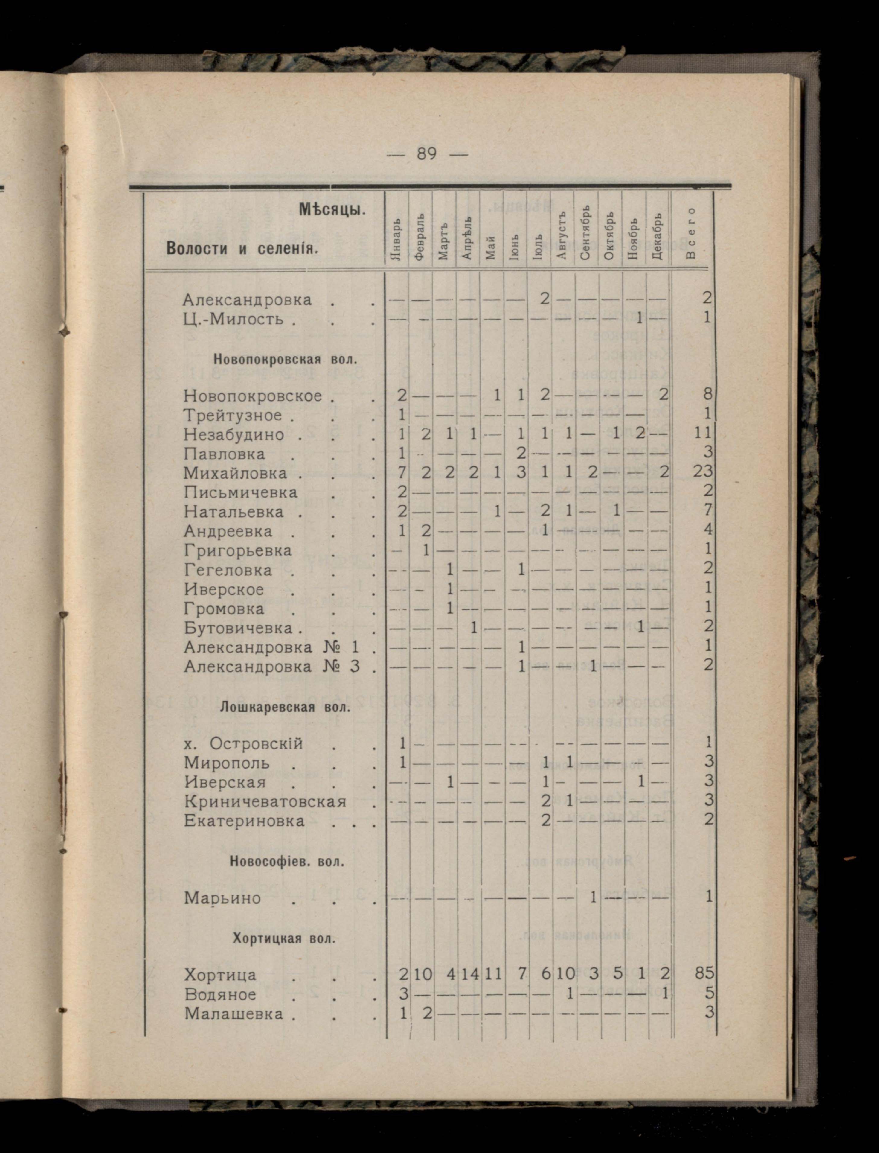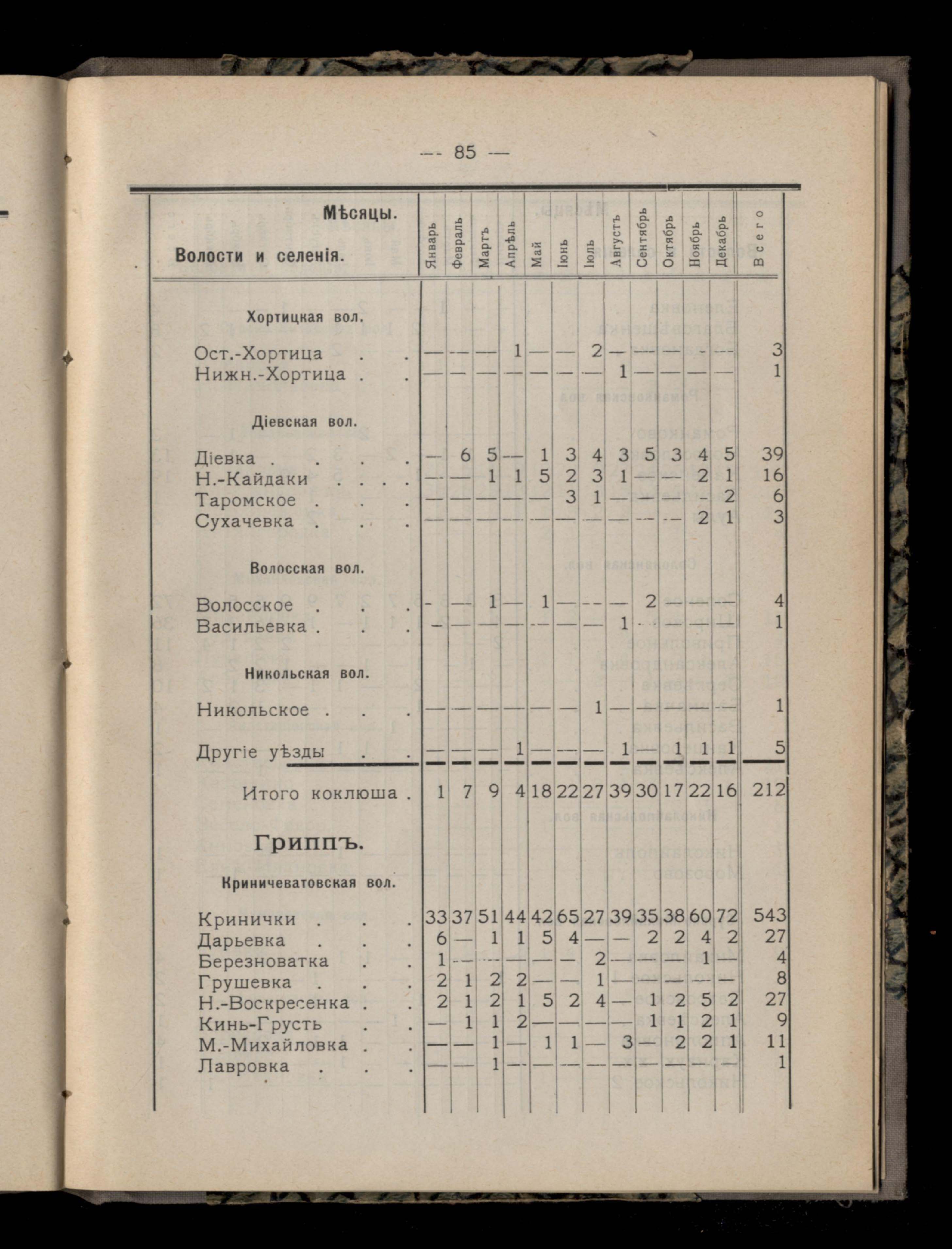 Таблица 4-я. Распределеніе важнейших заразныхъ заболеваній въ 1911 году по населеннымъ пунктамъ Екатеринославскаго уезда и по месяцамъ года
