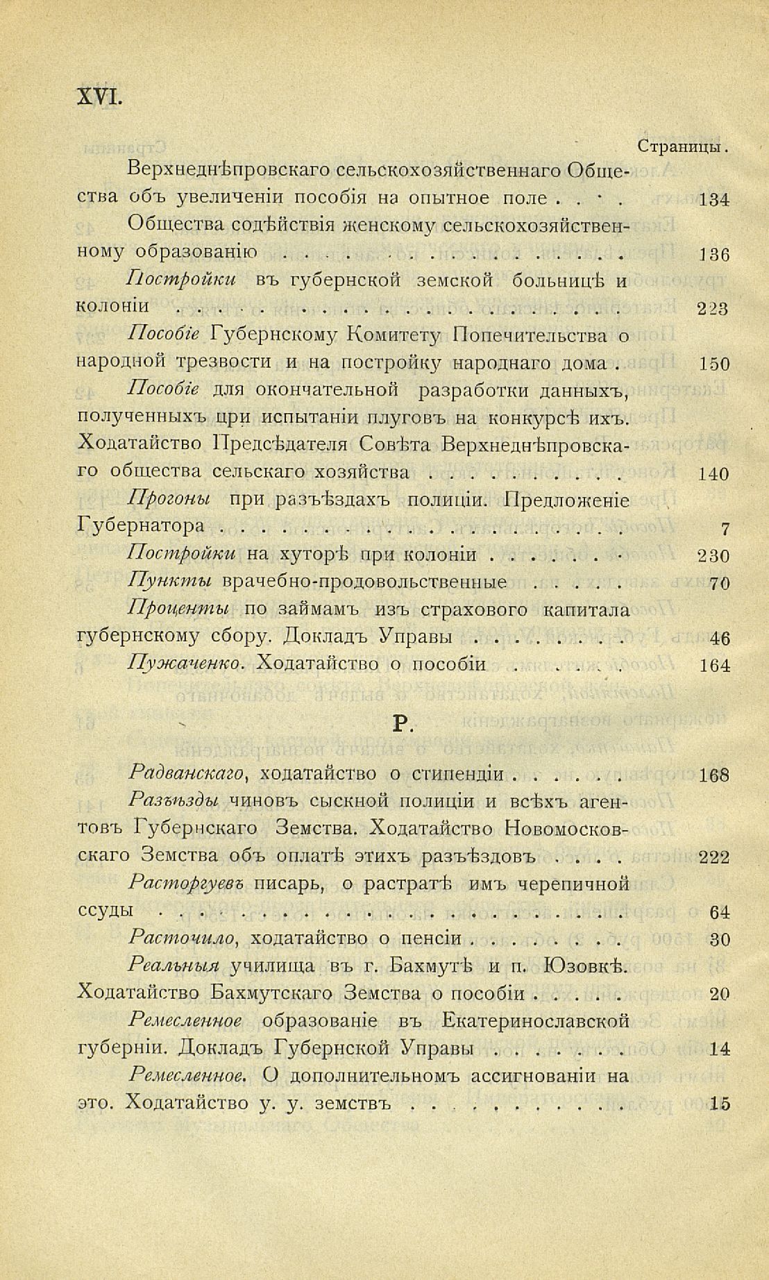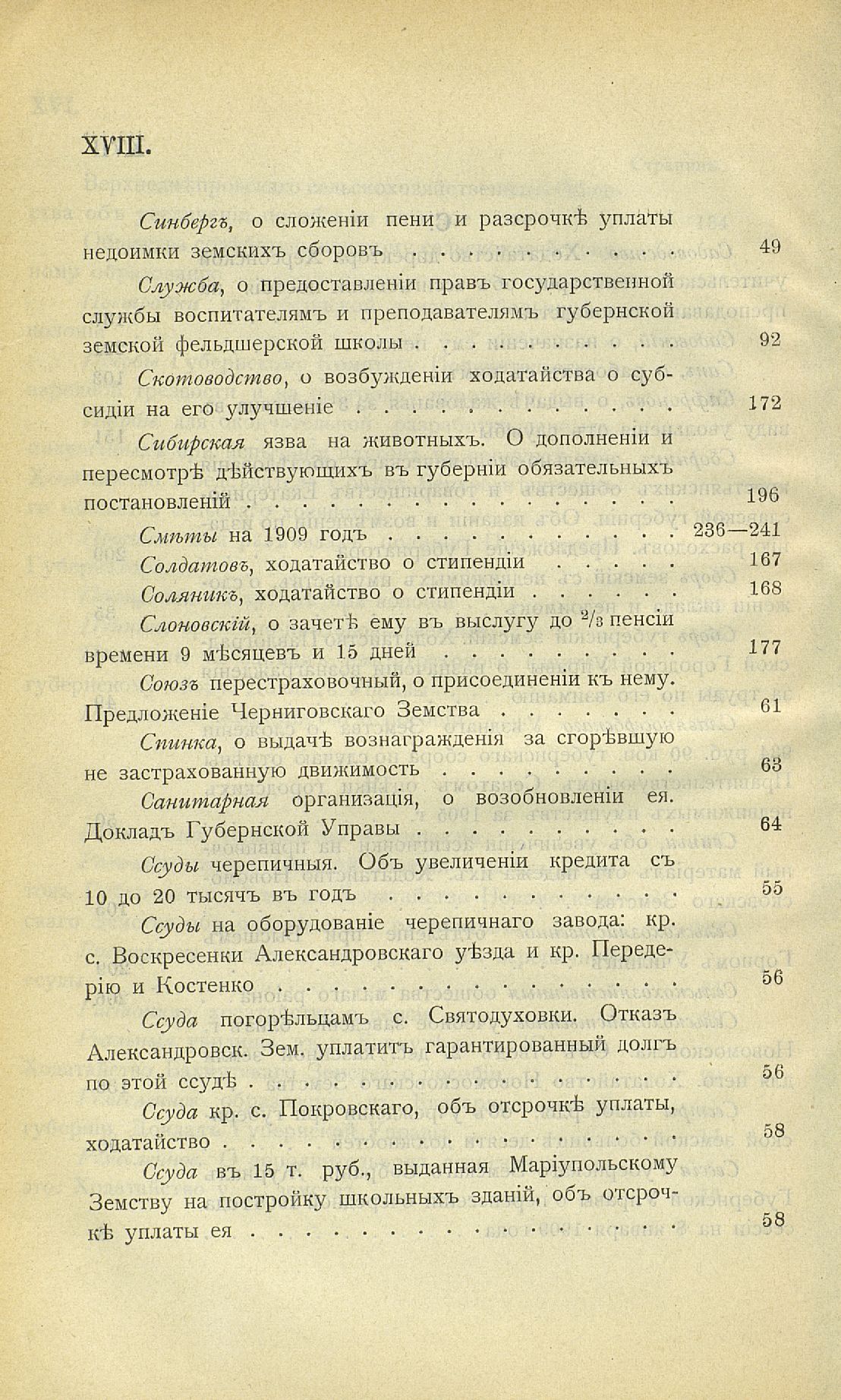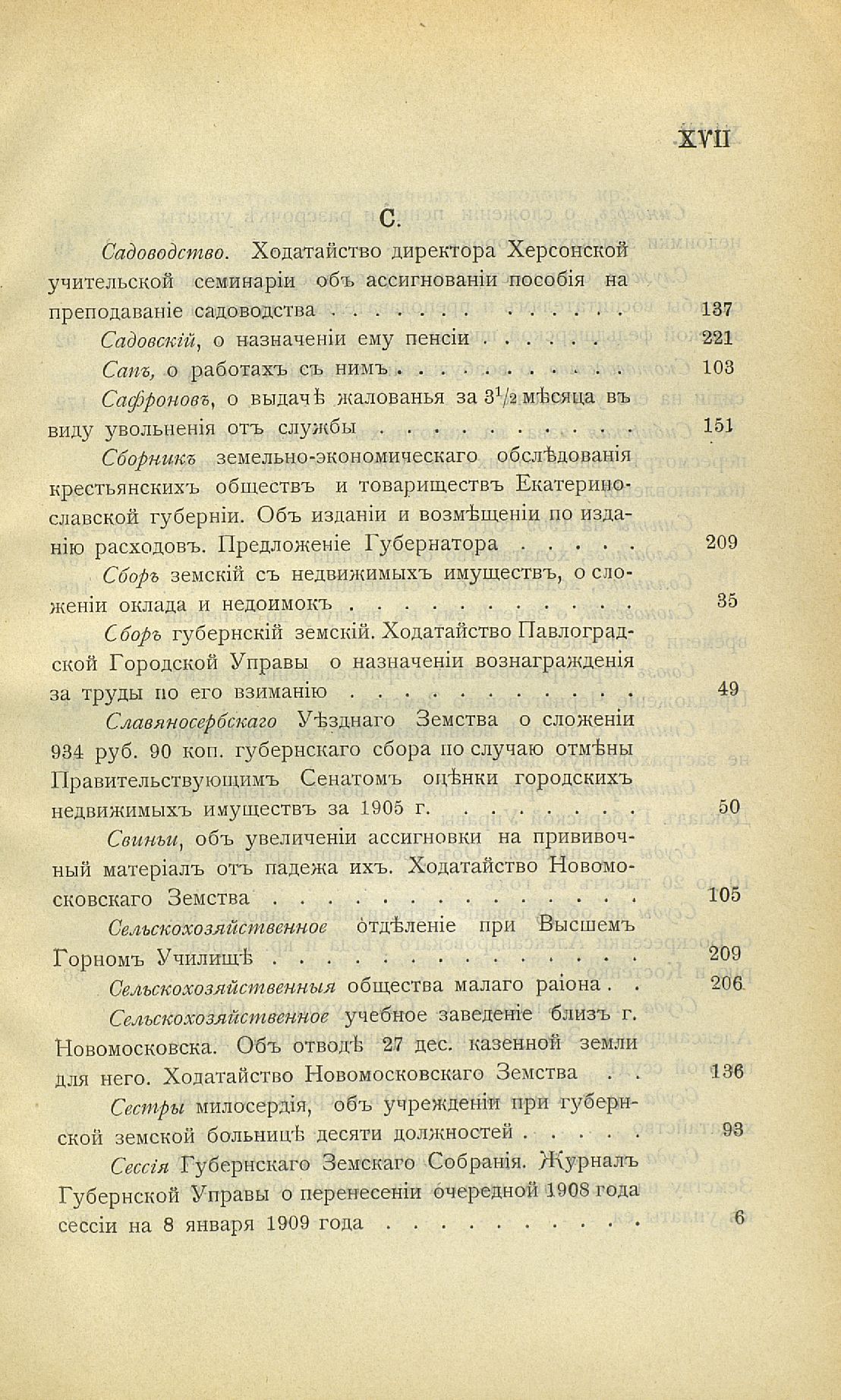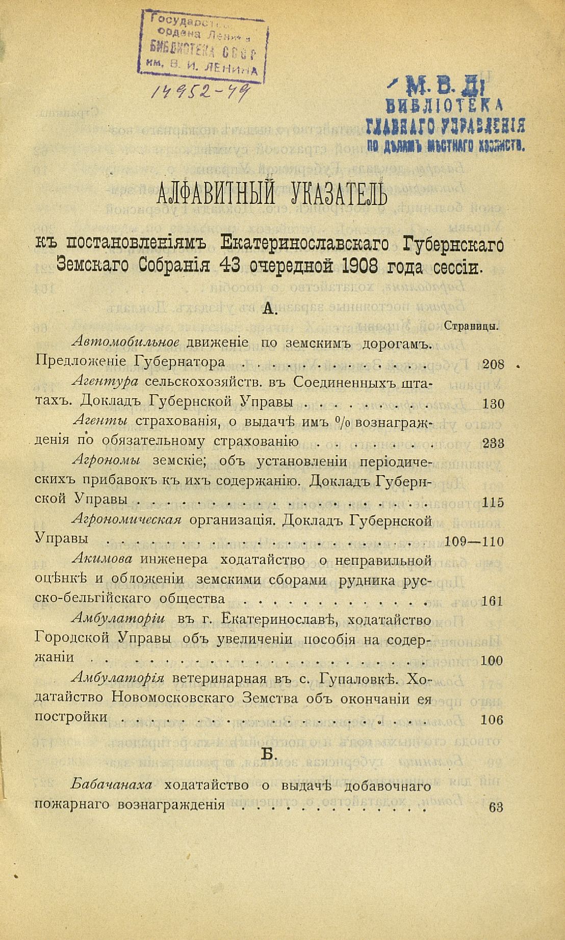Алфавитный указатель къ постановленіямъ Екатеринославскаго Губернскаго Земскаго Собранія 43 очередной 1908 года сессіи