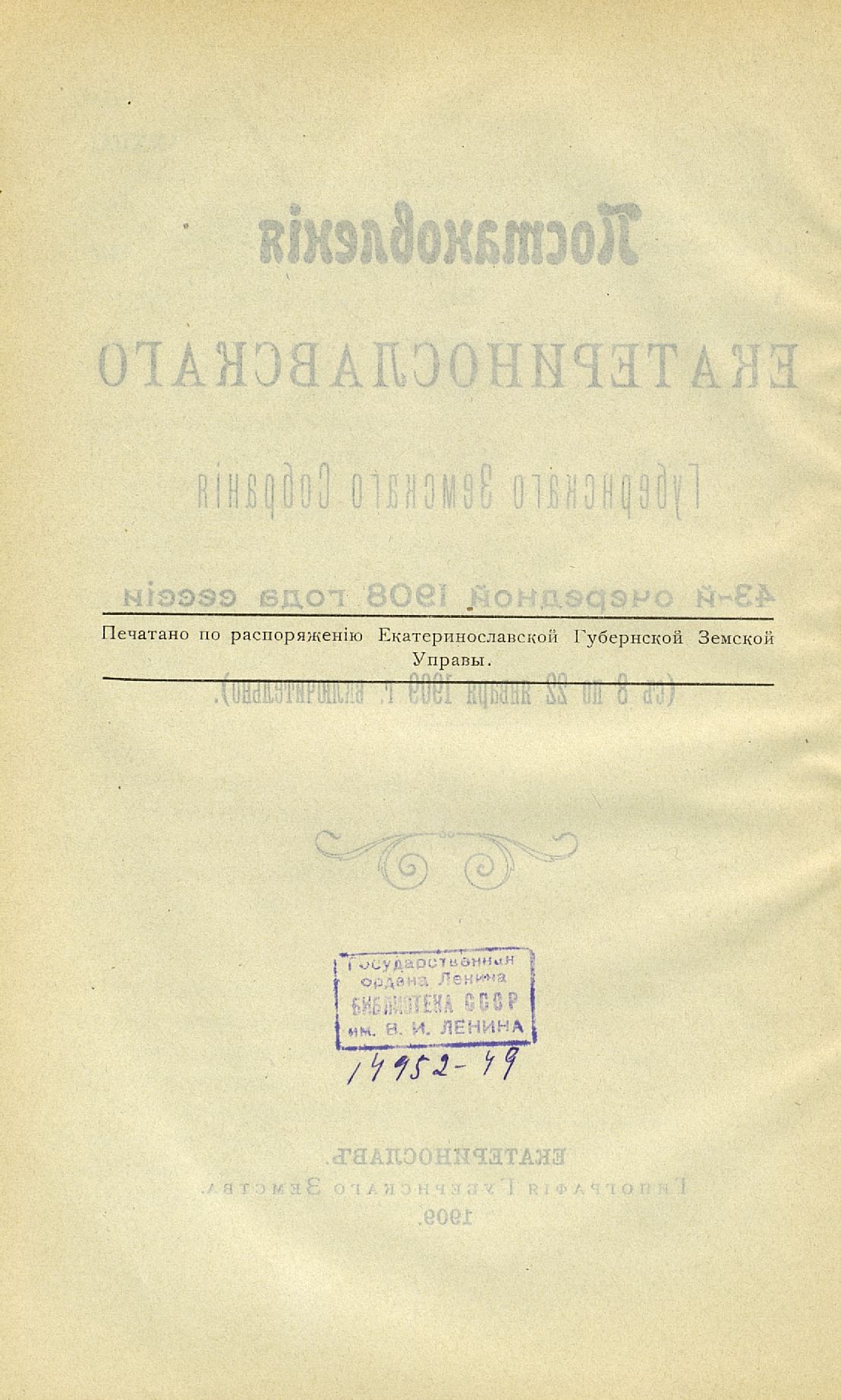 1. Постановленія Екатеринославскаго Губернскаго Земскаго Собранія 43-й очередной 1908 года сессіи (съ 8 по 22 января 1909 г. включительно)