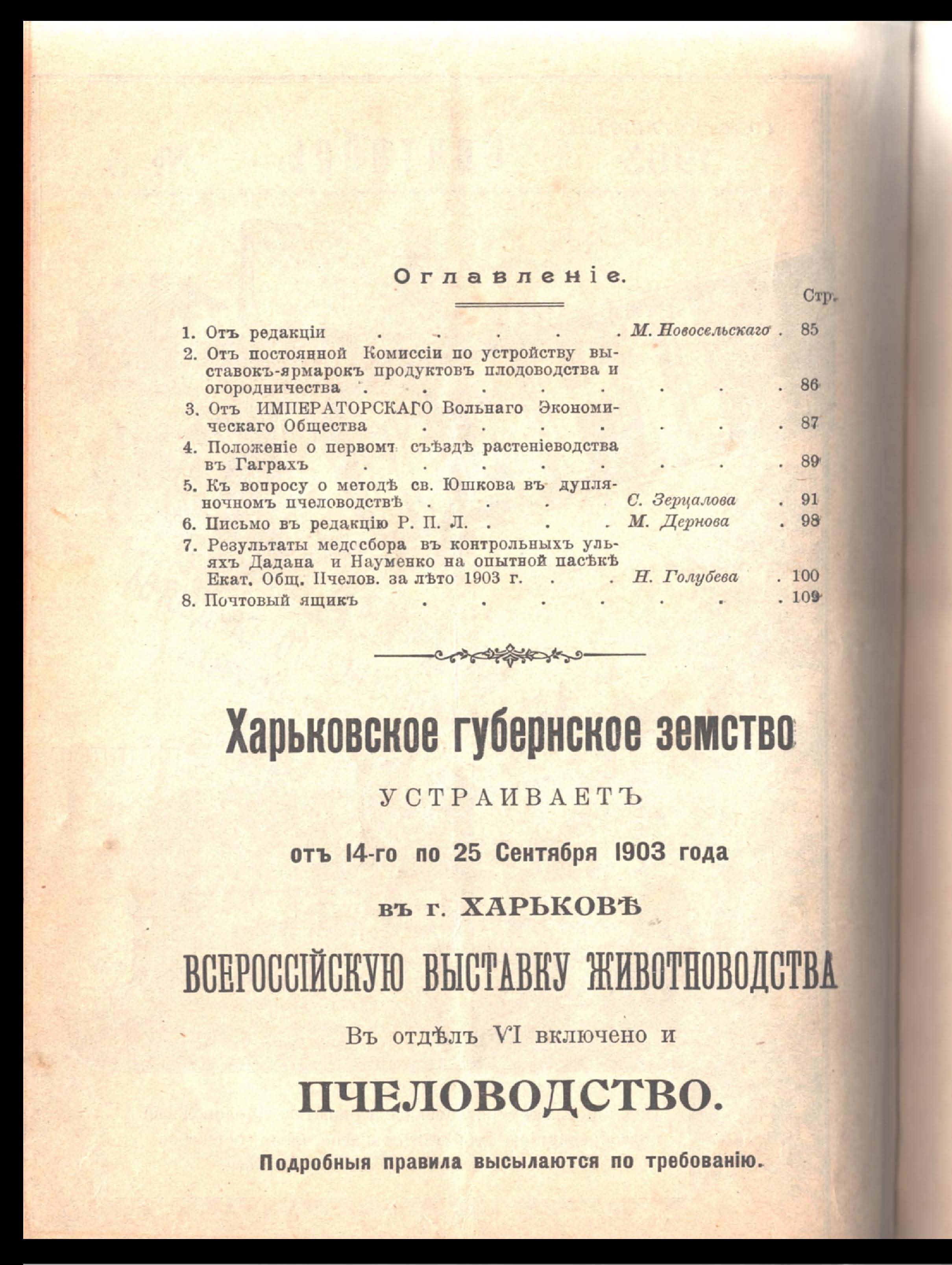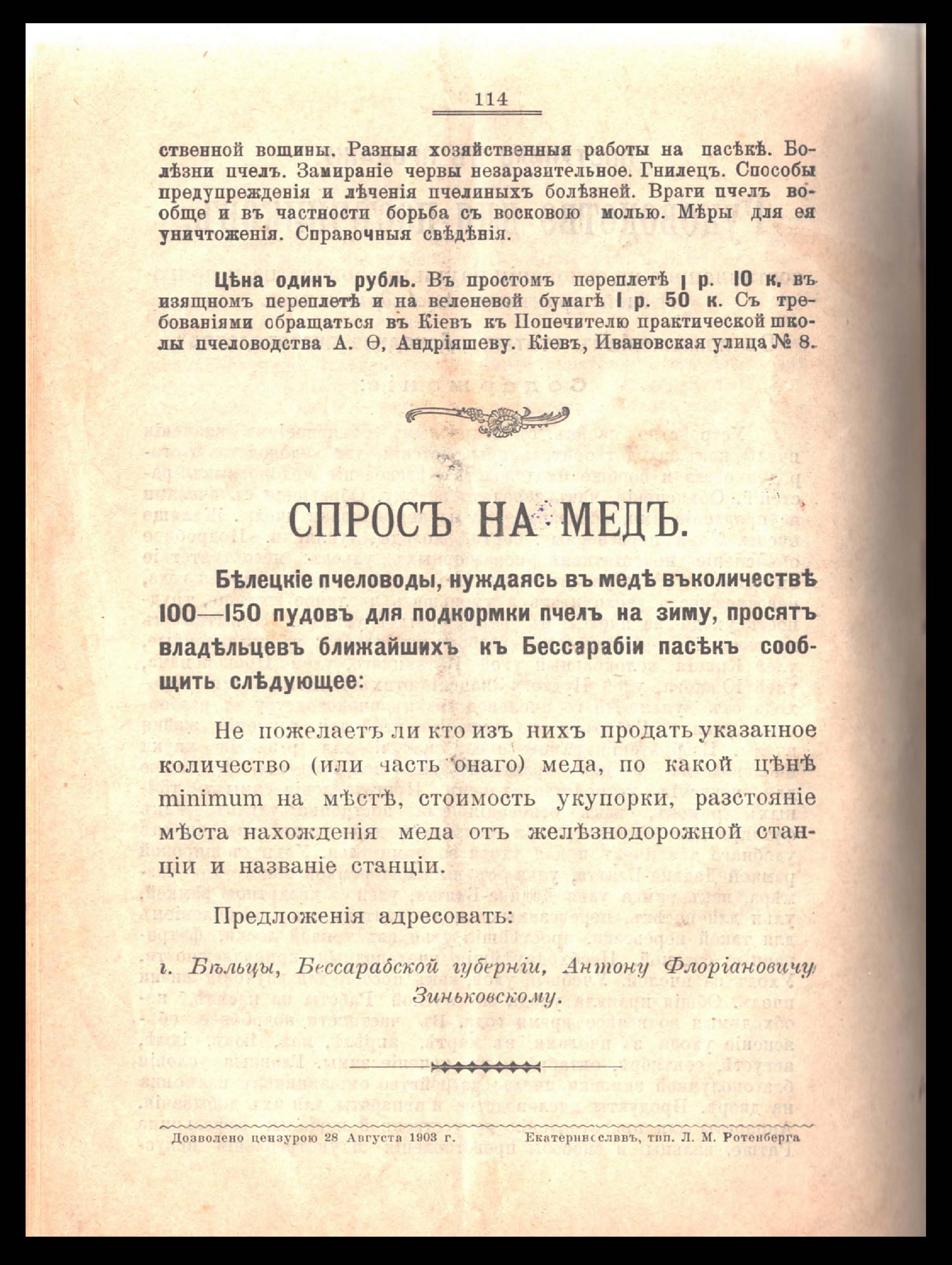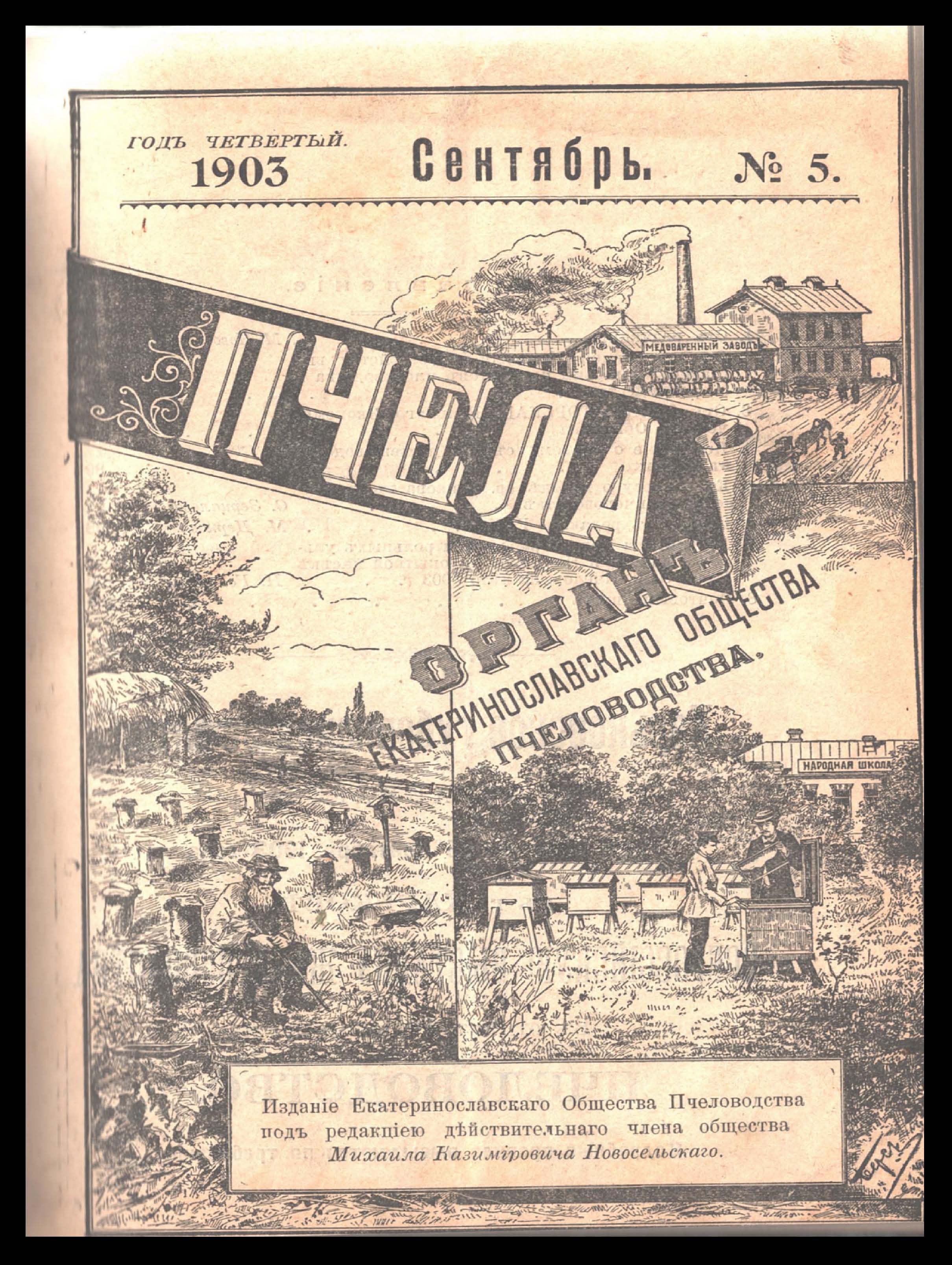 Пчела. Орган Екатеринославскаго Общества Пчеловодства. Сентябрь 1903 года. № 5 Год четвертый. Изданіе Екатеринославскаго Общества Пчеловодства подъ редакціею действительнаго члена общества Михаила Казиміровича Новосельскаго