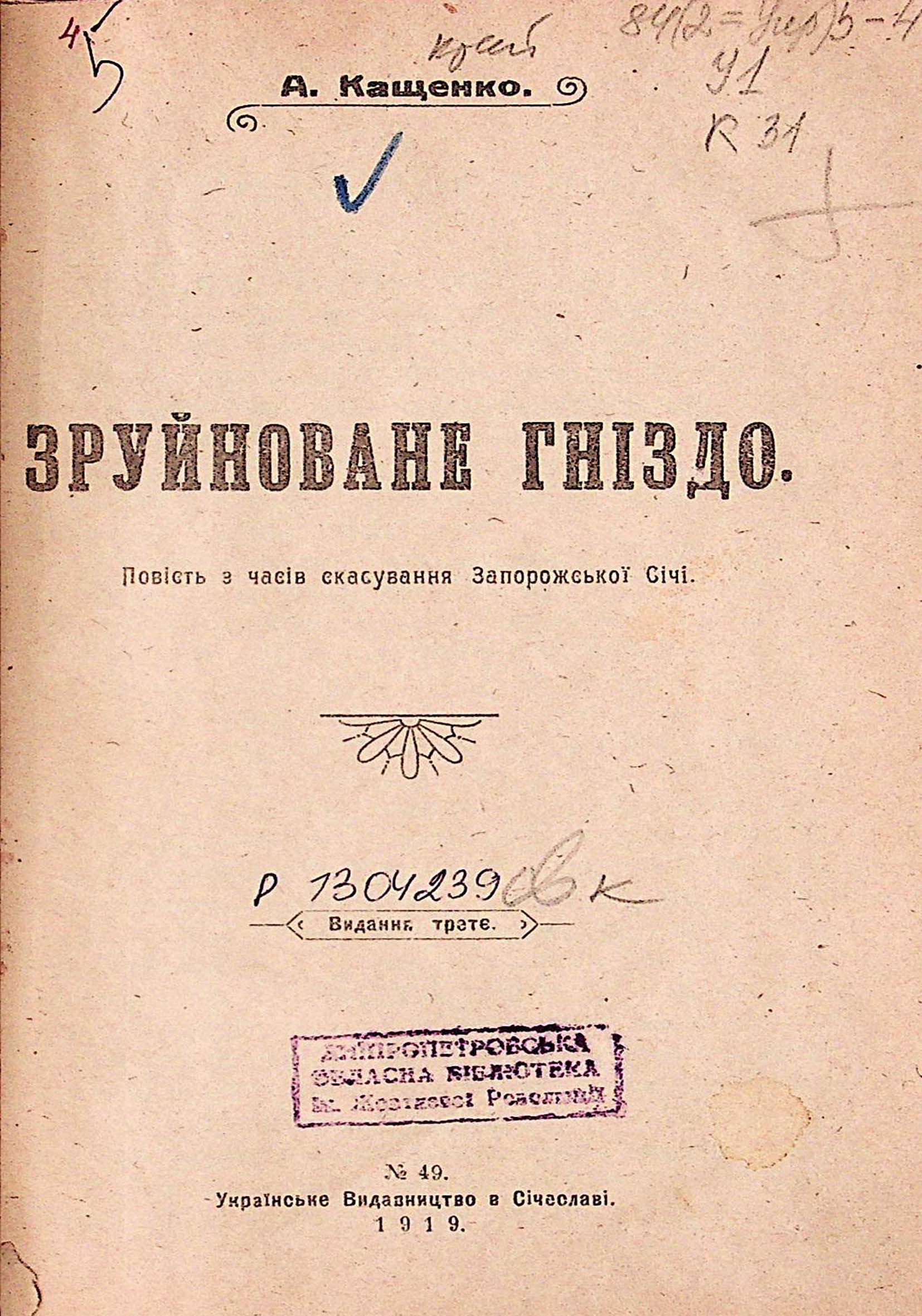 5. А. Кащенкою ЗРУЙНОВАНЕ ГНІЗДО. Повість з часів скасуваня Запорожської Січі