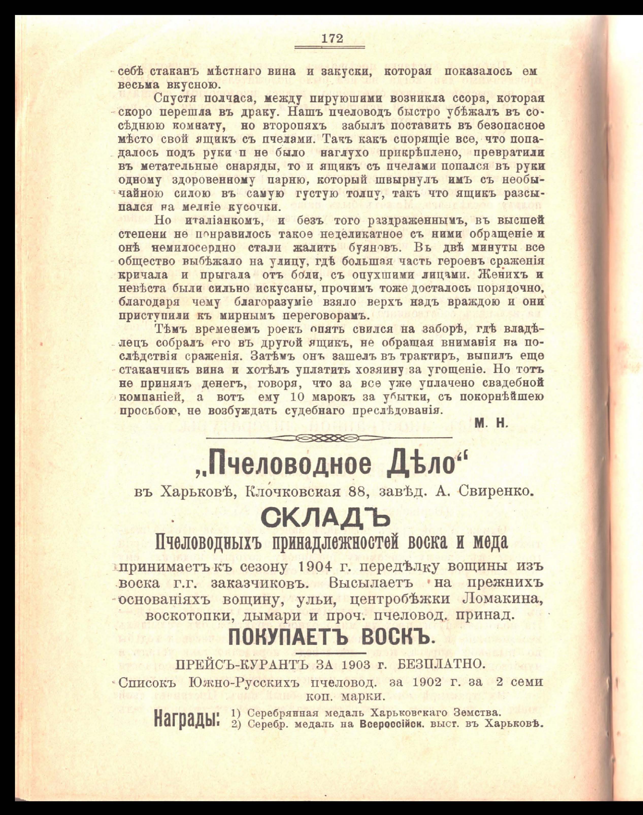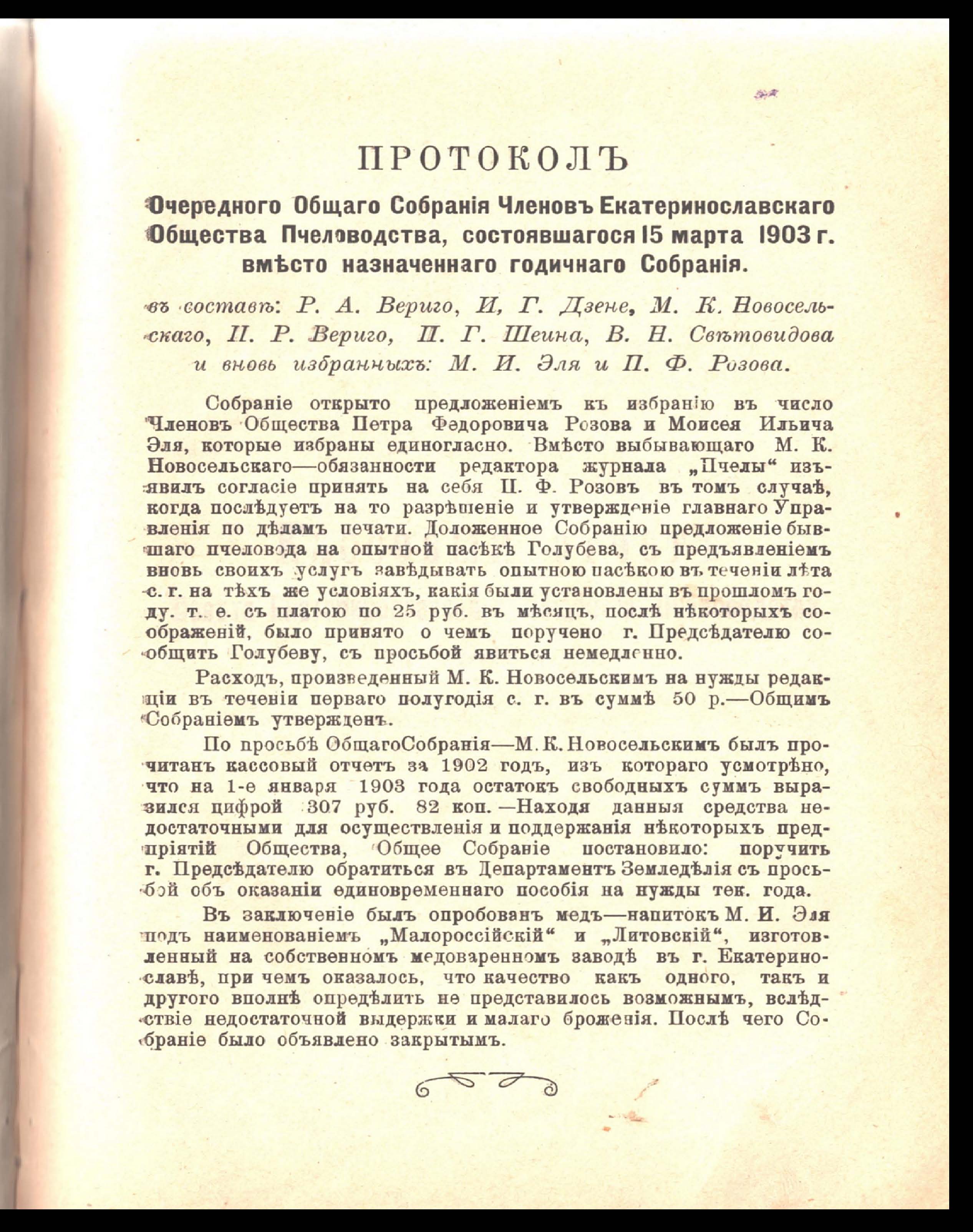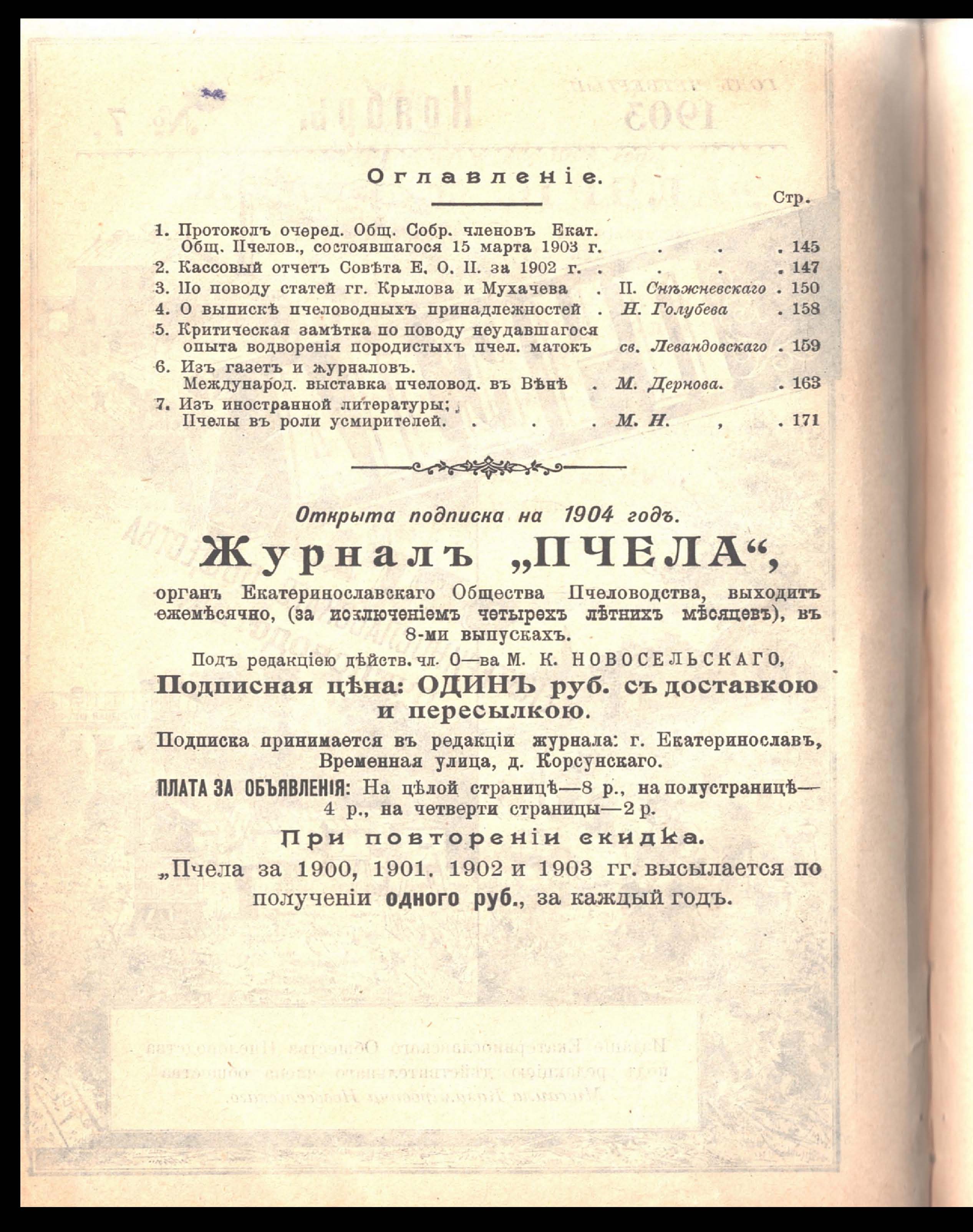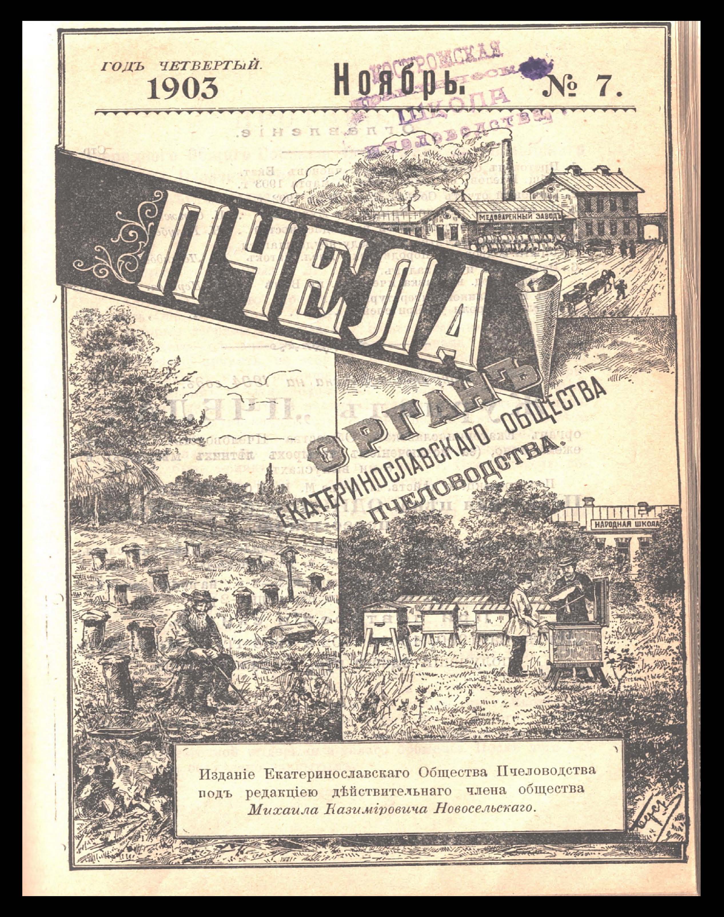 Пчела. Орган Екатеринославскаго Общества Пчеловодства. Ноябрь 1903 года. № 7. Год четвертый. Изданіе Екатеринославскаго Общества Пчеловодства подъ редакціею действительнаго члена общества Михаила Казиміровича Новосельскаго