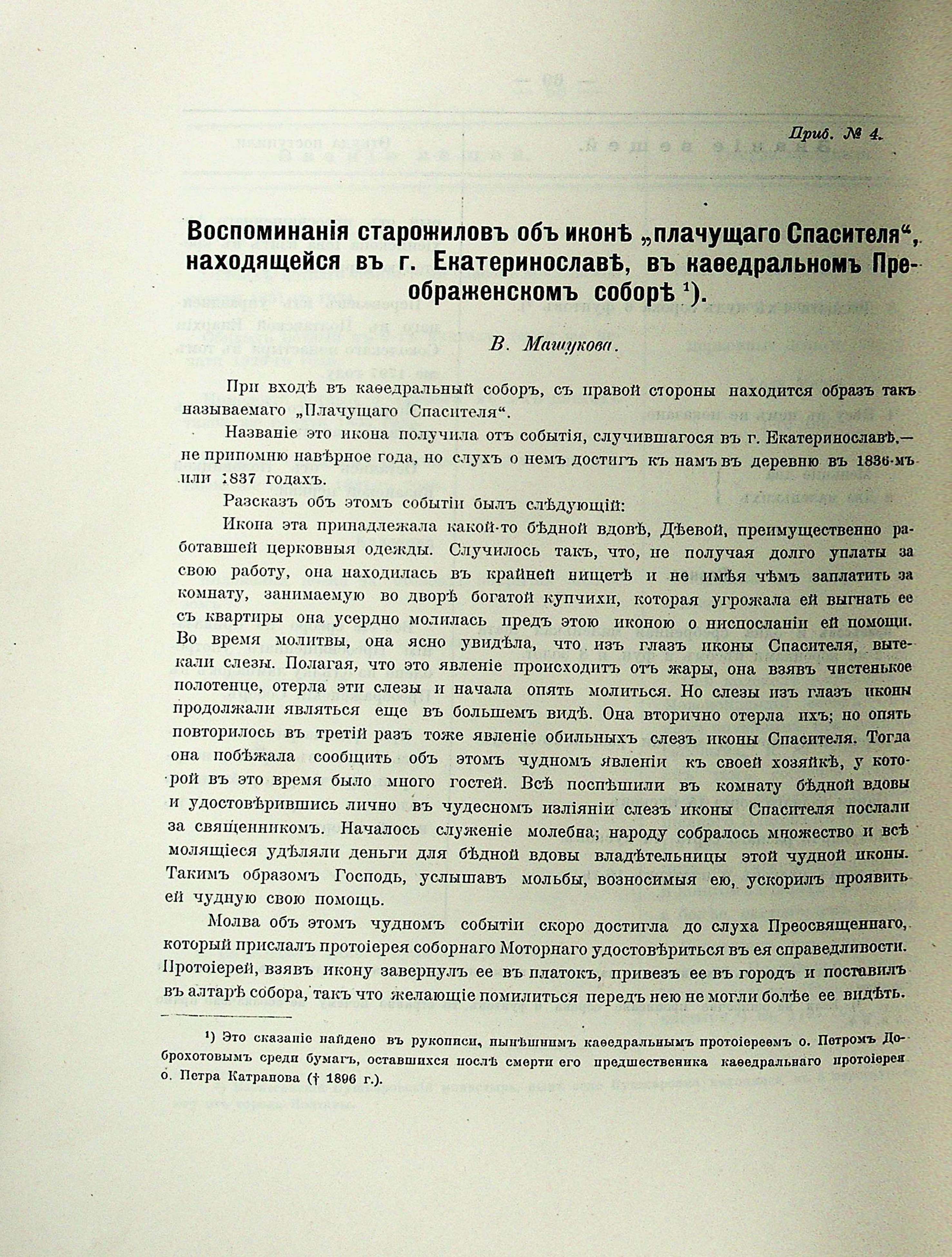 Приб. №4. Воспоминания старожиловъ объ иконе „плачущаго Спасителя“, находящейся въ г. Екатеринославе, въ кафедральномъ Преображенскомъ соборе. В. Машукова