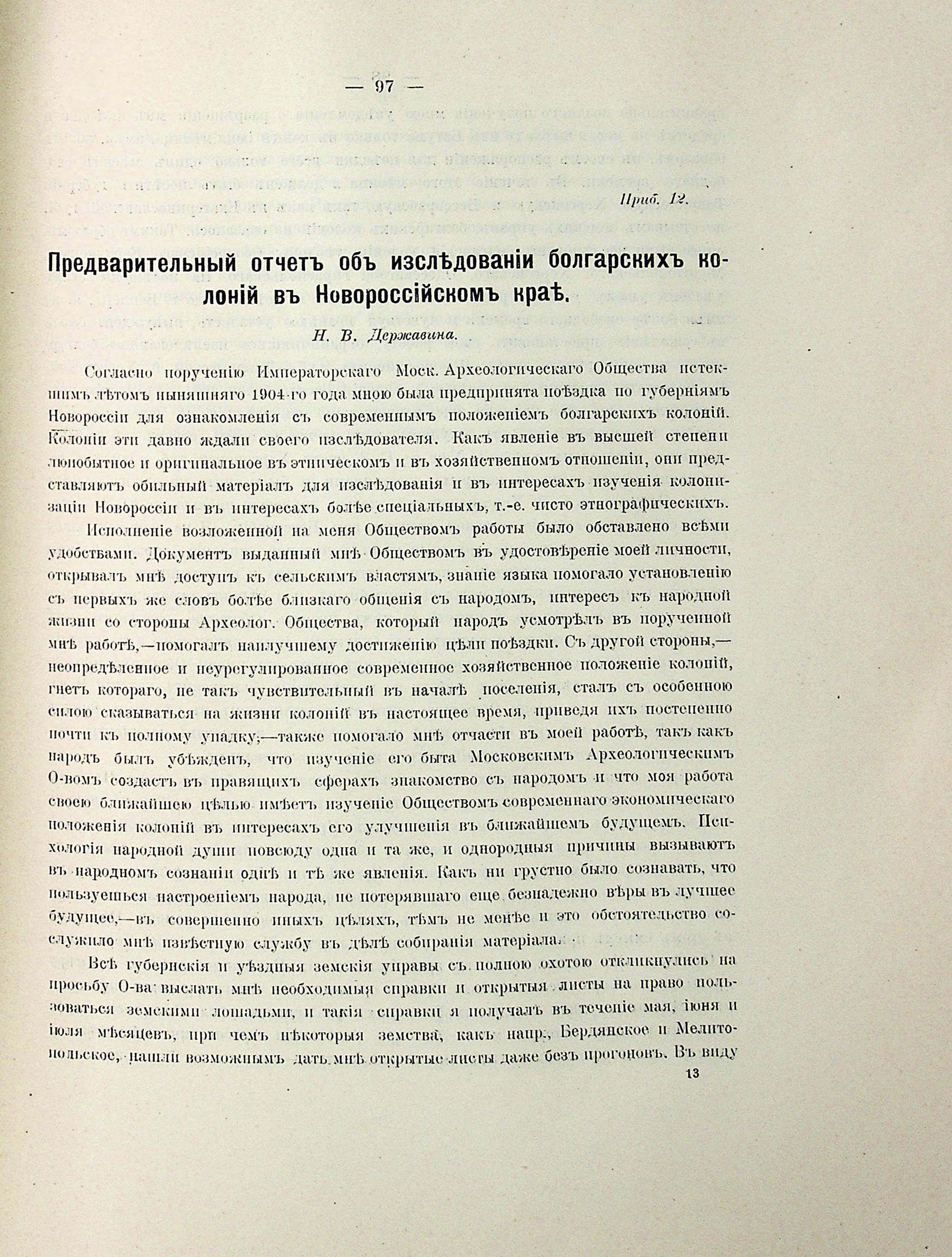 Приб.12. Предварительный отчетъ объ изследованіи болгарскихъ колоній въ Новоросс′вйскомъ крае. П. В. Державина