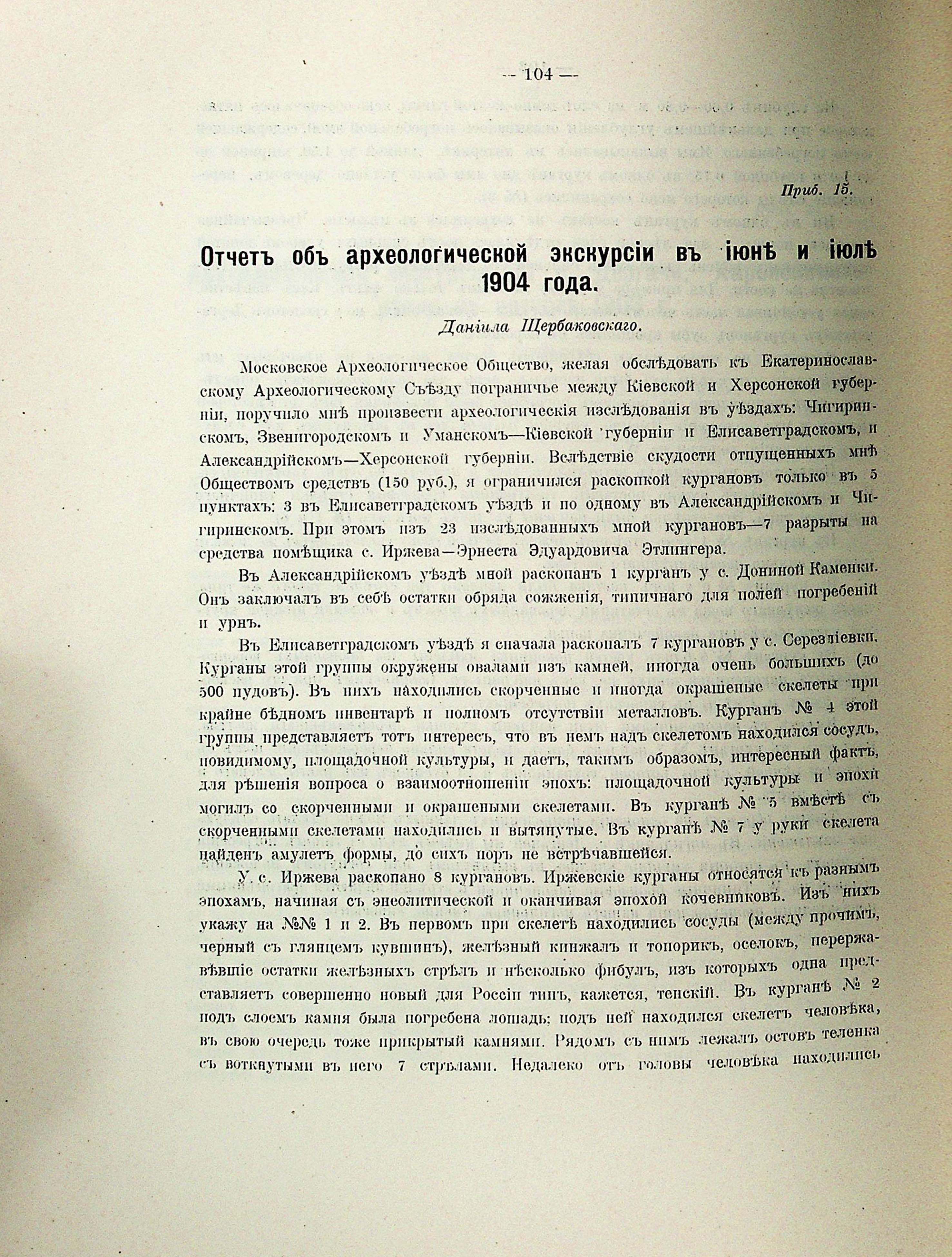 Приб.15. Отчетъ объ археолоґичесной зкскурсіи въ іюне и іюле 1904 года. Даніила Щербаковскаго