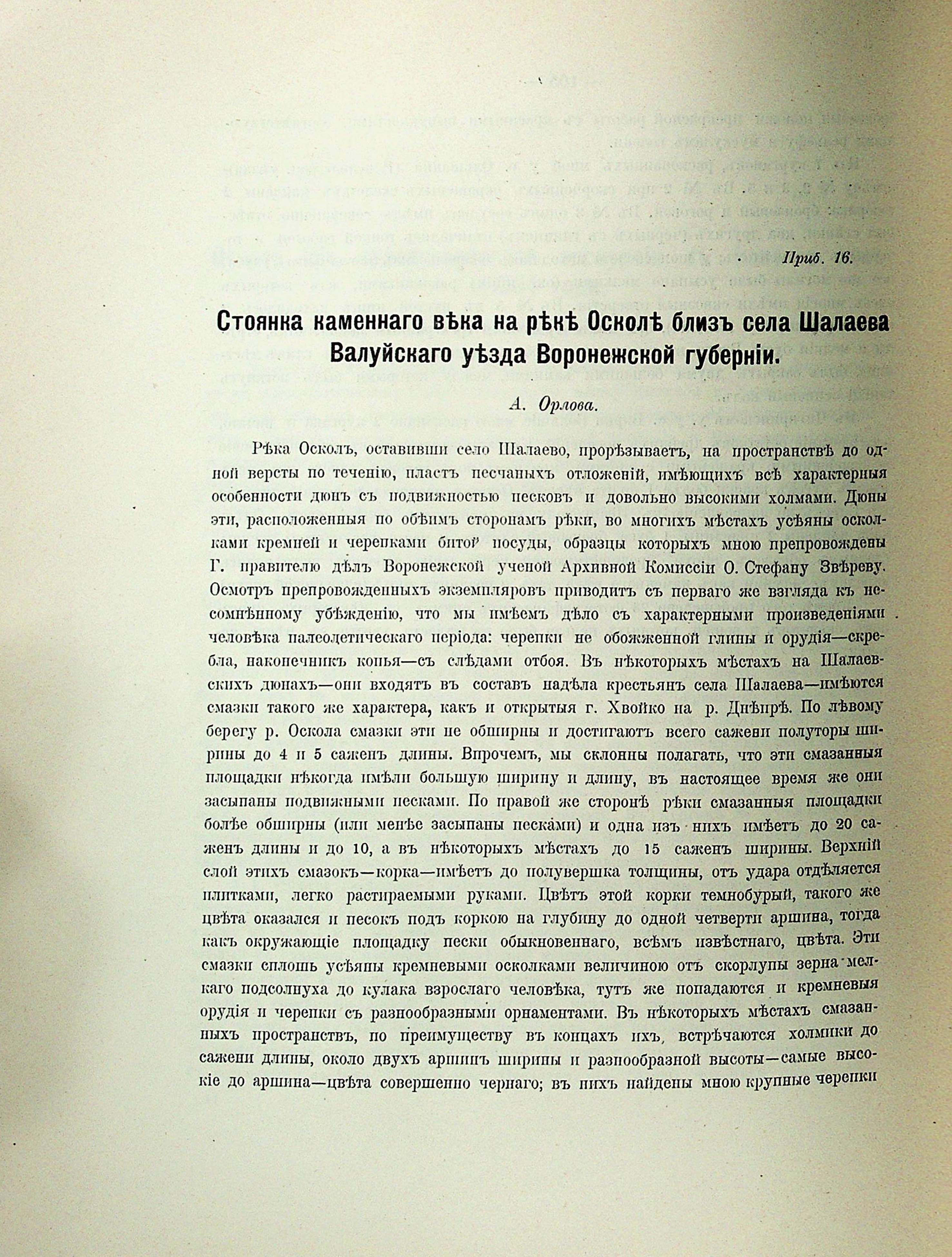 Приб.16. Стоянка каменнаго века на реке Осмолі близъ села Шалаева Валуйскаго уезда Воронежской губерніи. А. Орлова