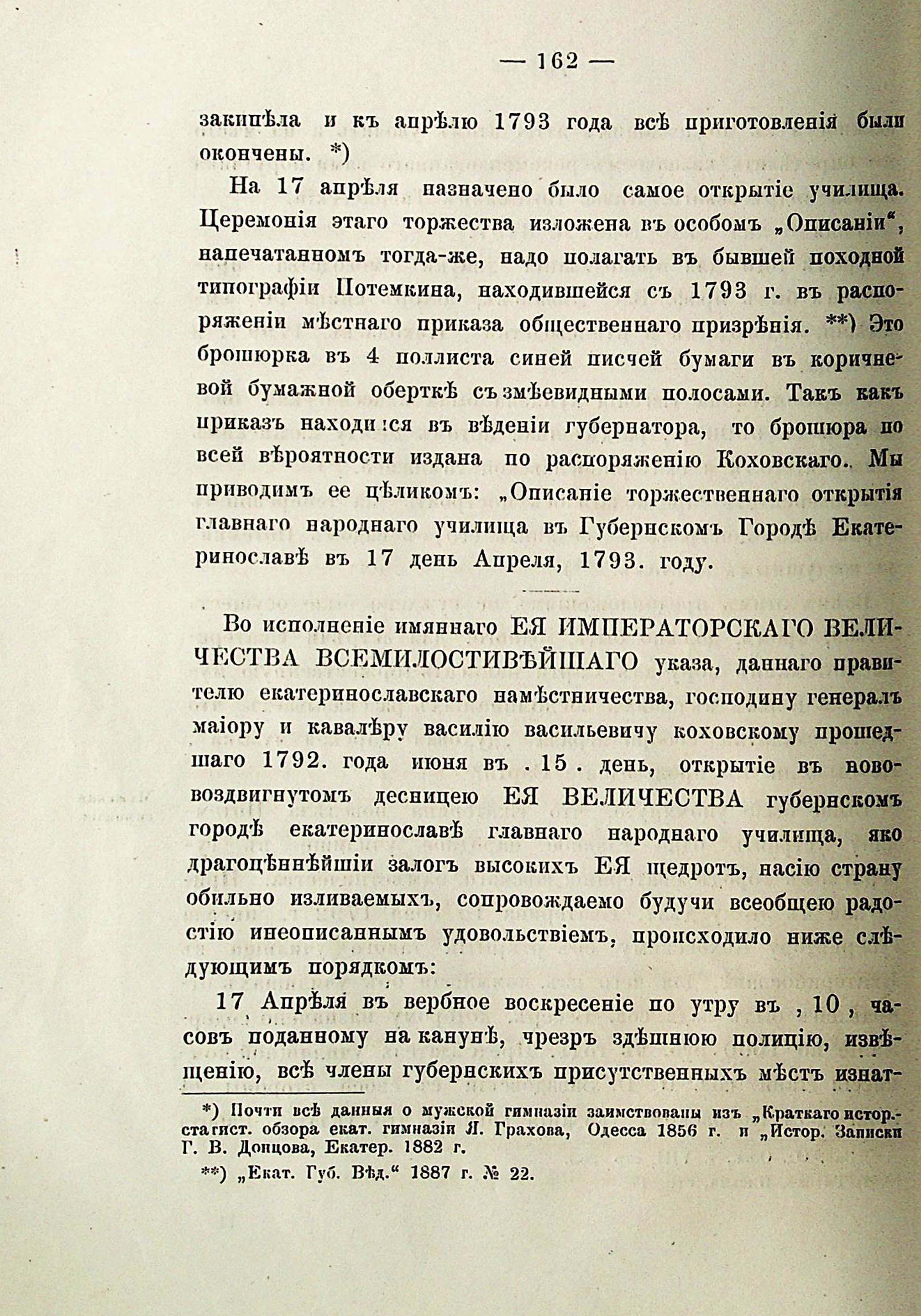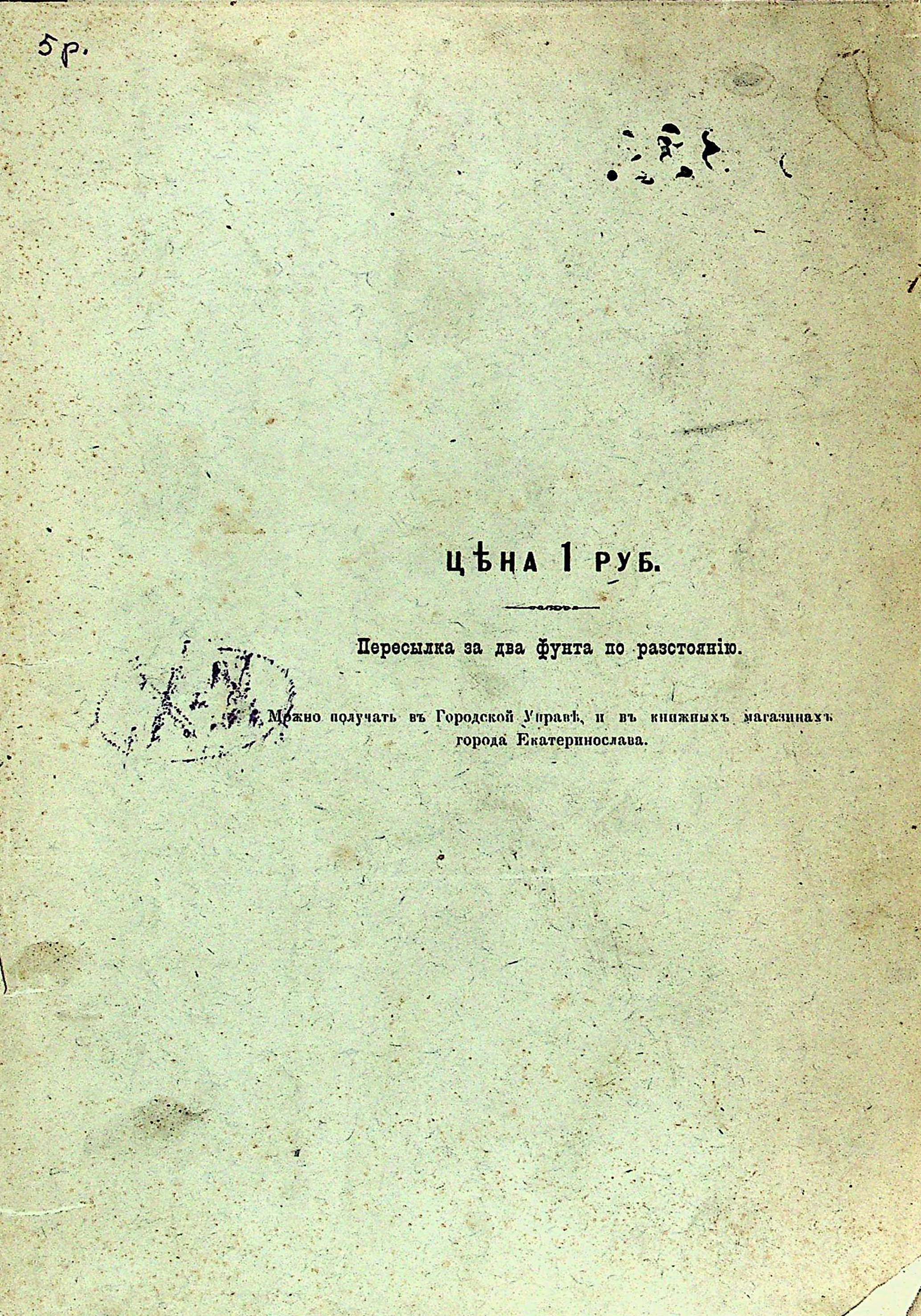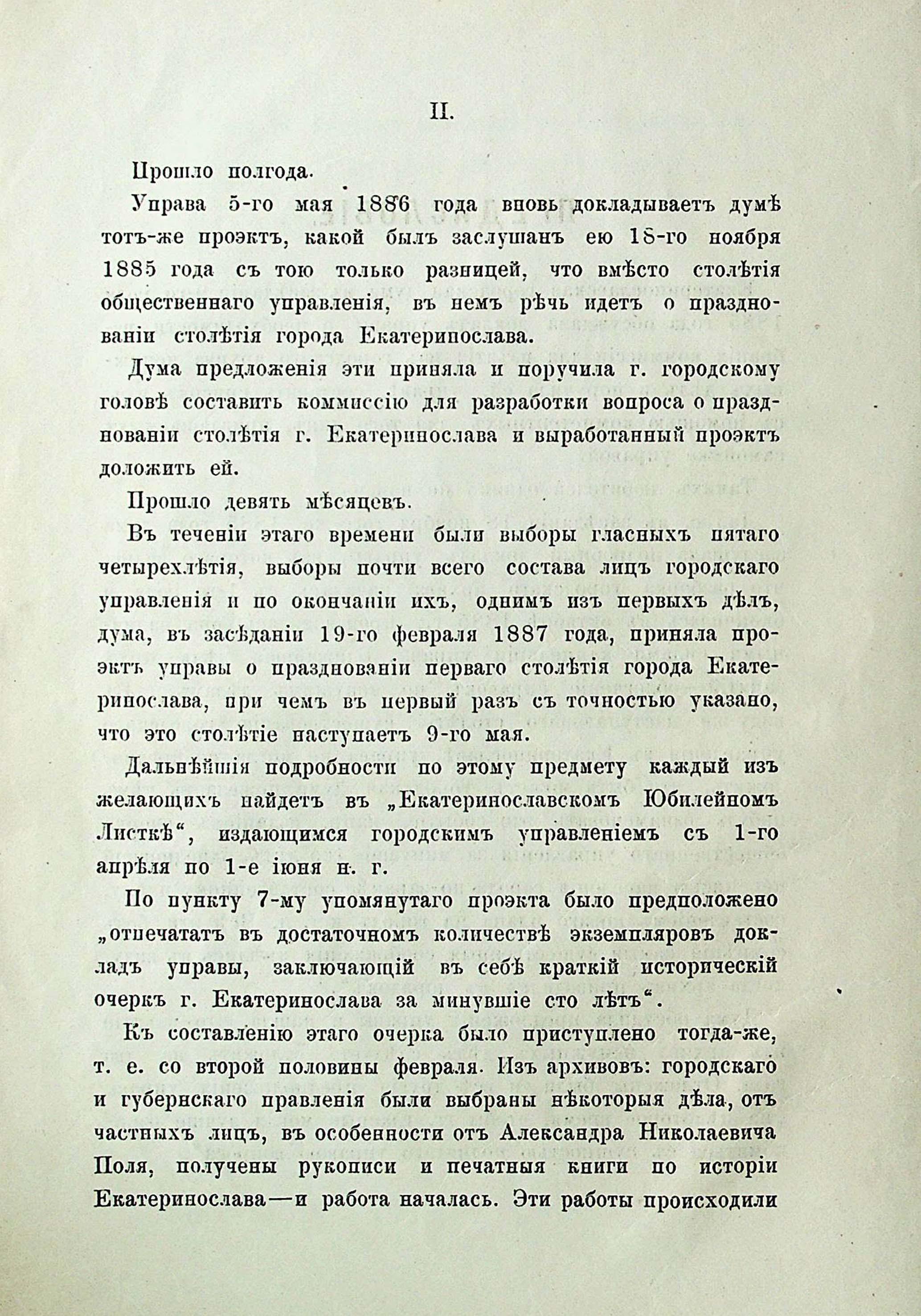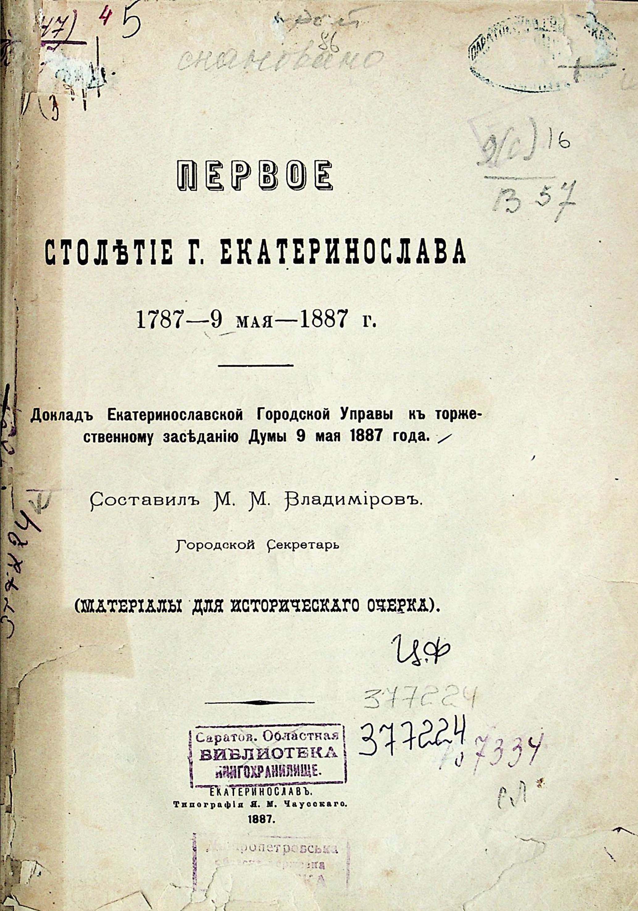 ПЕРВОЕ СТОЛЕТІЕ г. ЕКАТЕРИНОСЛАВА 1787-9 мая-1887г. Докладъ Екатеринославской Городской Управы къ торжественному заседанію 9 мая 1887 года
