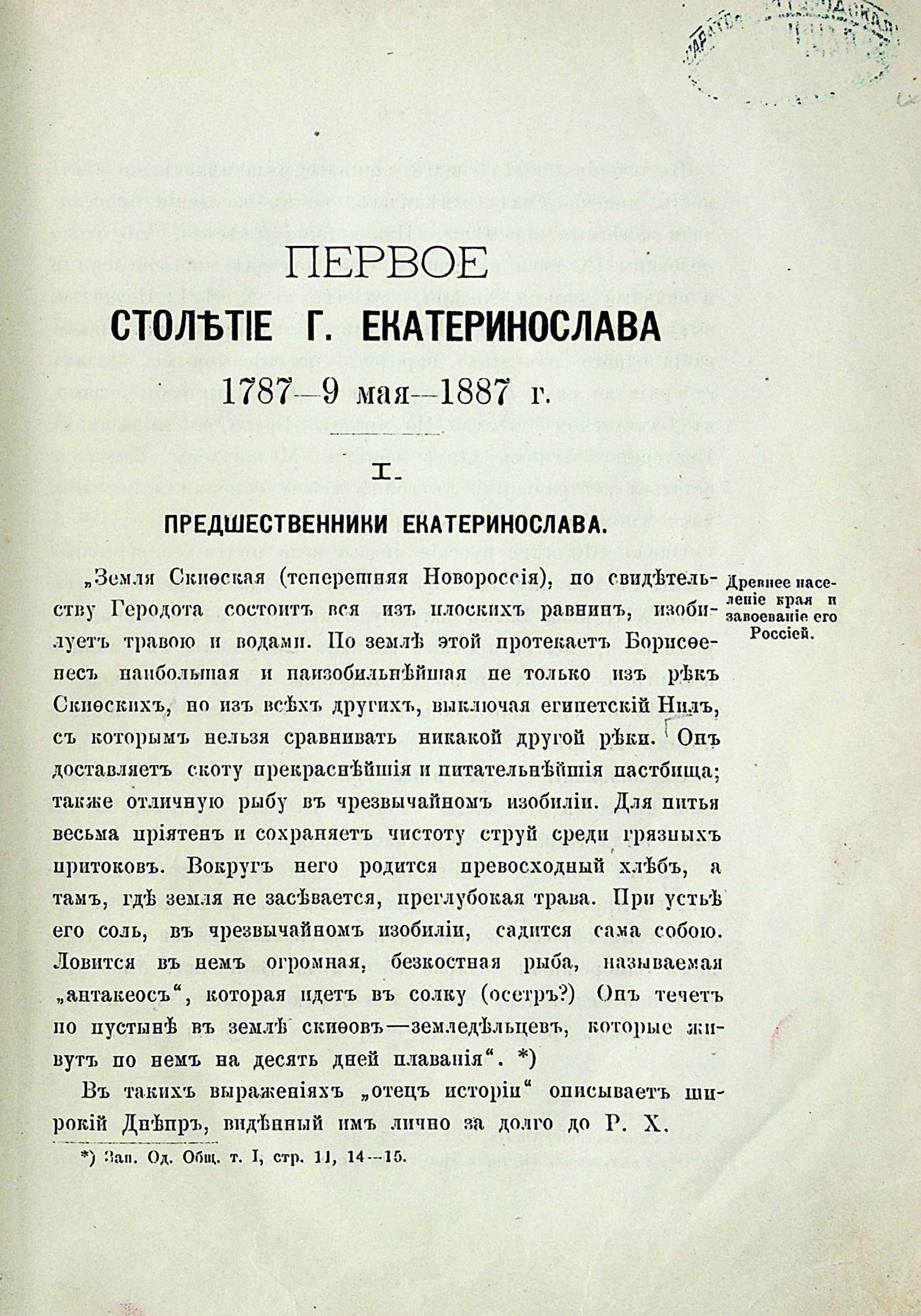 ПЕРВОЕ СТ0ЛЕТІЕ Г. ЕКАТЕРИНОСЛАВА 1787-9 мая-1887 г. I. ПРЕДШЕСТВЕННИКИ ЕКАТЕРИНОСЛАВА