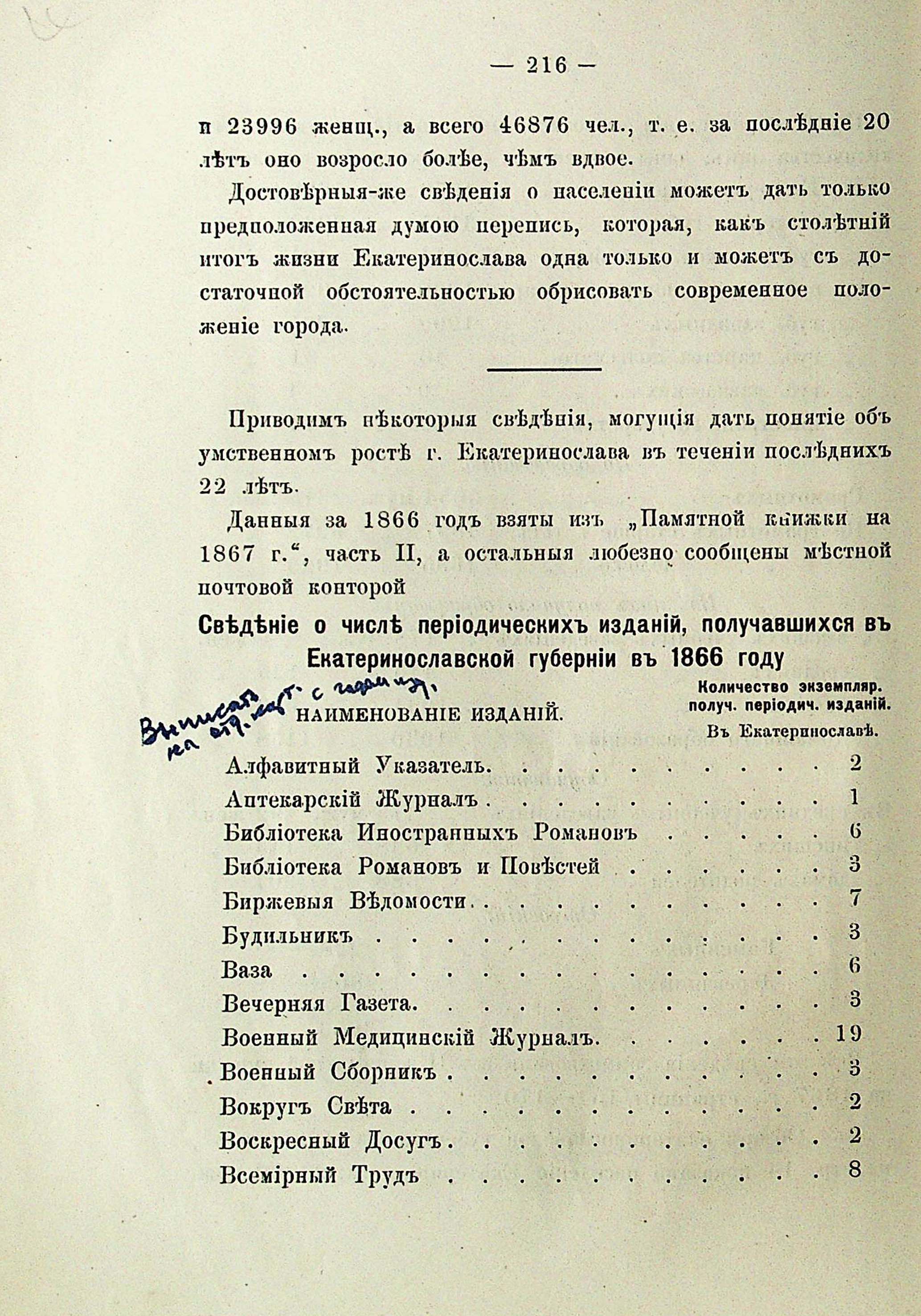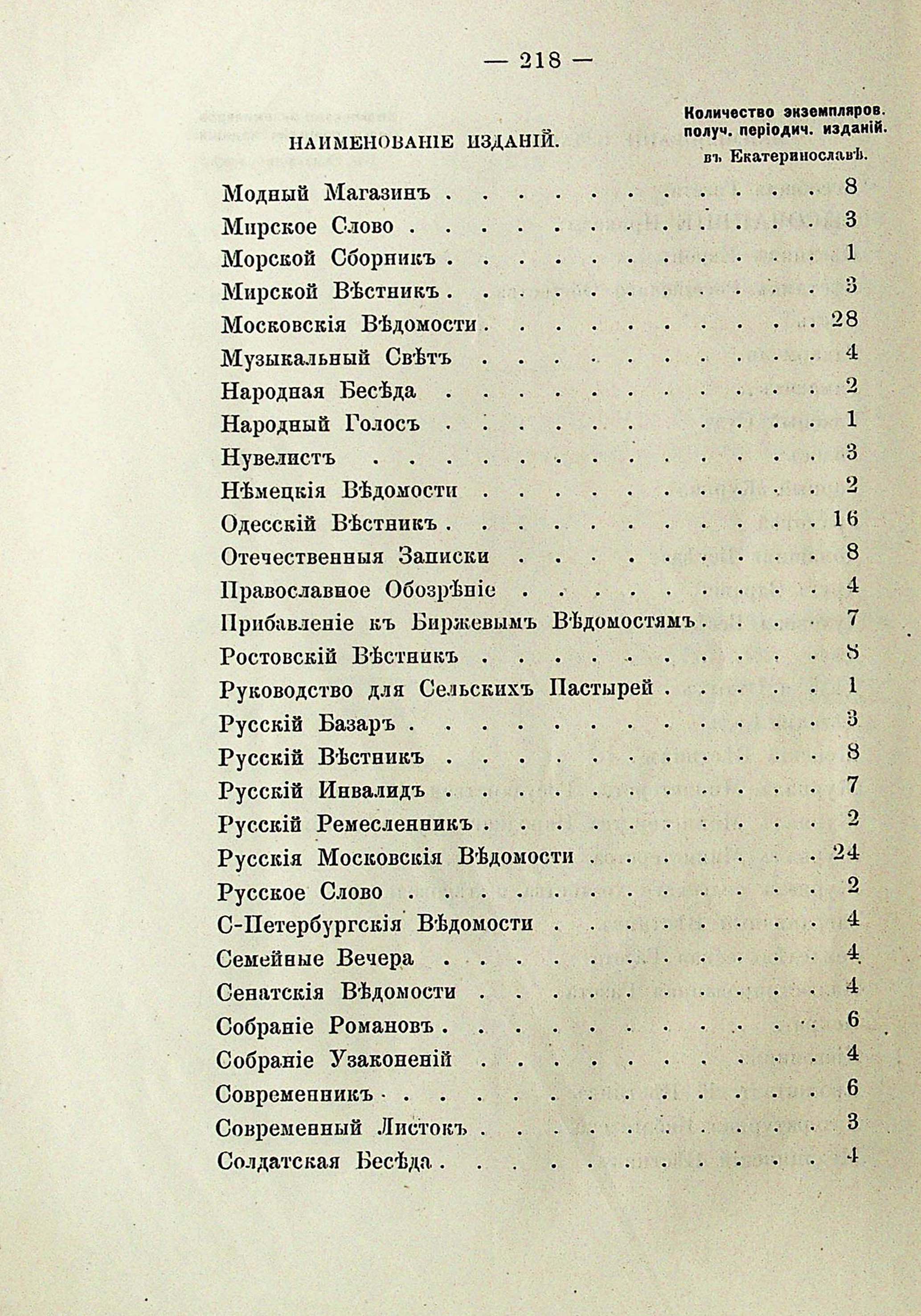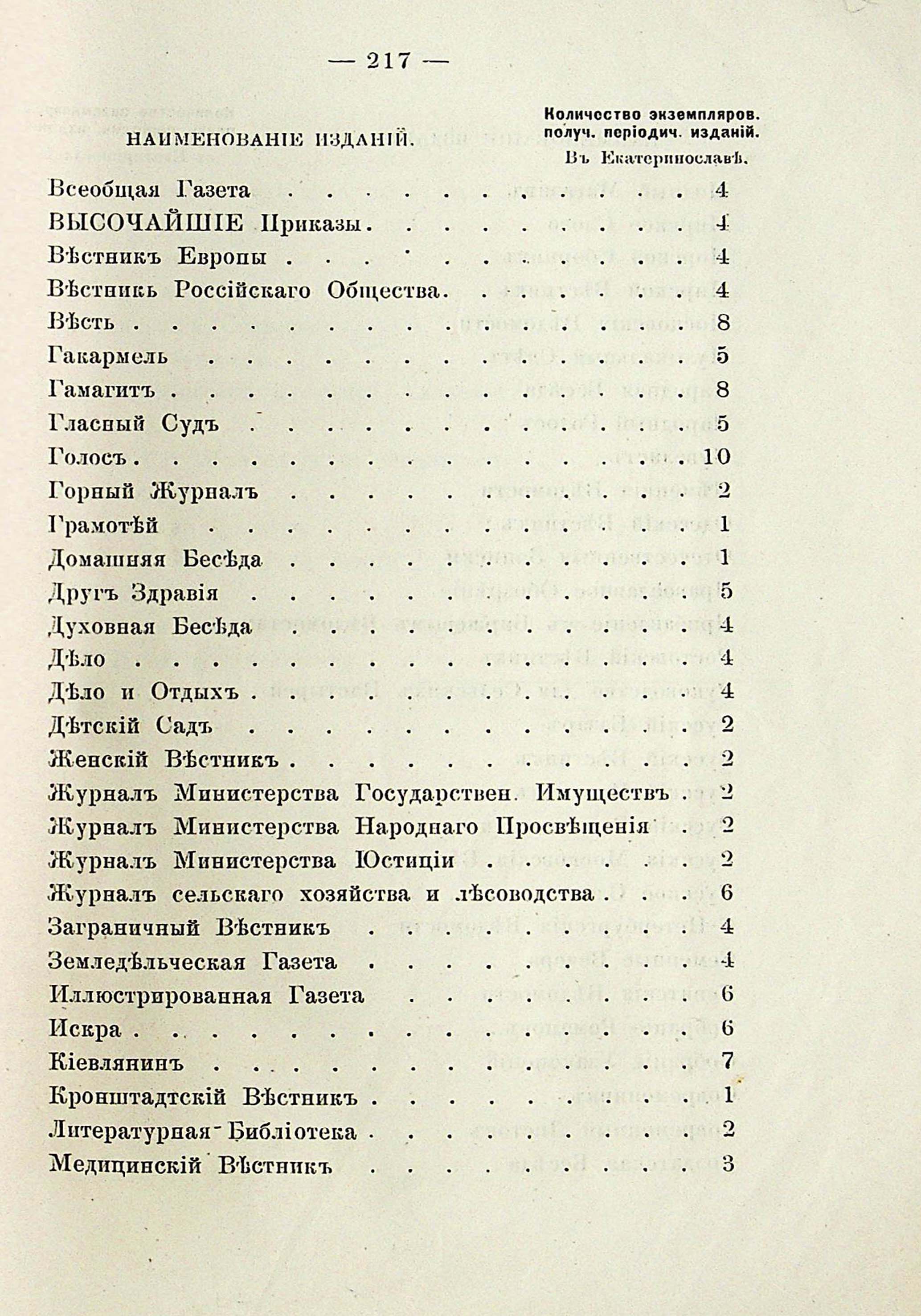 Сведініе о числе періодическихъ изданій, получавшихся въ Екатеринославсной губерніи въ 1866 году