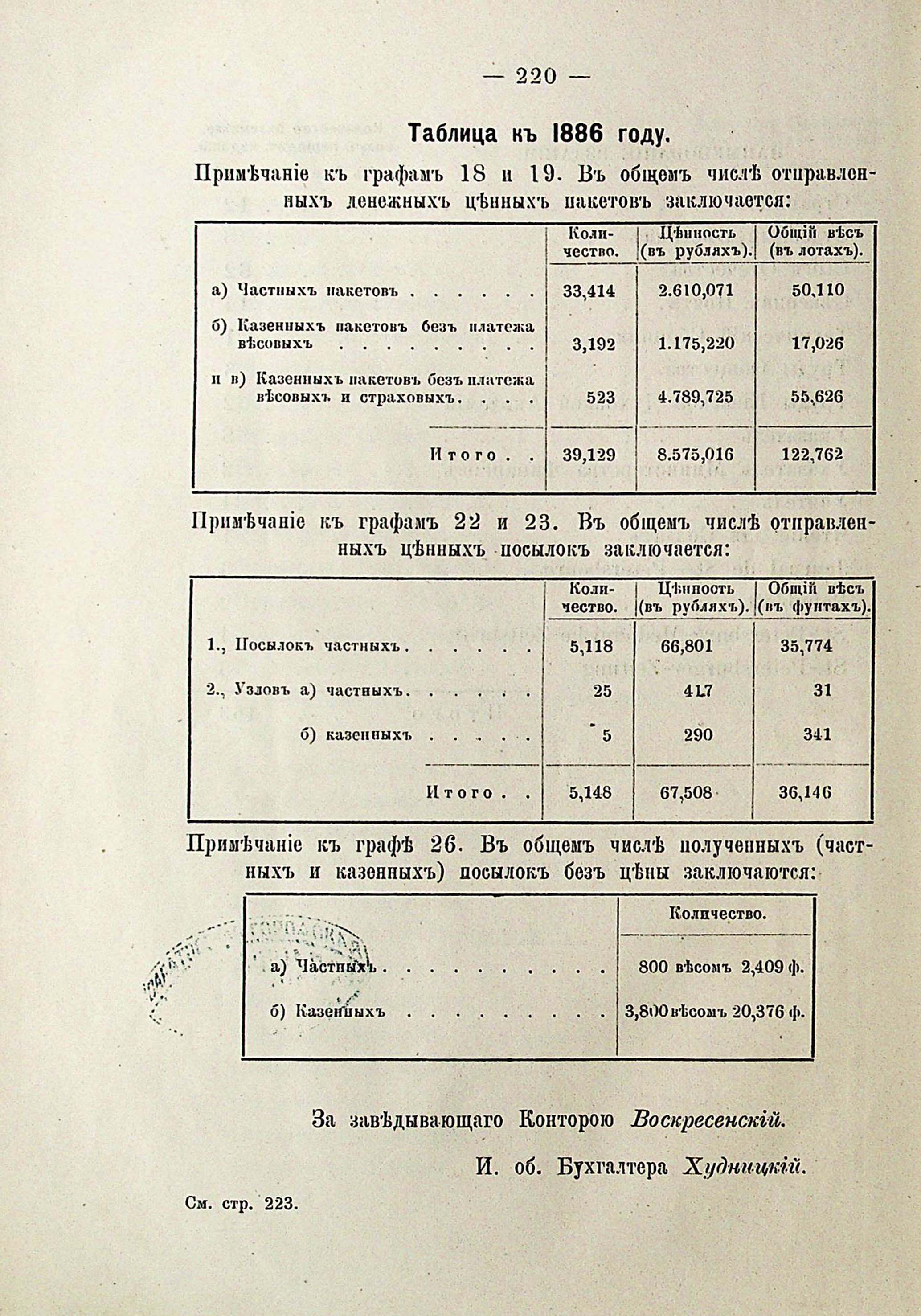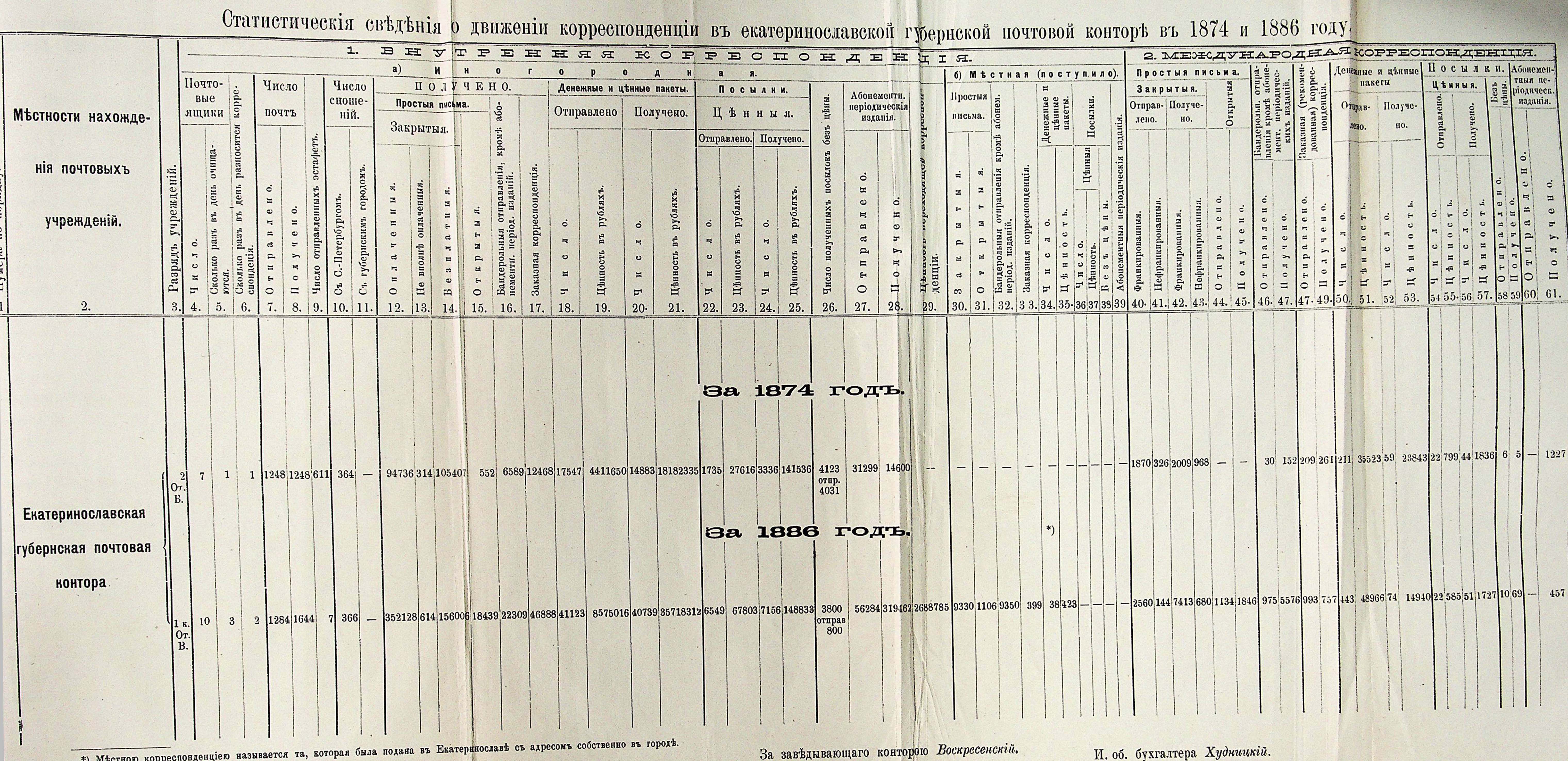 Статистическія сведенія о движеніи корреспонденціи въ екатеринославской Губернской конторе въ 1874 и 1886 году
