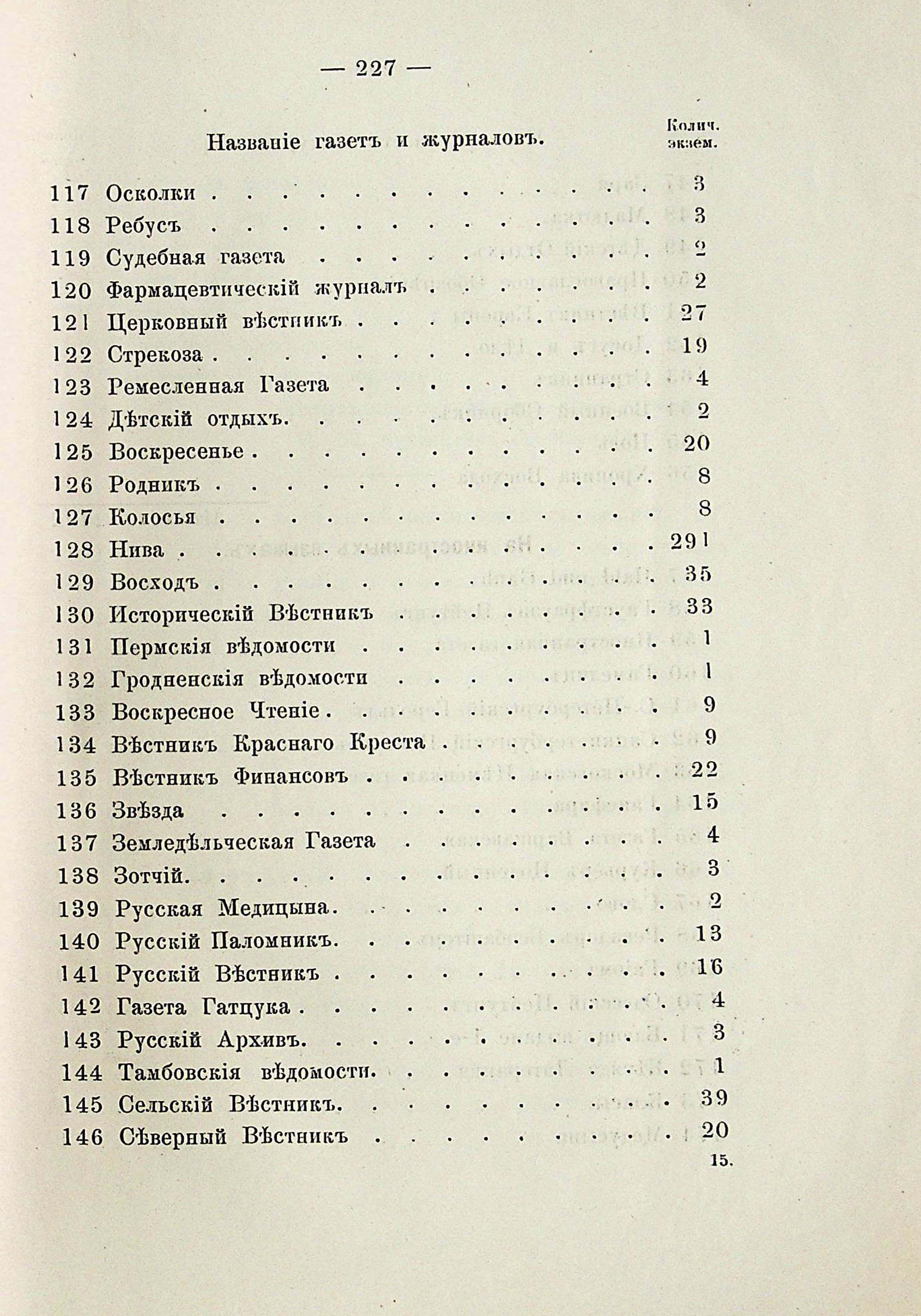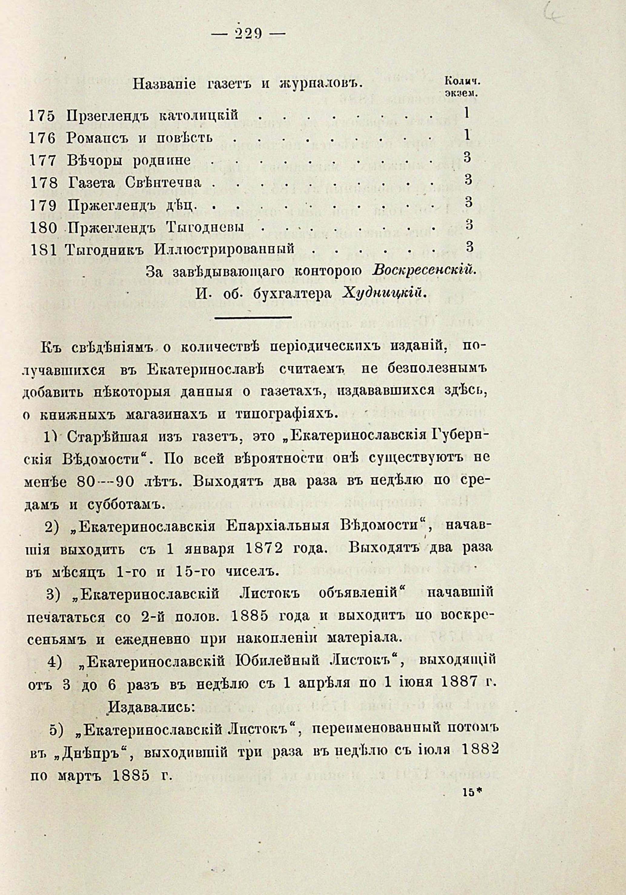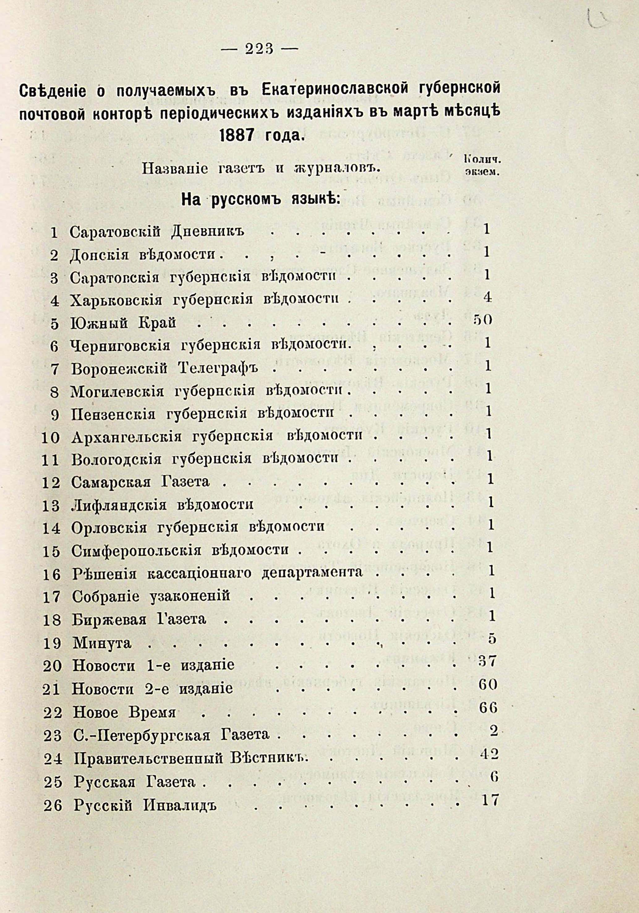 Свденія о получаемыхъ въ Екатеринославской губернской почтовой конторе періодическихь изданіяхь въ марте месяце 1887 года. Названіе газетъ и журналові». На русскомъ языке