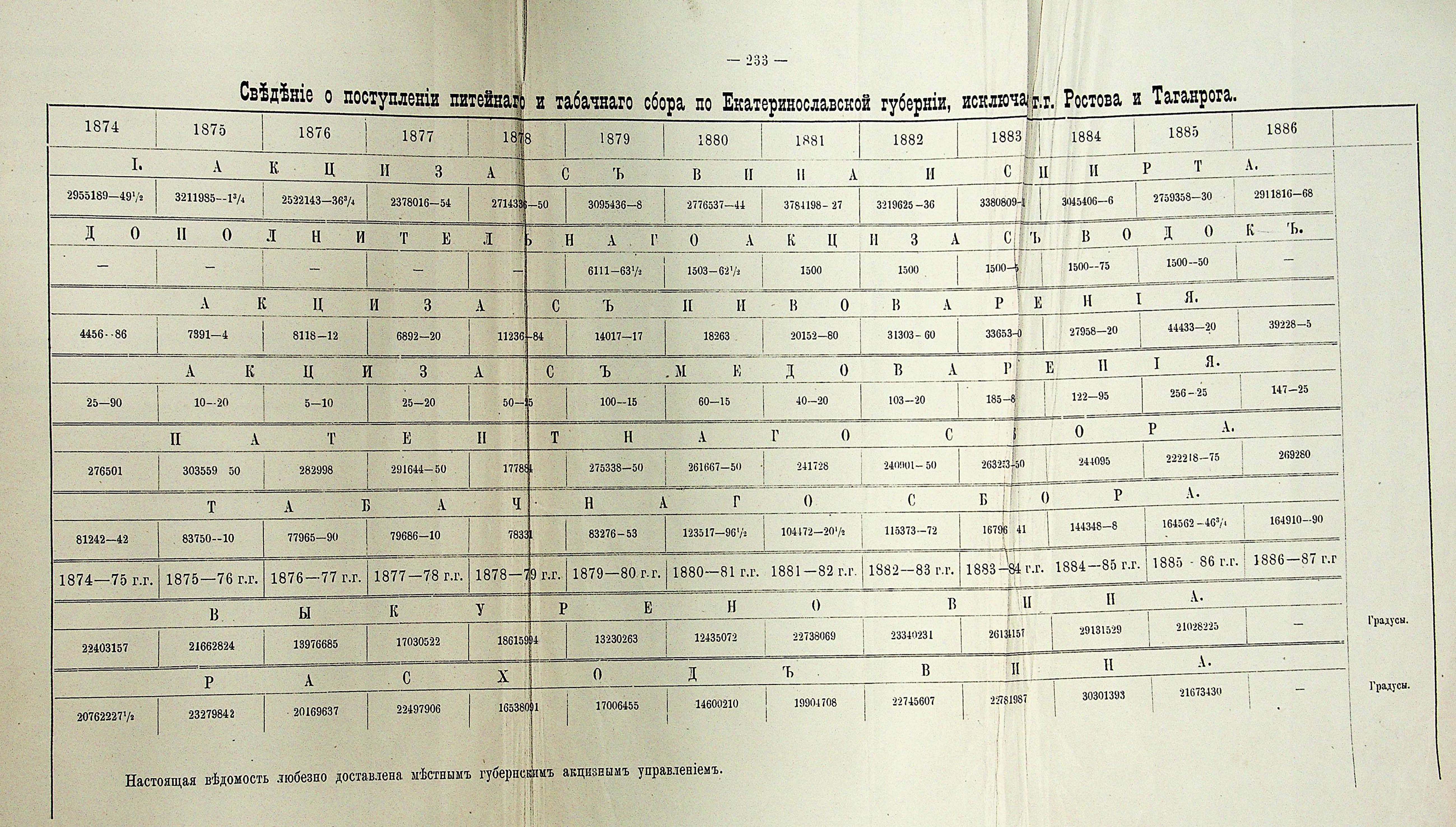 Сведенія о поступленіи питейнаго и табачнаго сбора по Екатеринославской губерніи, исключая г.г. Ростова и Таганрога