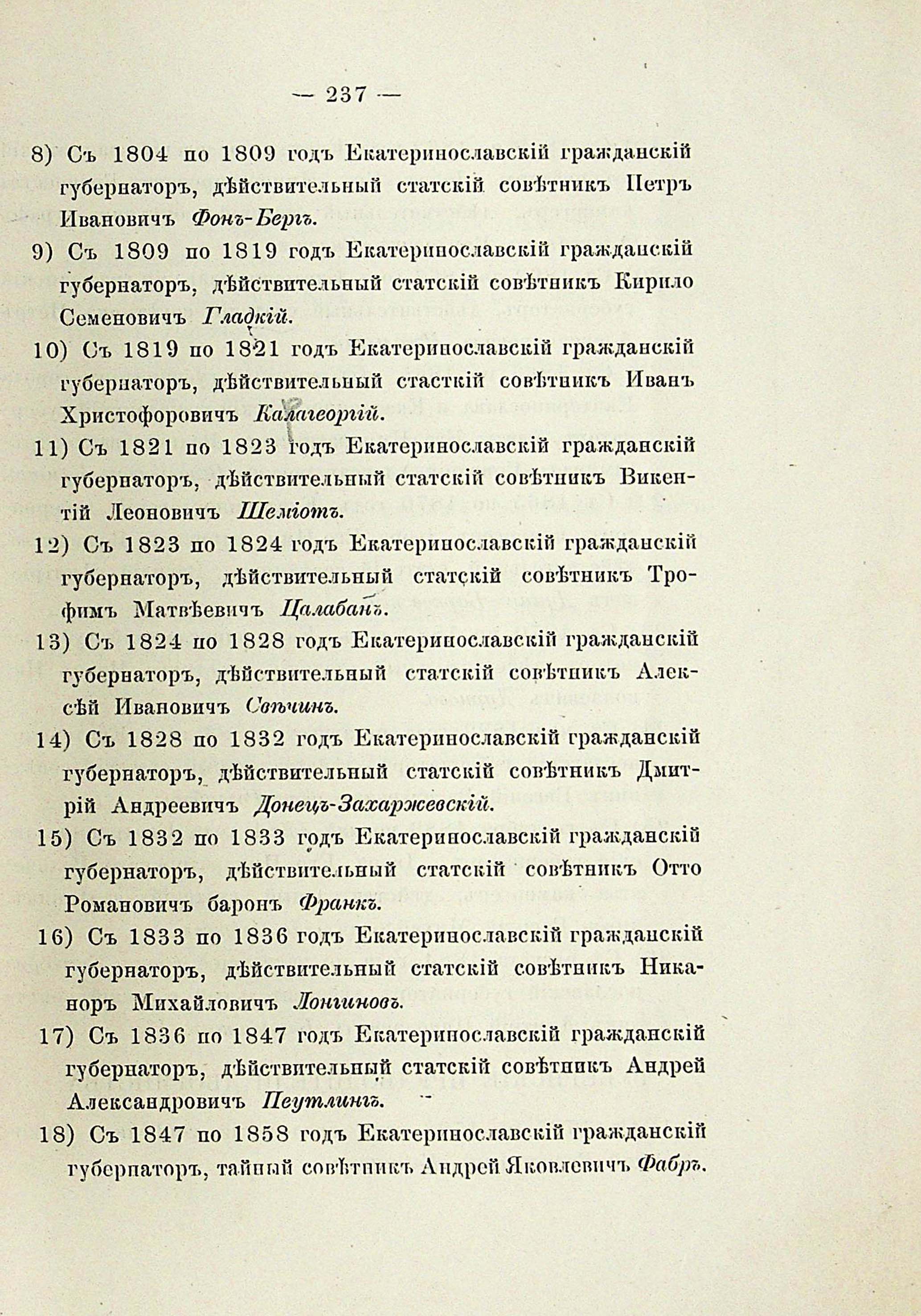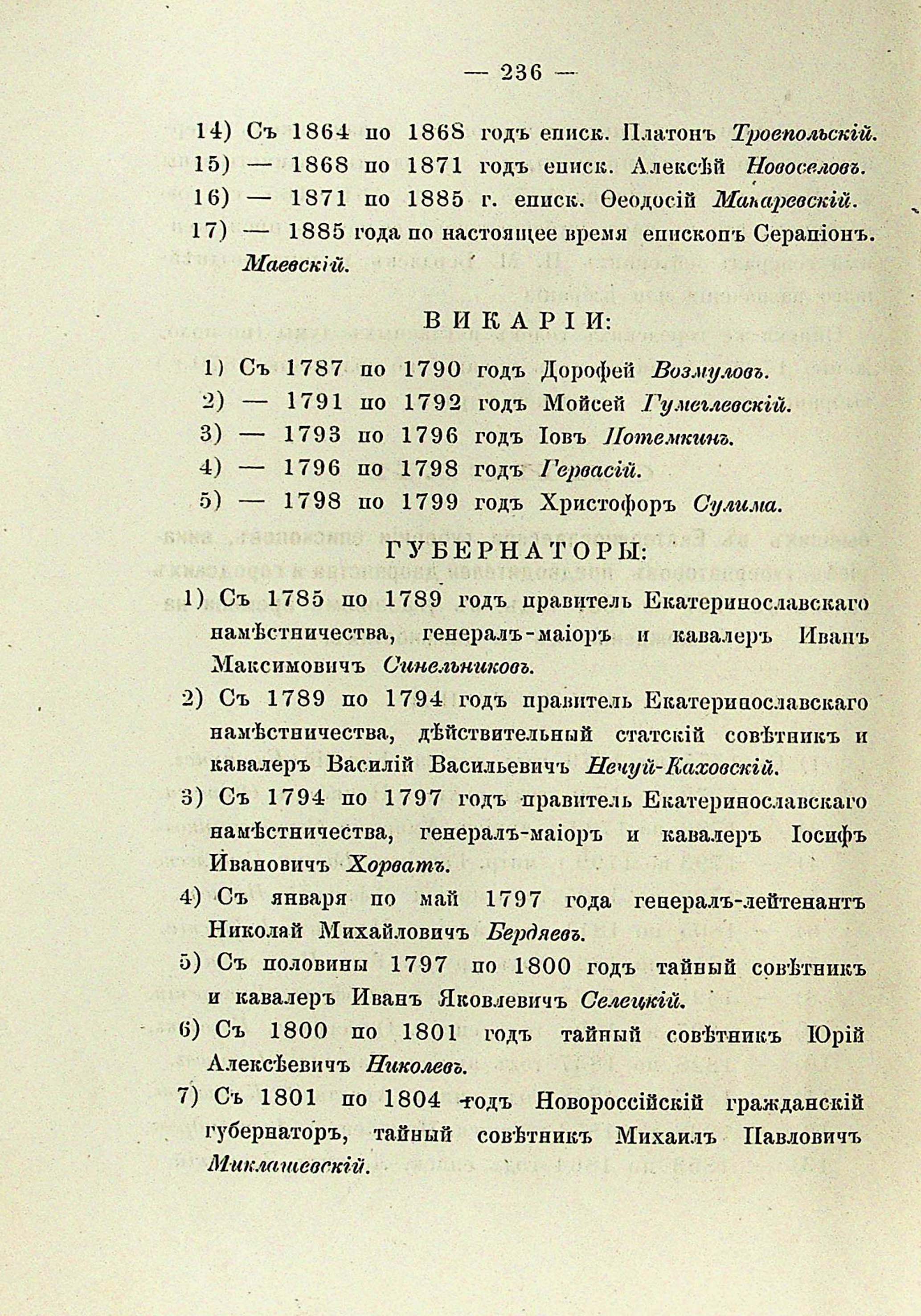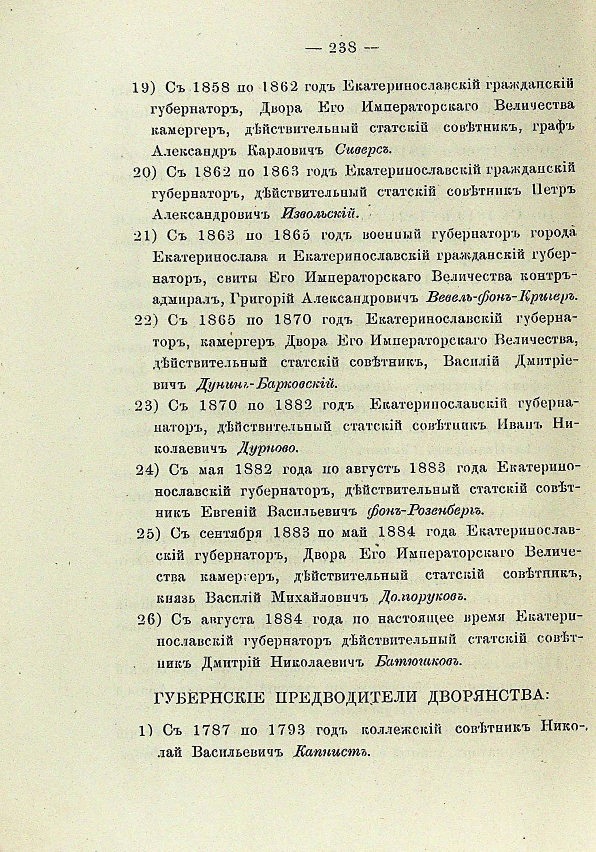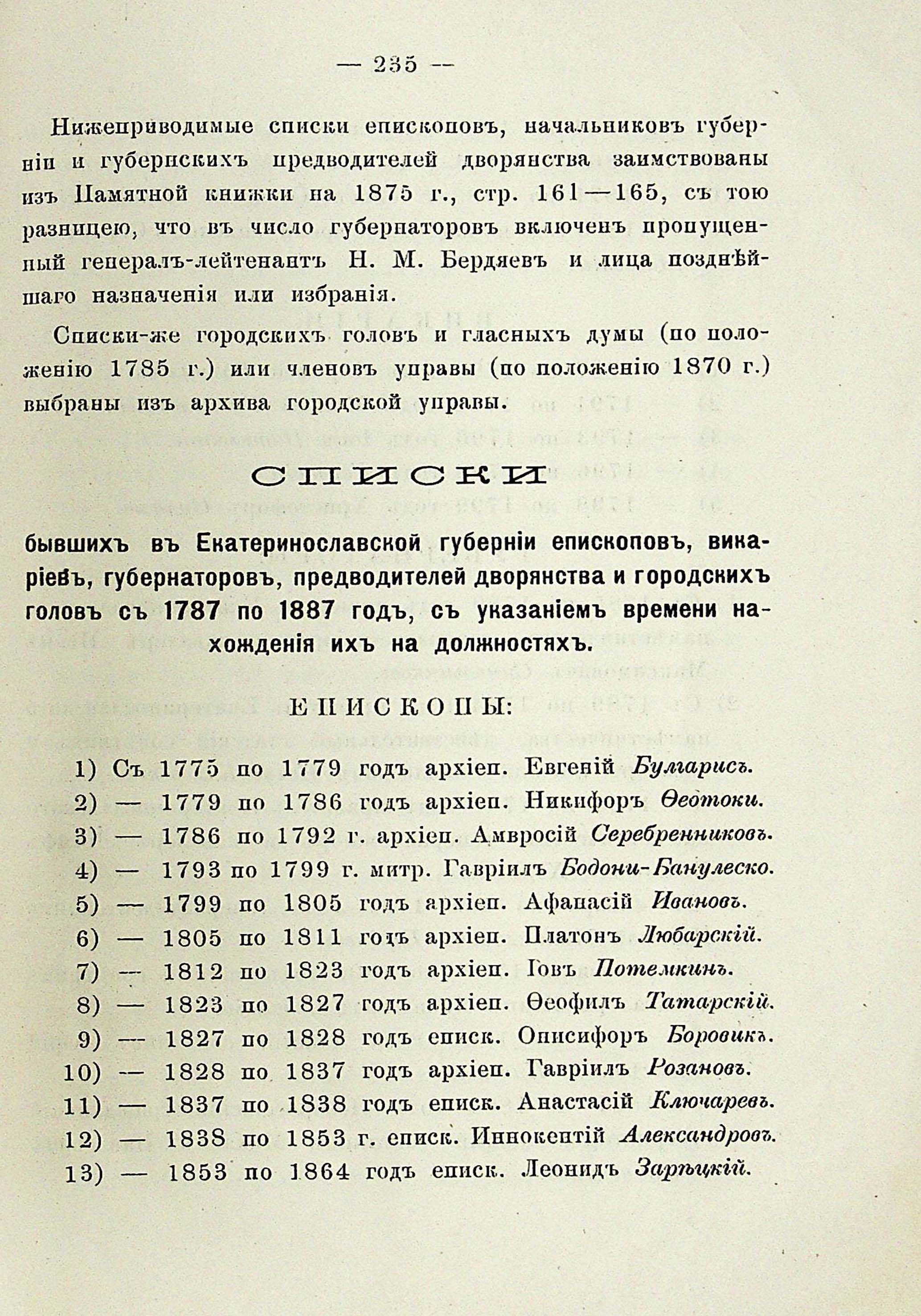 СПИСКИ бывшихъ въ Екатеринославской губерній епископовъ викаріеъ, губернаторовъ, предводителей дворянства и городскихъ головъ съ 1787 по 1887 годъ, съ указажемъ времени нахожденія ихъ на должностяхъ