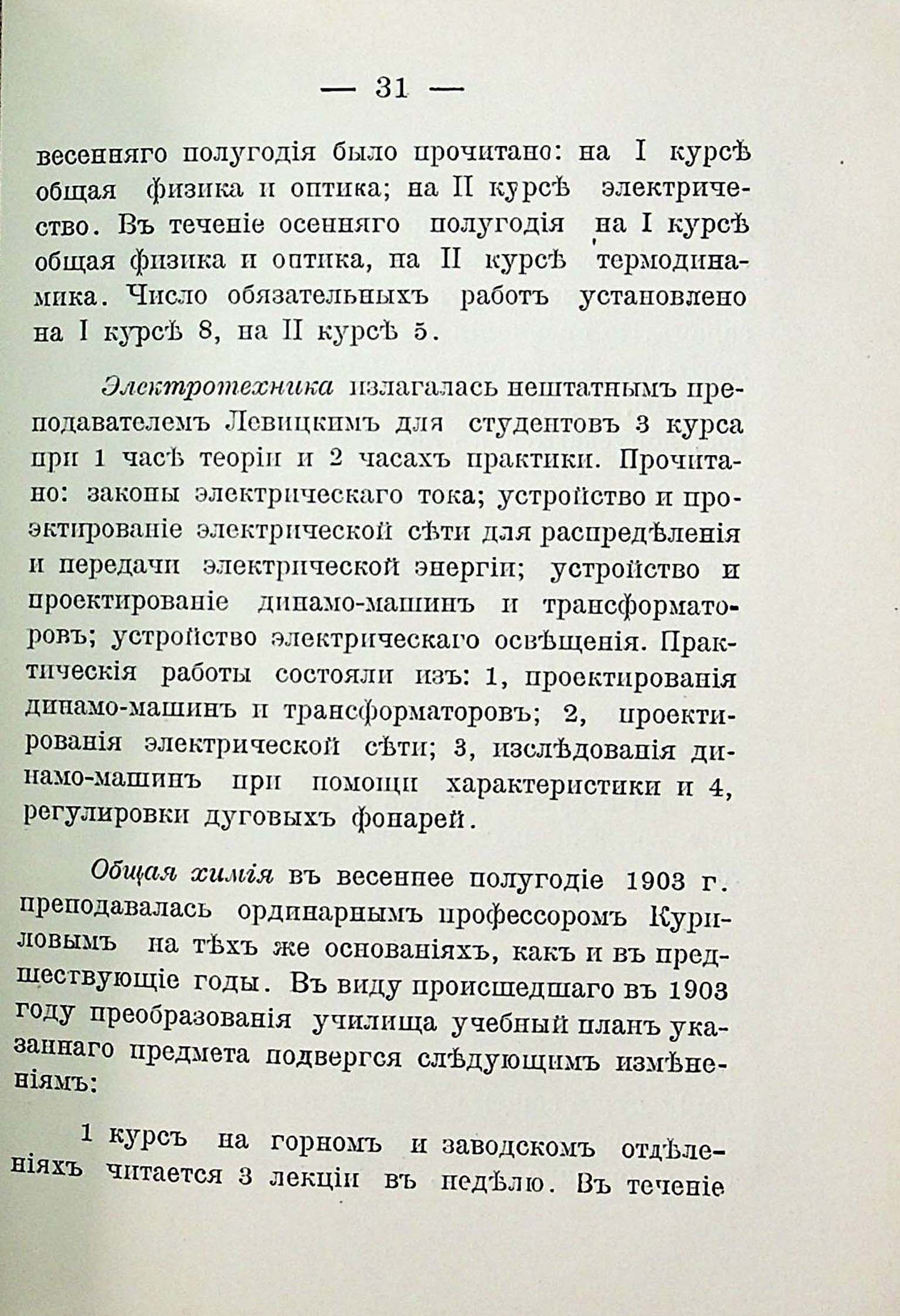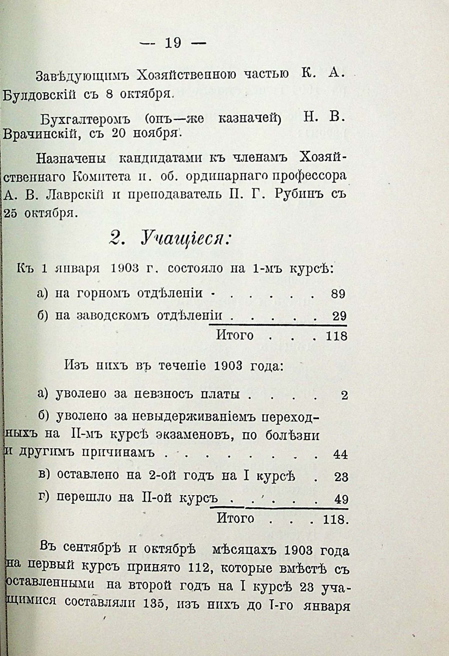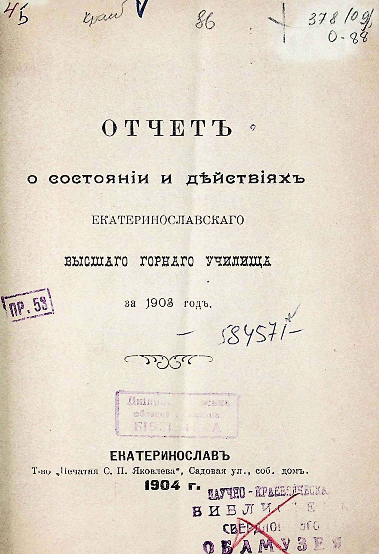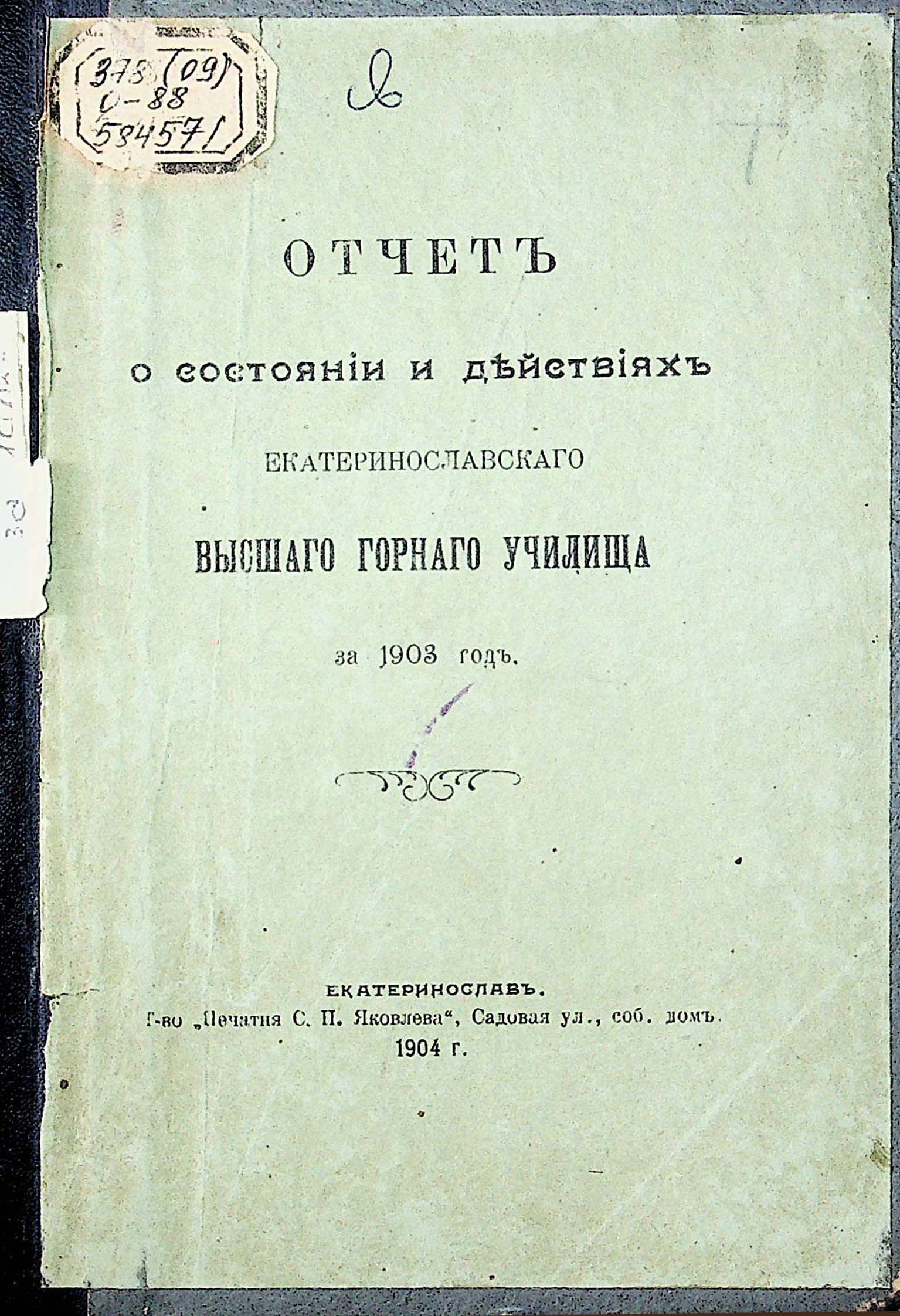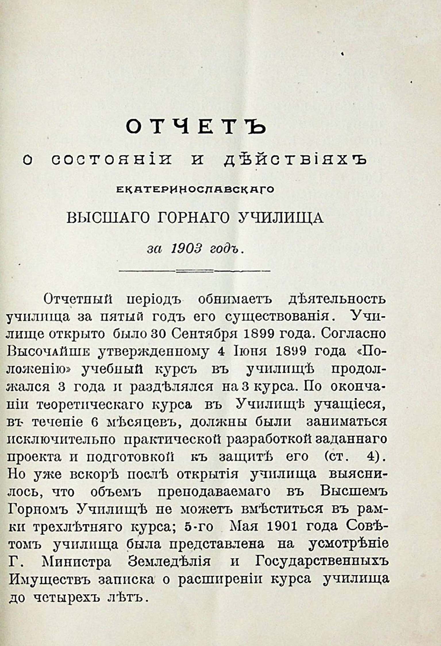 1. Отчетъ о состояніи и действіяхъ Екатеринославскаго Высшаго Горнаго Училища за 1903 годъ