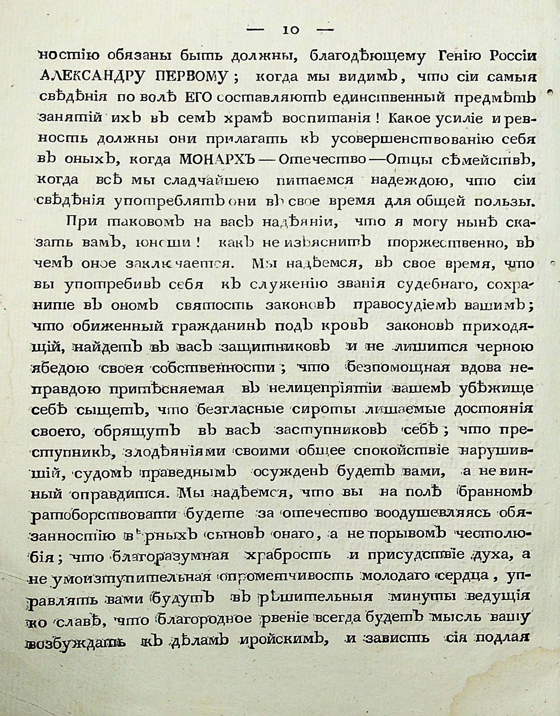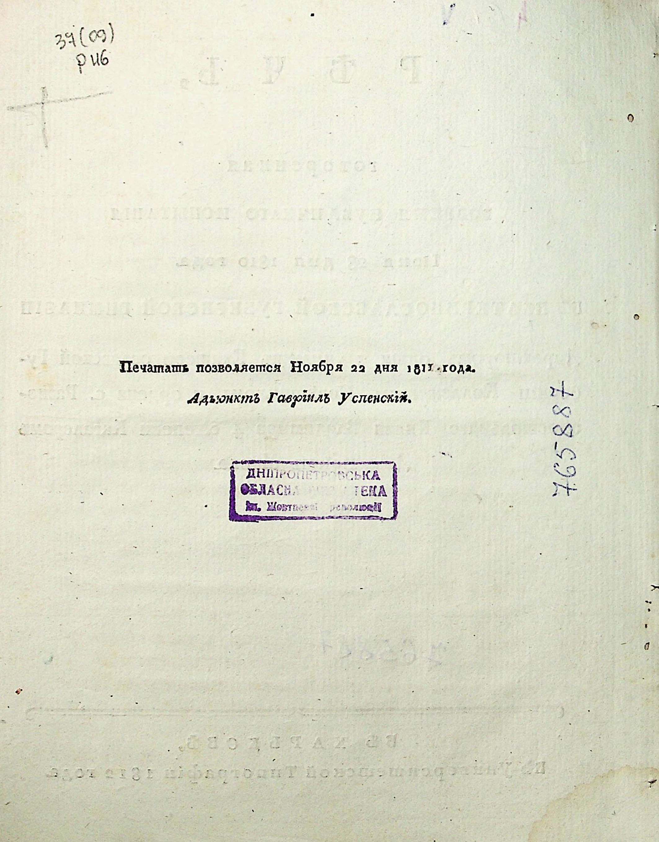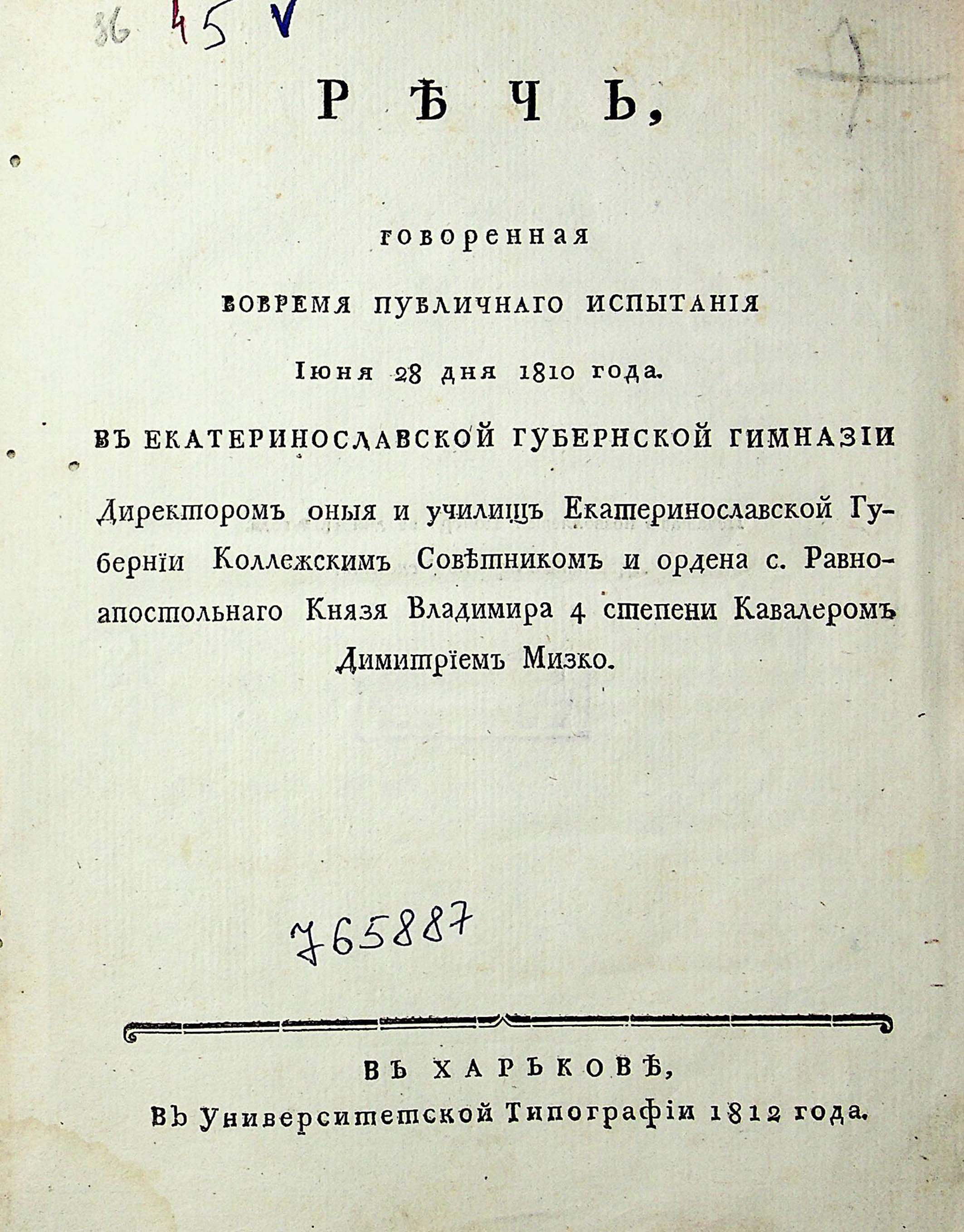 РЕЧЬ, говоренная воремя публичнаго испітанія Іюня 28 дня 1810 года. ВЪ ЕКАТЕРИНОСЛАВСКОЙ ГУБЕРНСКОЙ ГИМНАЗІИ Директоромъ оныя и училищъ Екатеринославской Губерніи Коллежскимъ Советникомъ и ордена с. Равно- апостольнаго Князя Владимира 4 степени Кавалеромъ Димитрїемъ Мизко