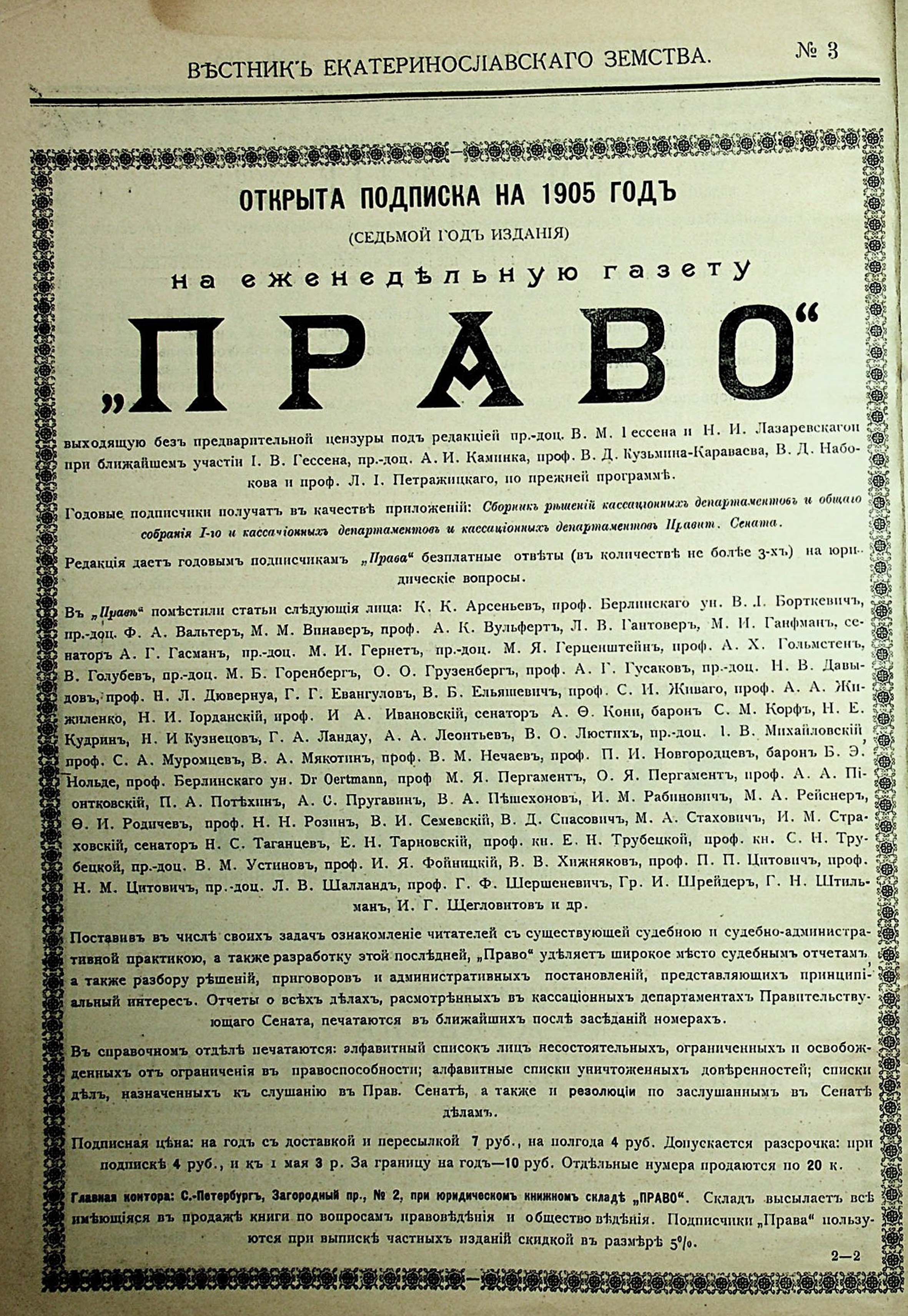 13. Вестникъ Екатеринославскаго земства. №3. 20 Января. 1905 годъ . Отделъ I. Законы и распоряженія Правительства