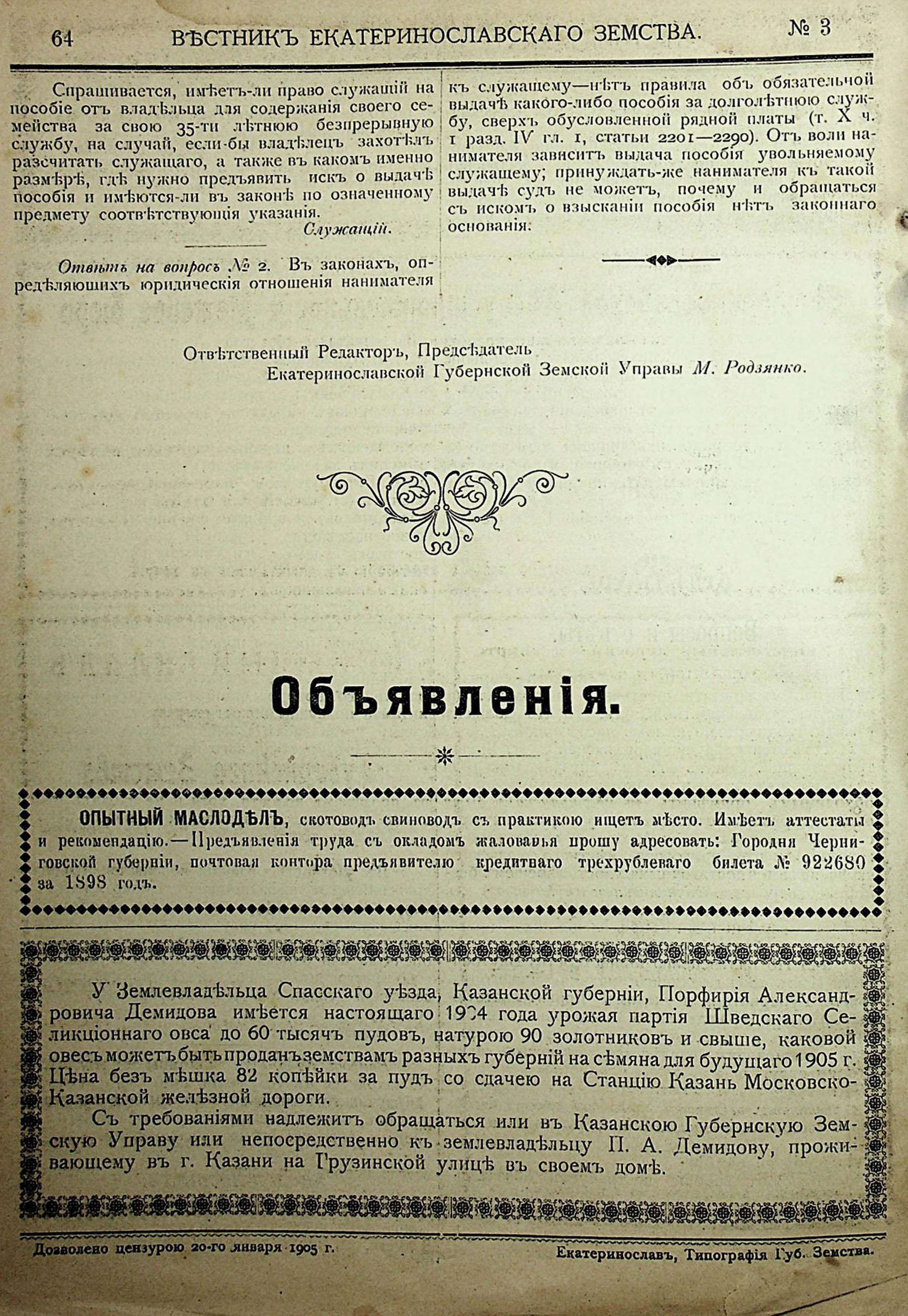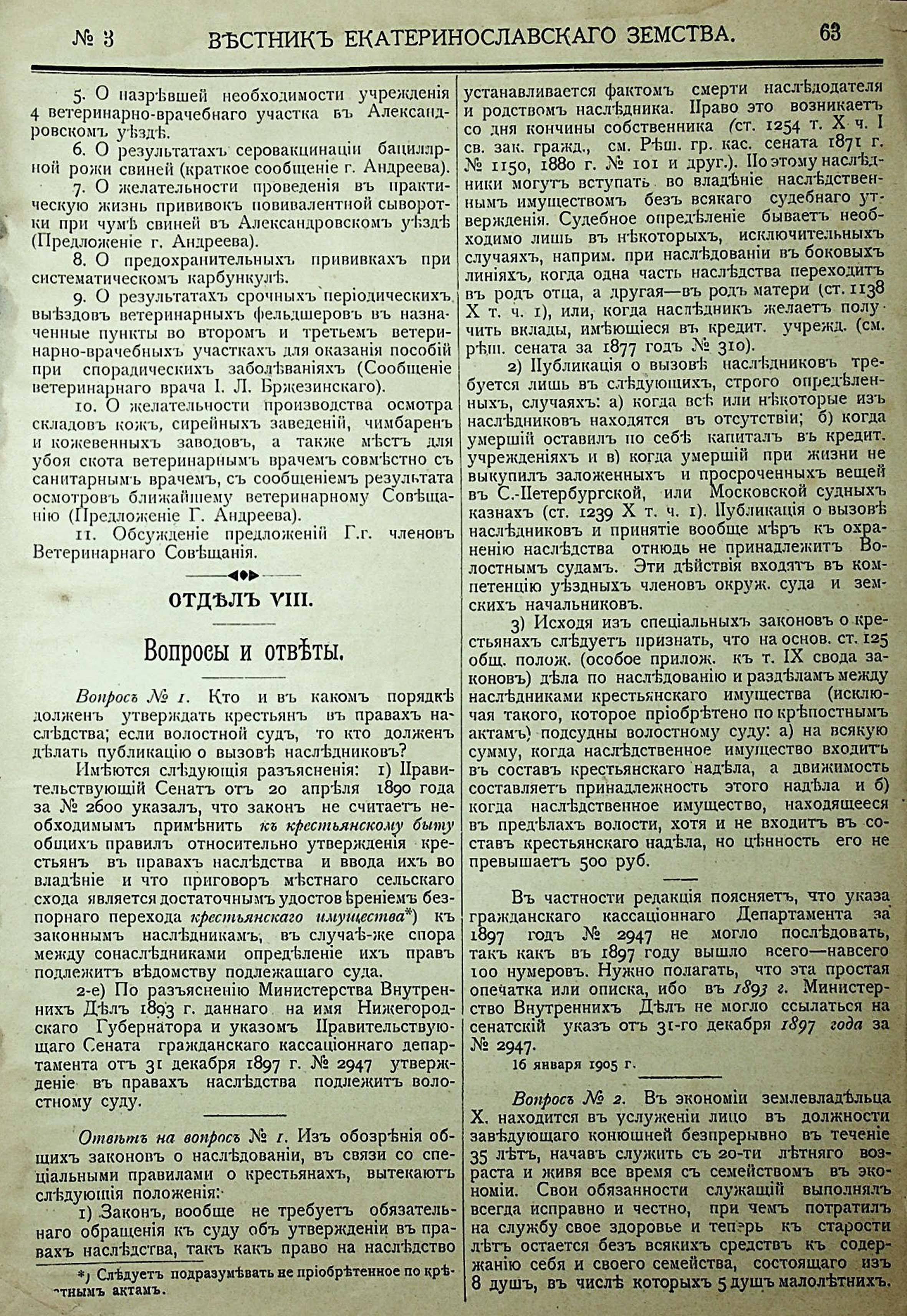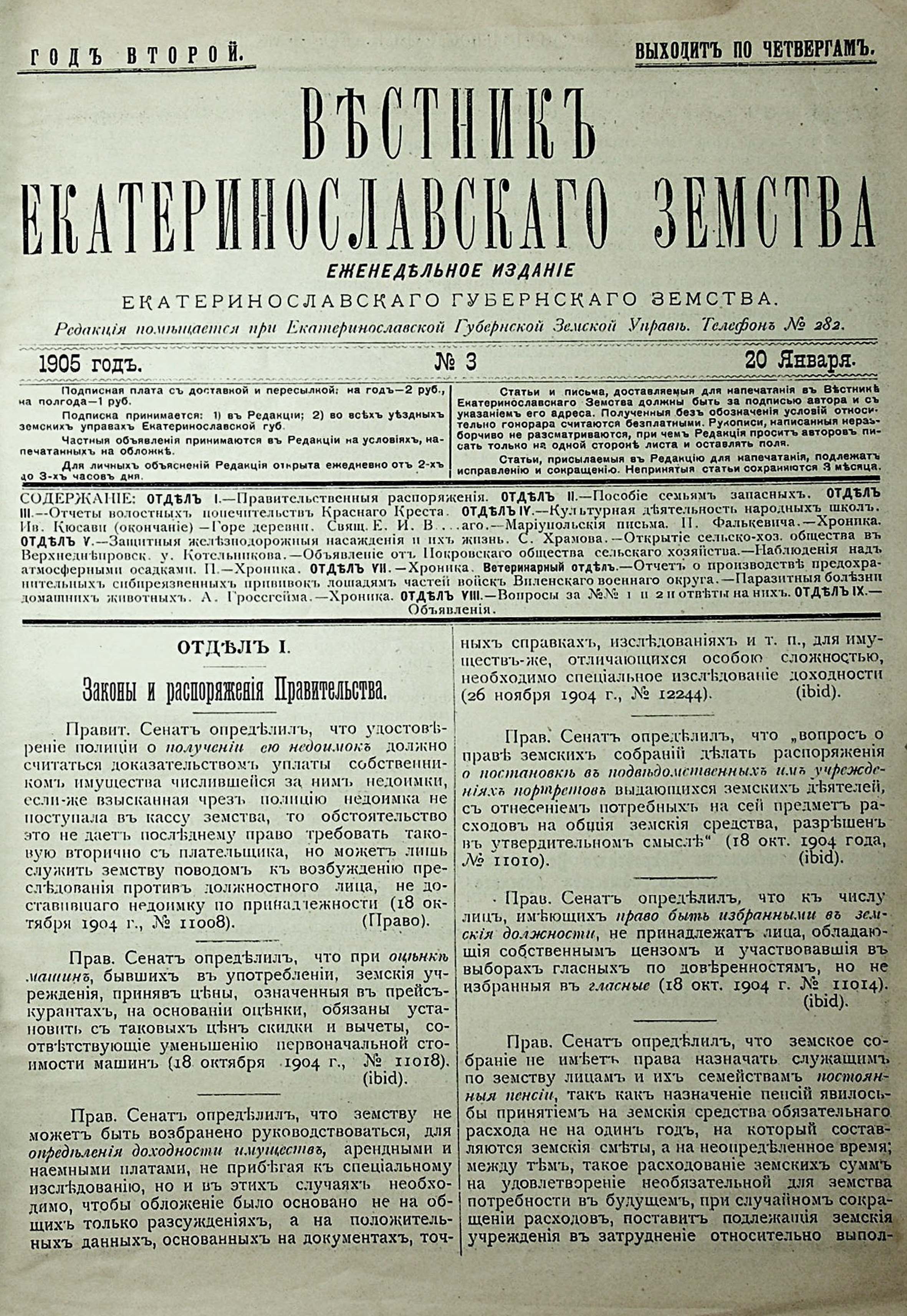 Вестникъ Екатеринославскаго земства. №3. 20 Января. 1905 годъ . Отделъ I. Законы и распоряженія Правительства