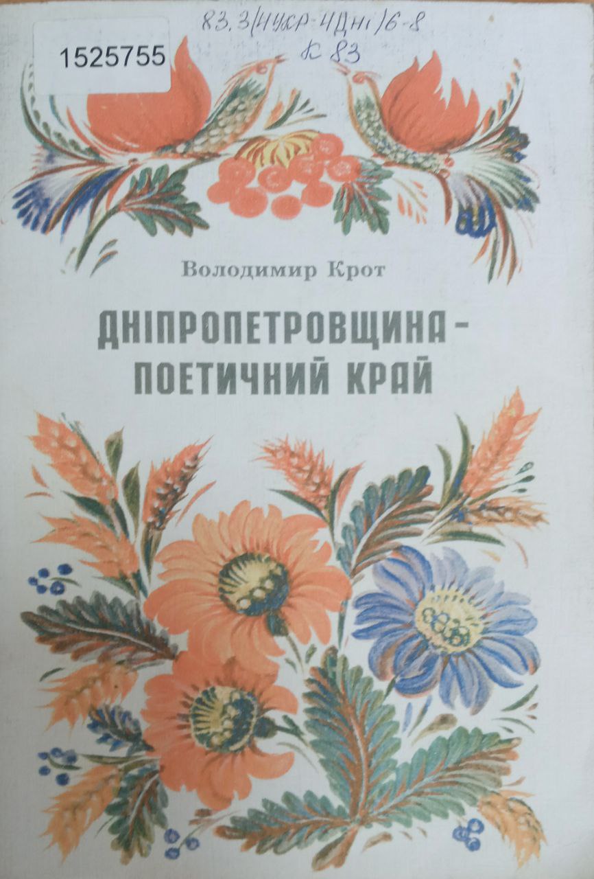 Шифр 83.3(4УКР-4ДНІ)6-/К 83-026308) Крот, Володимир Іванович. Дніпропетровщина - поетичний край / В. Крот. – Дніпропетровськ : Інновація, 2004. – 108 с. Книга "Дніпропетровщина — поетичний край" В. Крота, присвячена історії розвитку поезії на Придніпров'ї. Вона знайомить читачів із життям та творчістю відомих поетів регіону, а також із їхніми творами. Видання корисне для всіх, хто цікавиться місцевою літературою та поезією. |