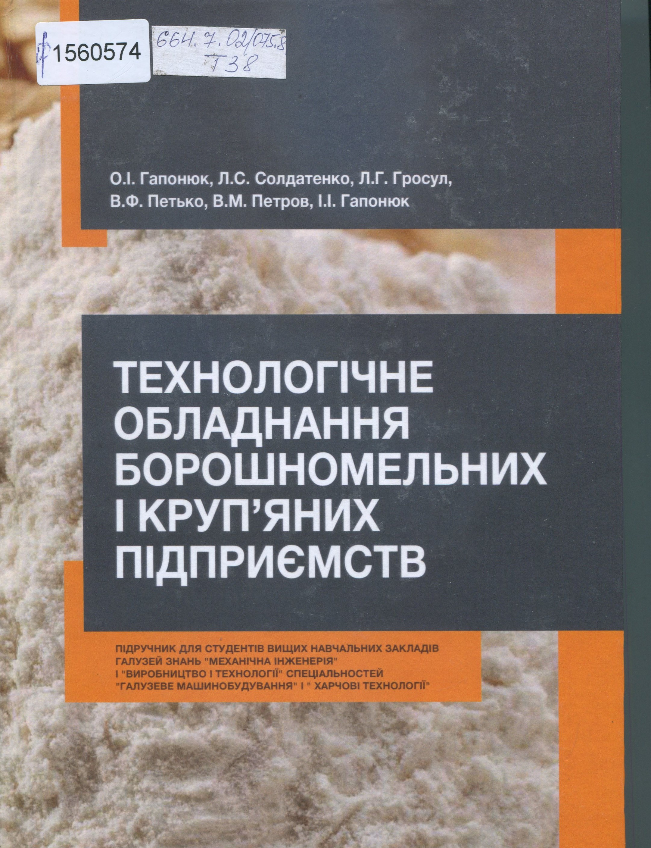 664.7.02/075.8 Т 38 Ф1560574 Технологічне обладнання борошномельних і крупяних підприємств: підручник / О.І. Гапанюк, Л.С. Солдатенко, Л.Г. Гросул,- Херсон: Олді-плюс, 2018.- 752 с. В підручнику розглянуто технологічне обладнання борошномельних і круп'яних підприємств у послідовності, передбаченій навчальною програмою курса "Технологічне обладнання галузі" Наведені призначення, області застосування, класифікація, принцип дії, теоретичні основи робочого принципу, методики технологічних, кінематичних, силових і інших розрахунків, а також особливості конструкції, експлуатації і обслуговування обладнання. |