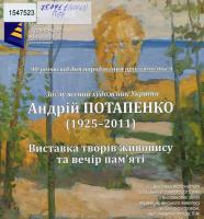 Заслужений художник України Андрій Потапенко (1925-2011) [Текст] : виставка творів живопису та вечір пам'яті: альбом вибраних творів / Музей укр. живопису; упоряд. С. М. Несмачний. - Б. м. : Арт-пресс, 2015. - 8 с. : кольор. іл.